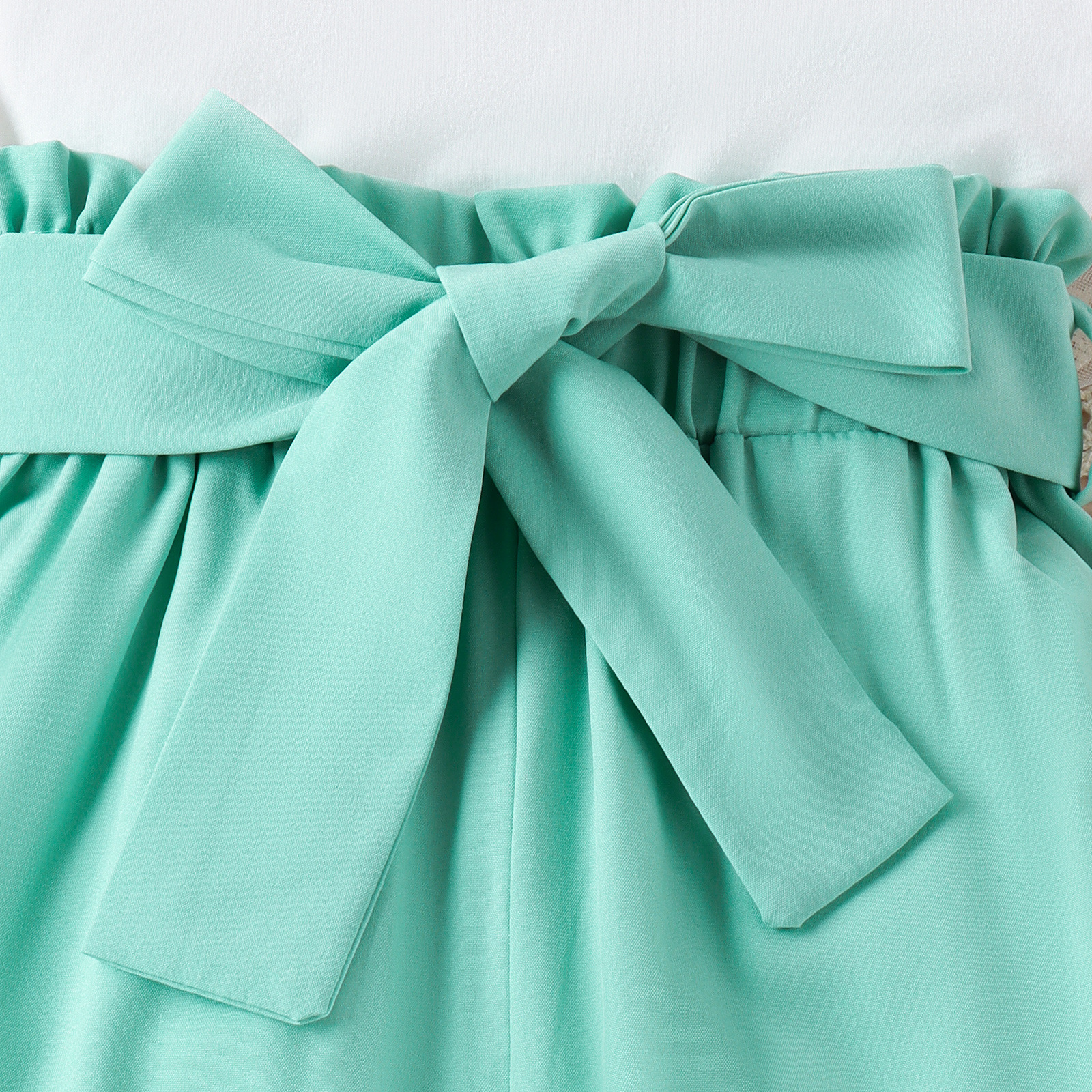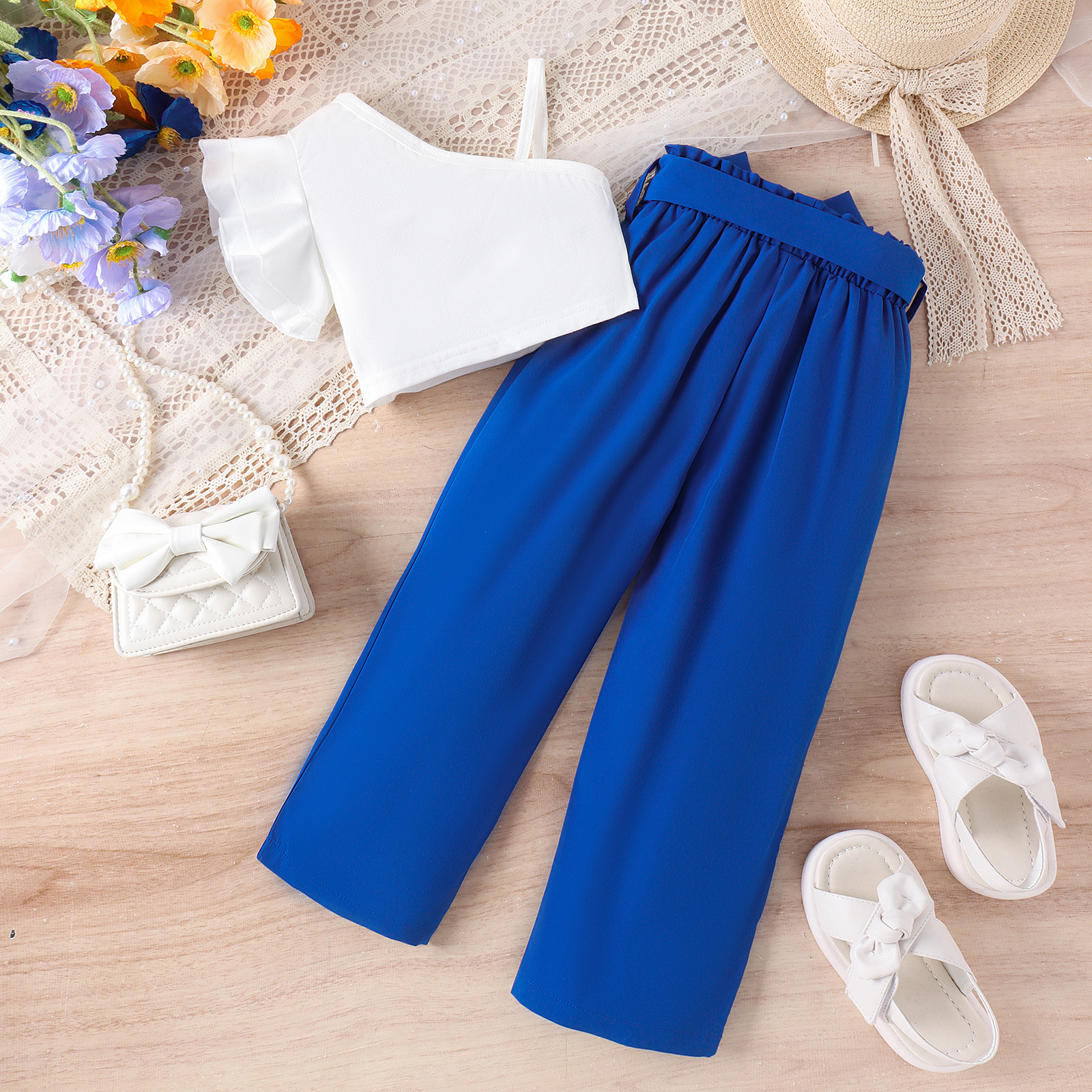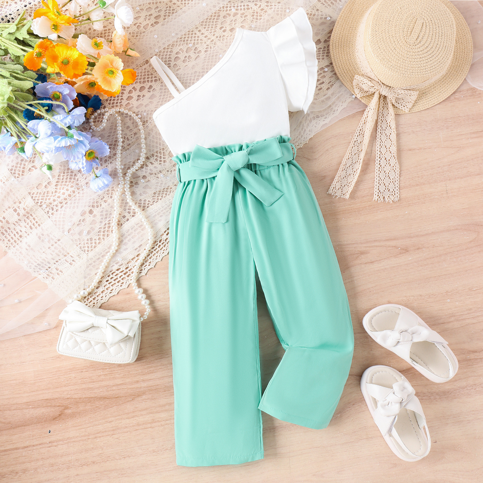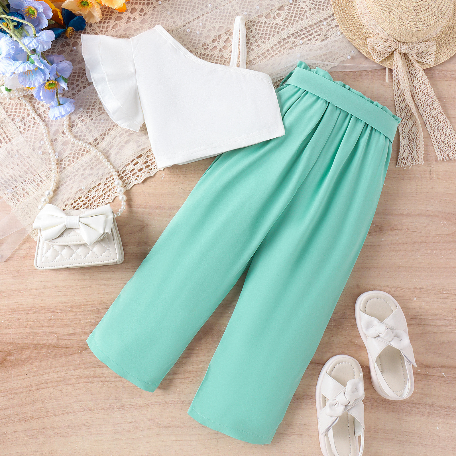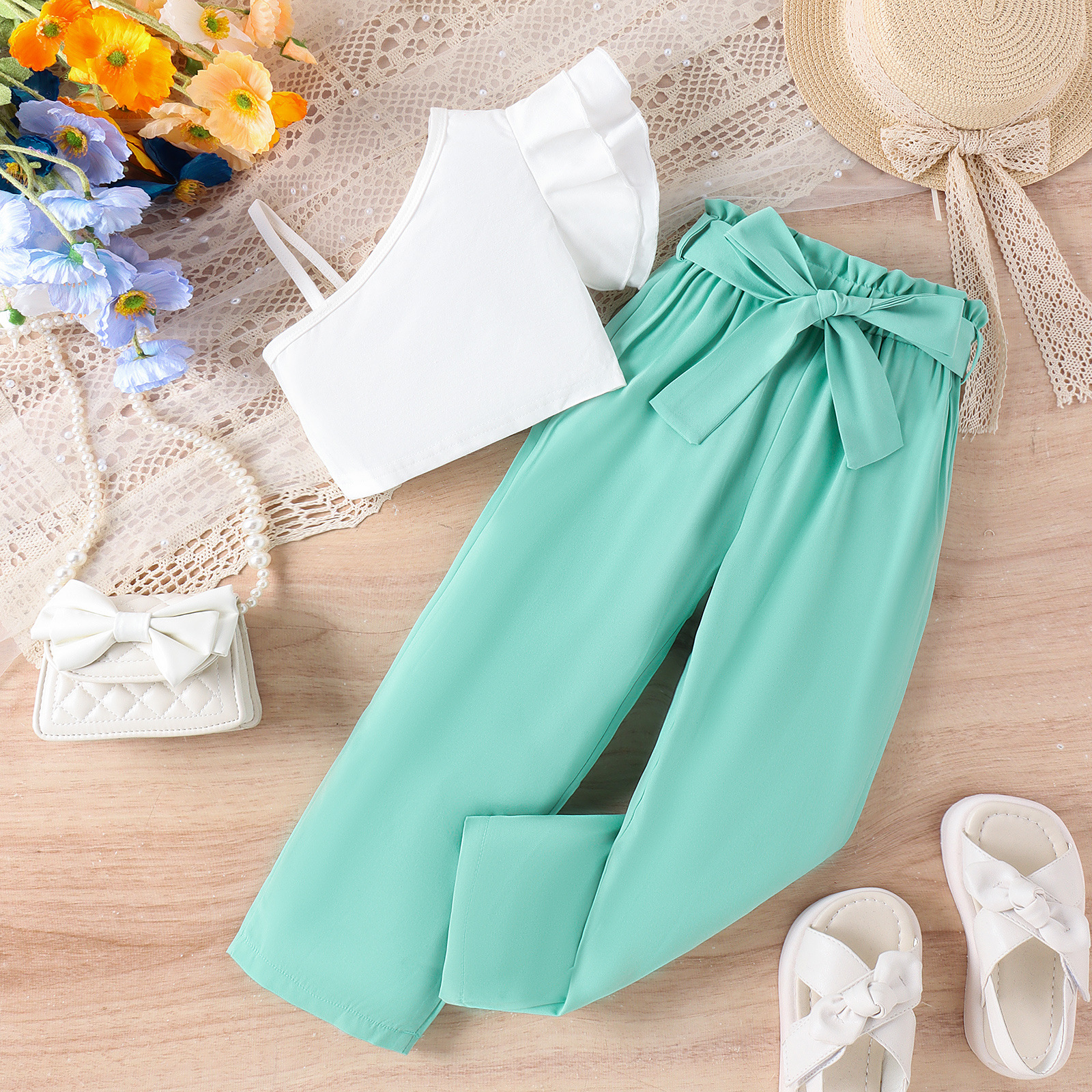 Baopin 아동복 유럽과 미국의 봄과 여름 여러 가지 빛깔의 어깨 스트랩 싱글 사이드 레이스 탑 솔리드 컬러 벨트 바지 유행 스타일 세트스토어 가기