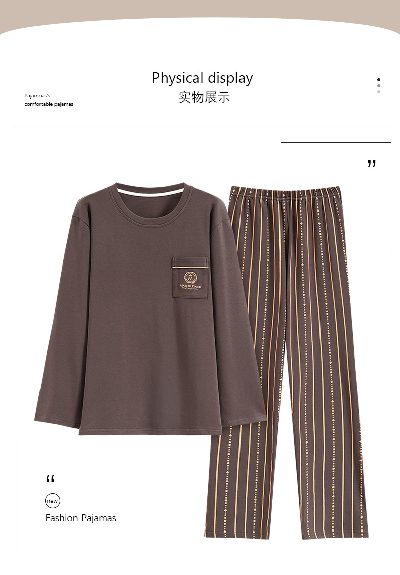 100% 면화 잠옷 남성용 봄과 가을 긴팔 바지 남성용 단순 풀오버 홈웨어 세트 외부에서 입을 수 있습니다.스토어 가기