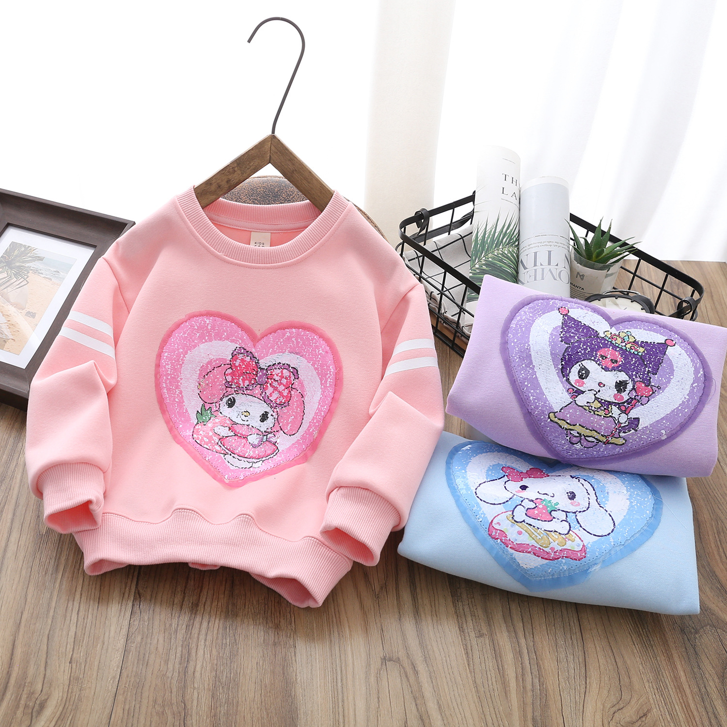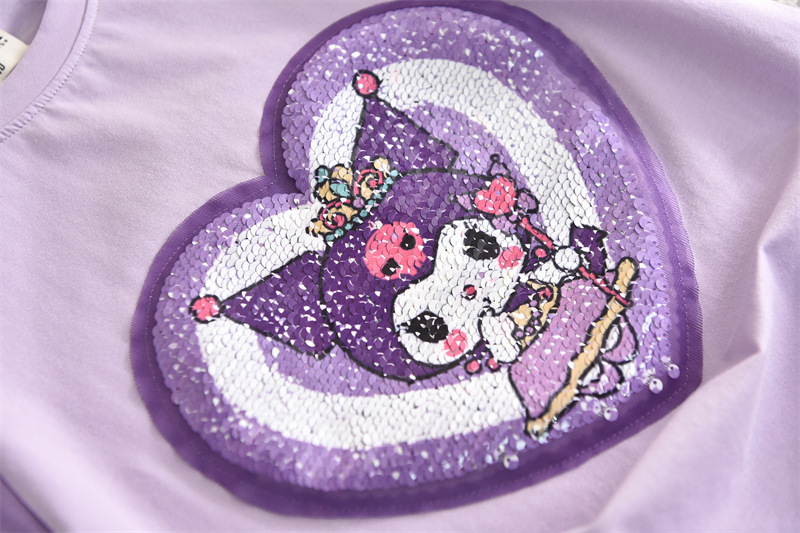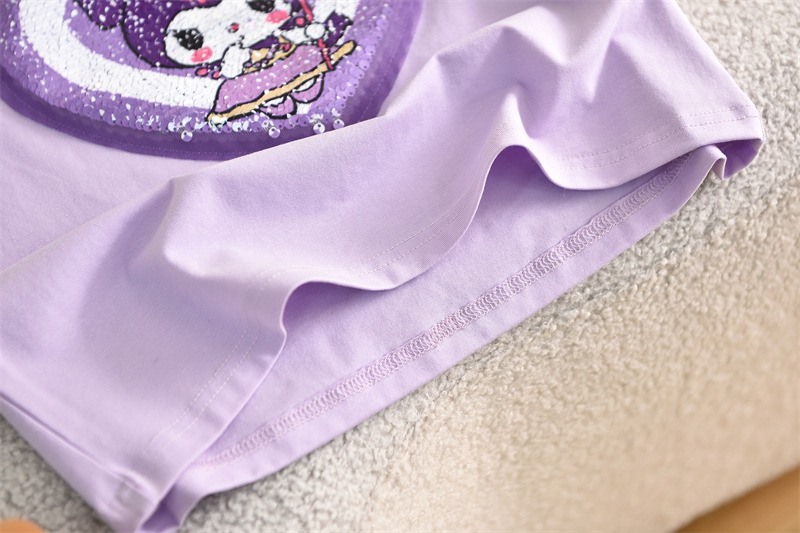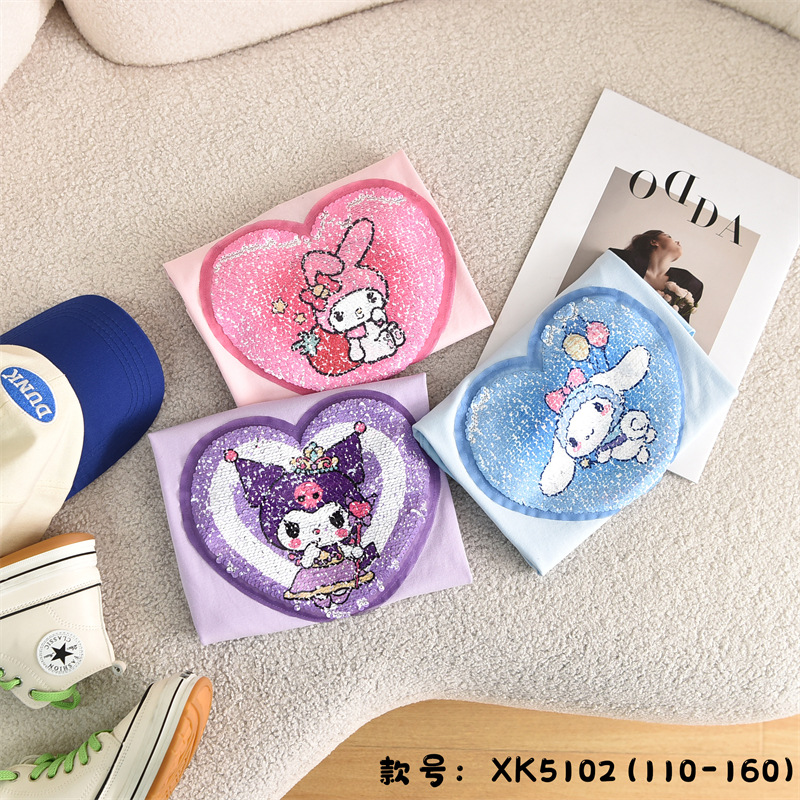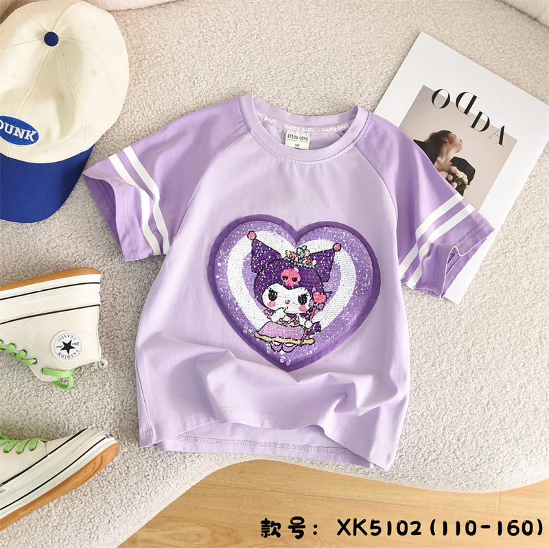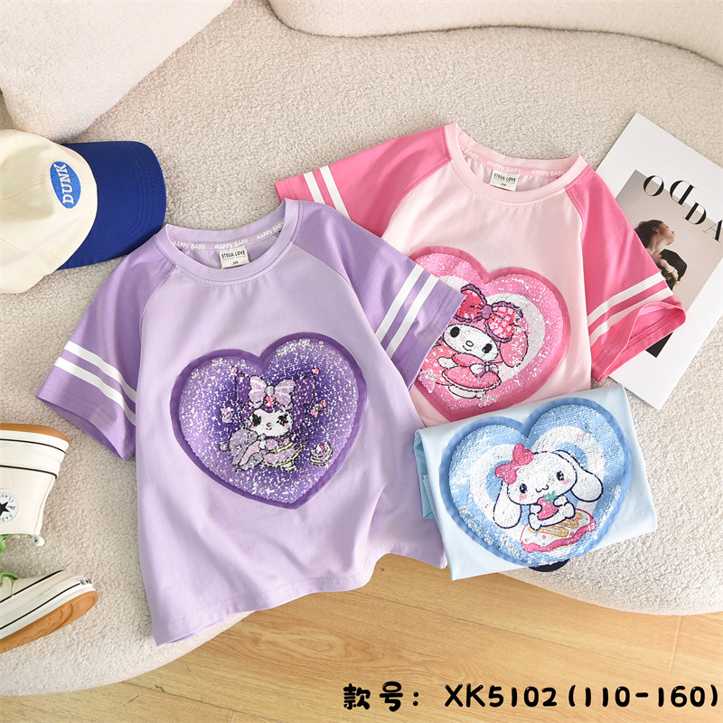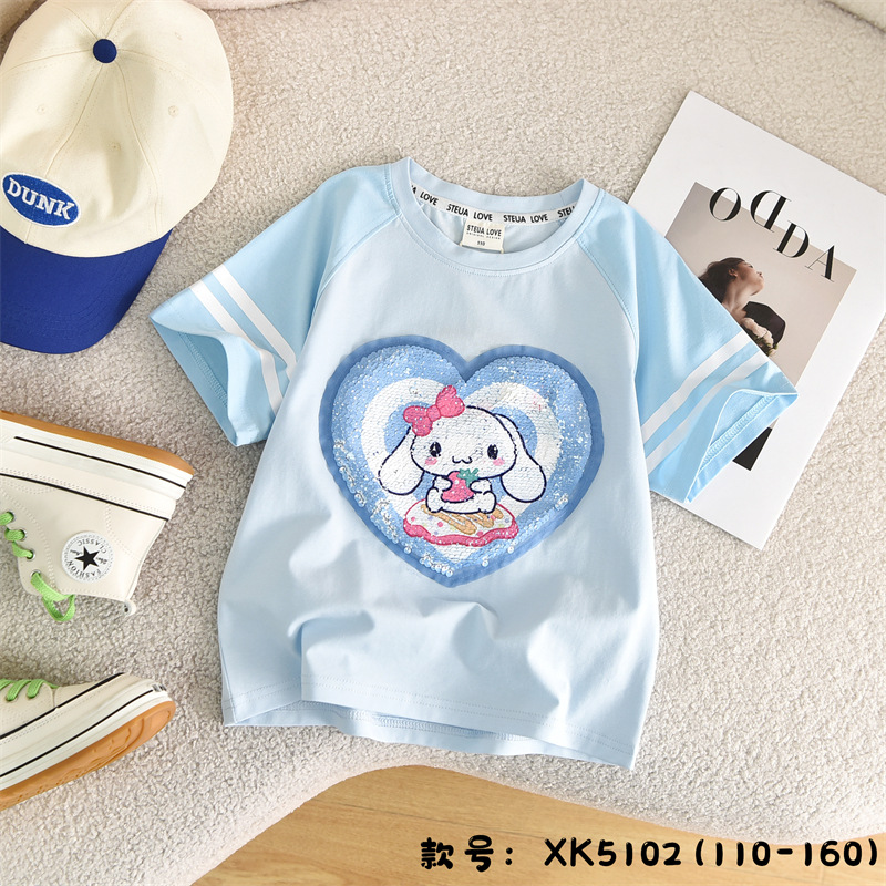 2024 년 여름 새 여자 티셔츠 만화 사랑 얼굴을 바꾸는 아이들의 니트 코튼 티셔츠 둥근 목 반소매 탑