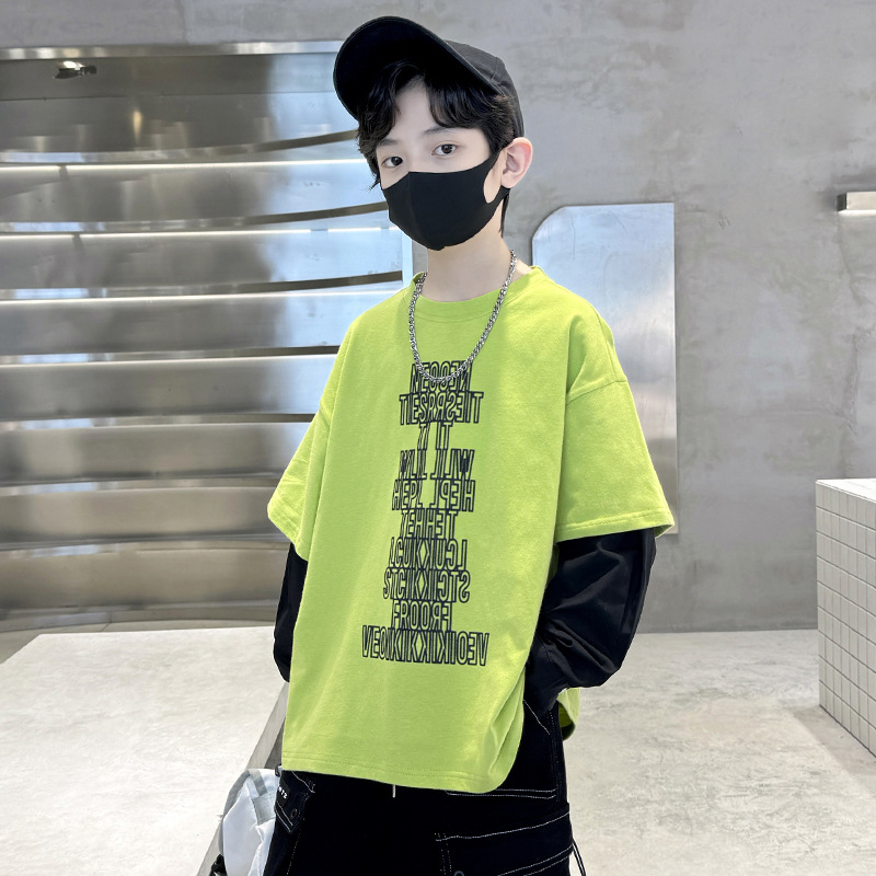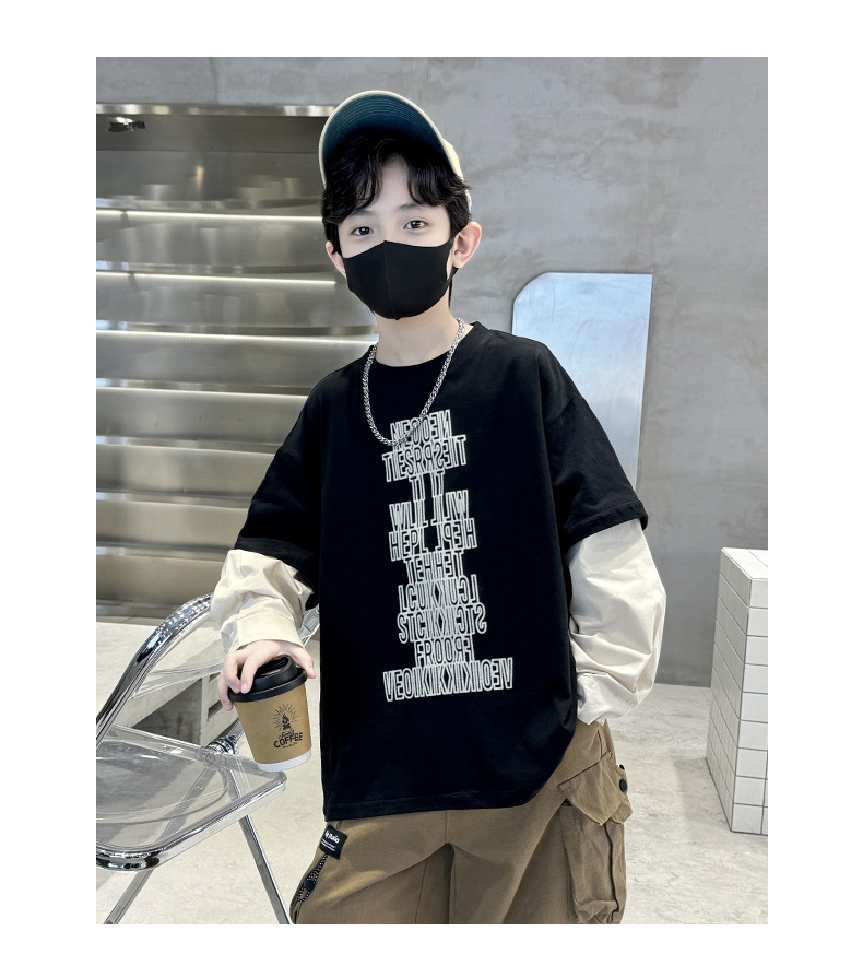 봄 소년 스웨터 새 아동복 어린이 빅 보이 편지 얇은 스웨터 탑 가짜 투피스 긴팔 티셔츠스토어 가기