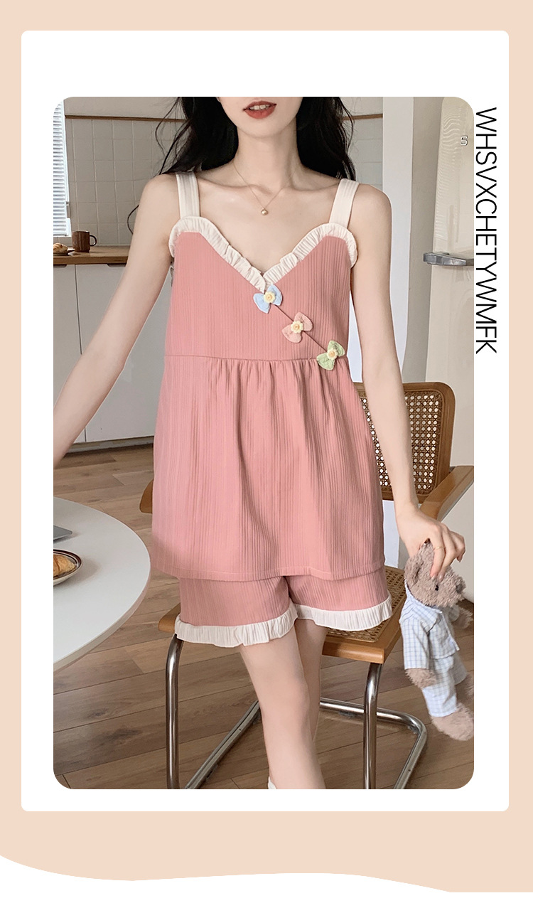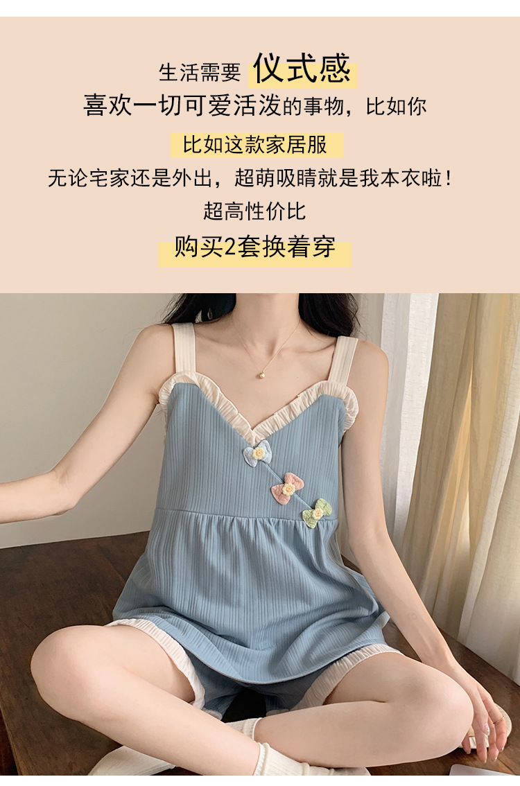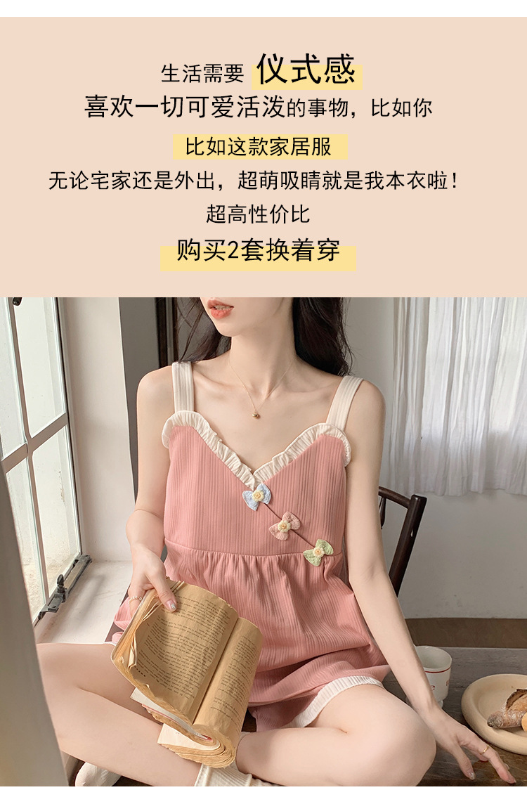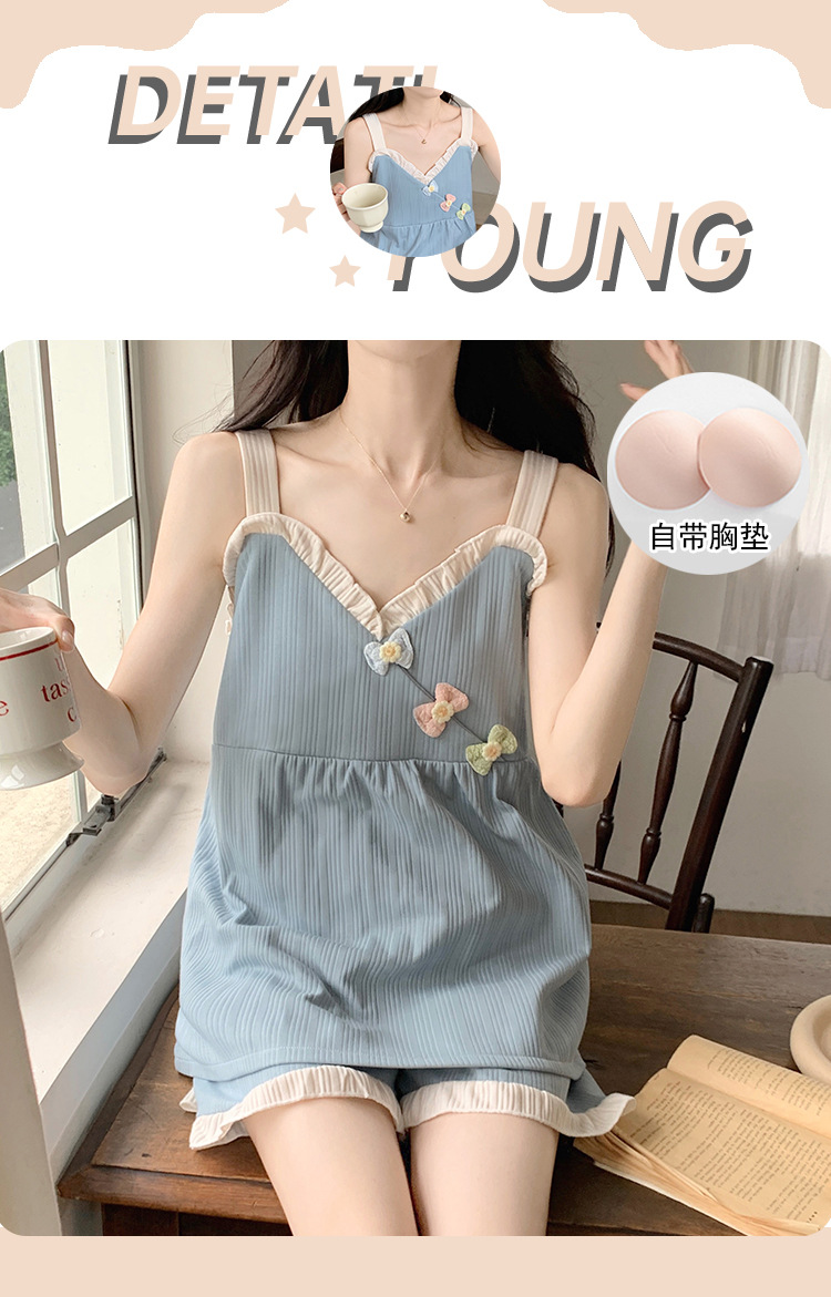 2024 새로운 여름 잠옷 여성 여름 서스펜더 반바지 가슴 패드 홈 웨어 세트 공장 도매스토어 가기