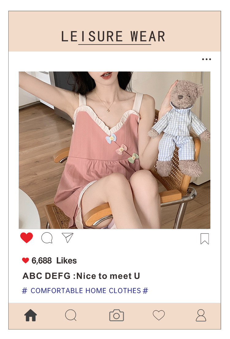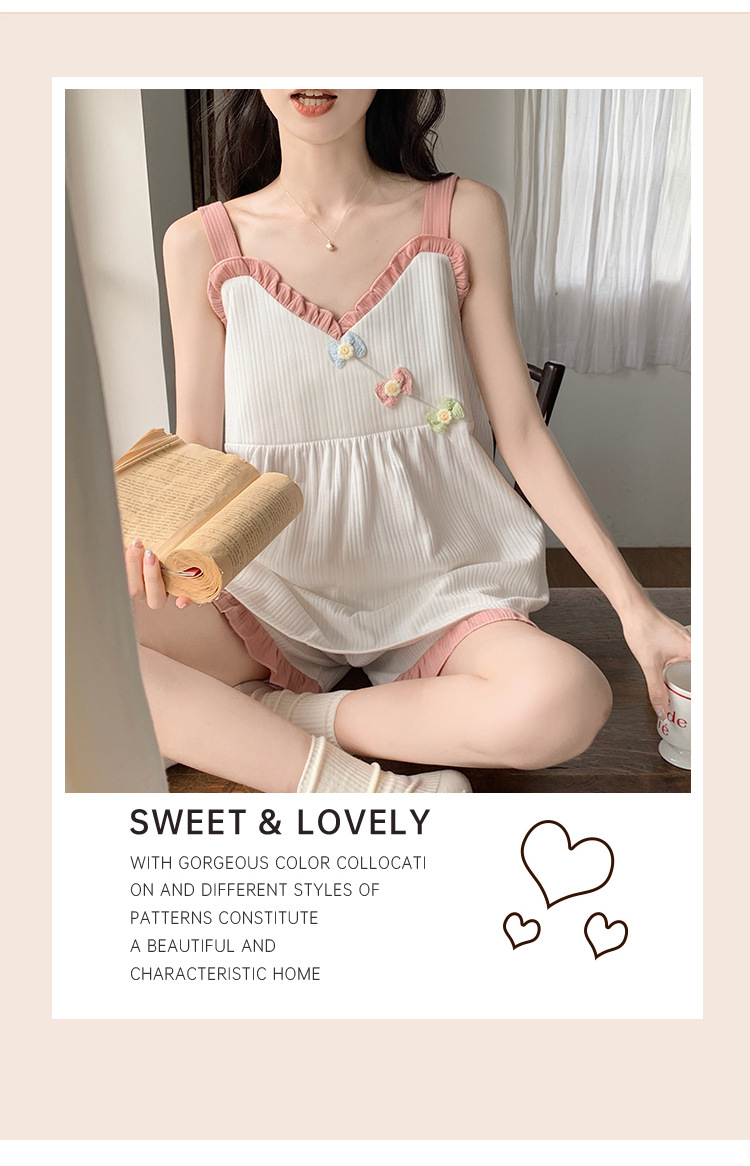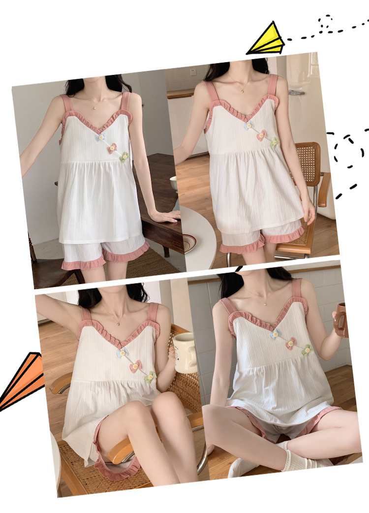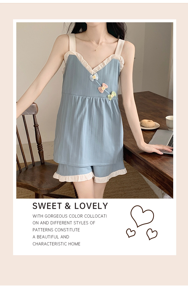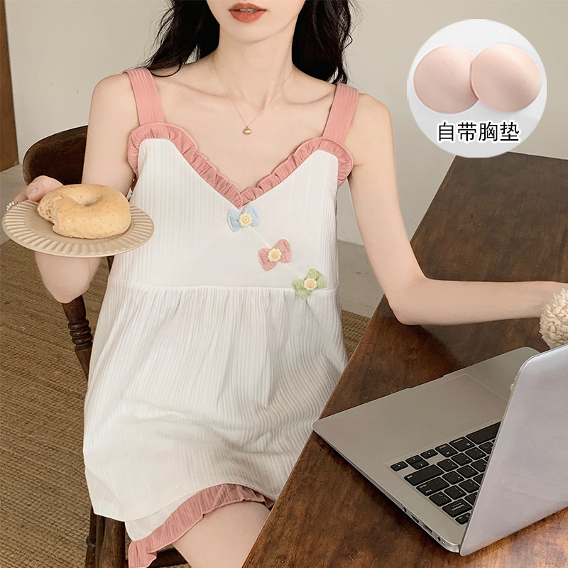 2024 새로운 여름 잠옷 여성 여름 서스펜더 반바지 가슴 패드 홈 웨어 세트 공장 도매스토어 가기