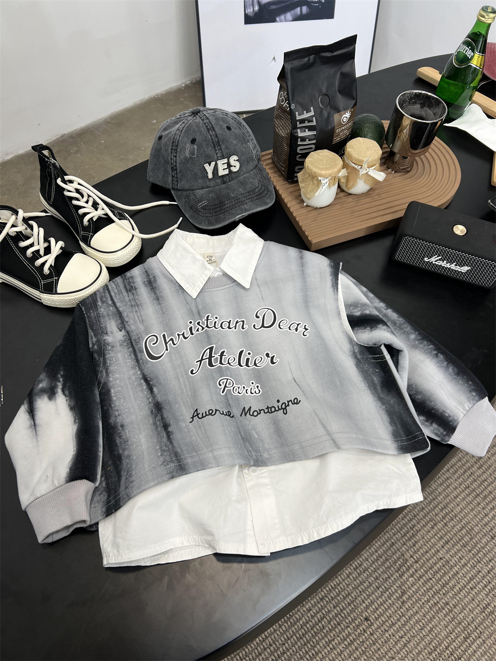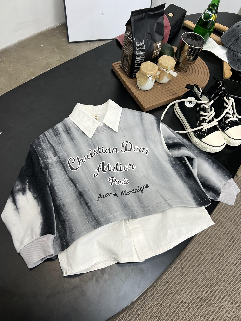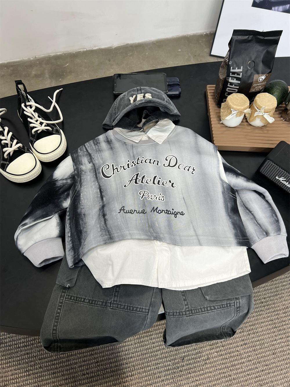 2024 봄 어린이 넥타이 염색 셔츠 스웨터 진짜 투피스 소년의 트렌디 한 멋진 잉크 인쇄 및 염색 셔츠 스티칭 세트스토어 가기