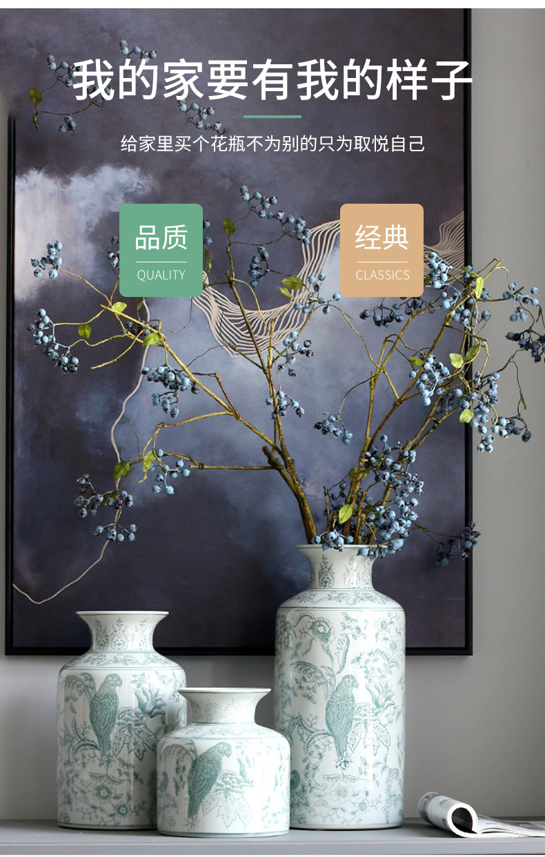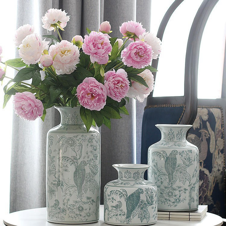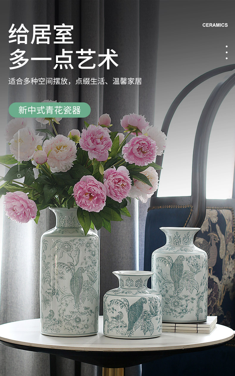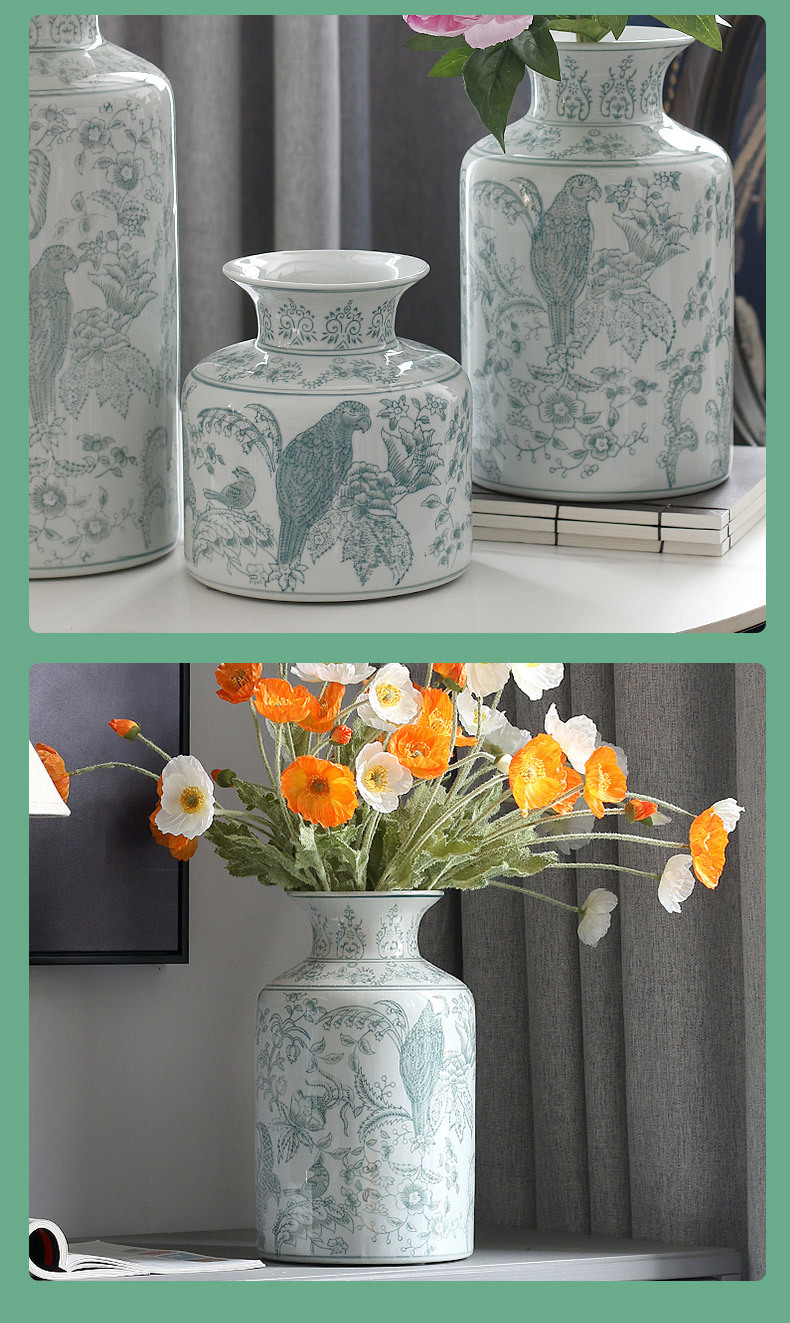 새로운 중국 스타일 파란색과 흰색 도자기 꽃병, 고급 앵무새 꽃 패턴 중국 스타일 Jingdezhen 세라믹 거실 꽃꽂이 꽃병스토어 가기