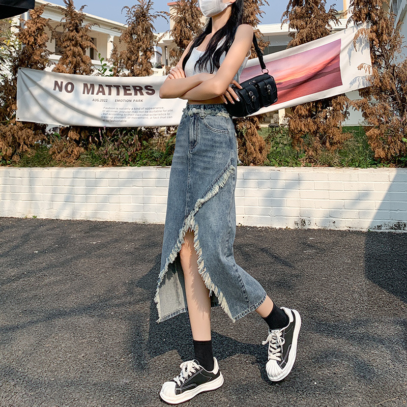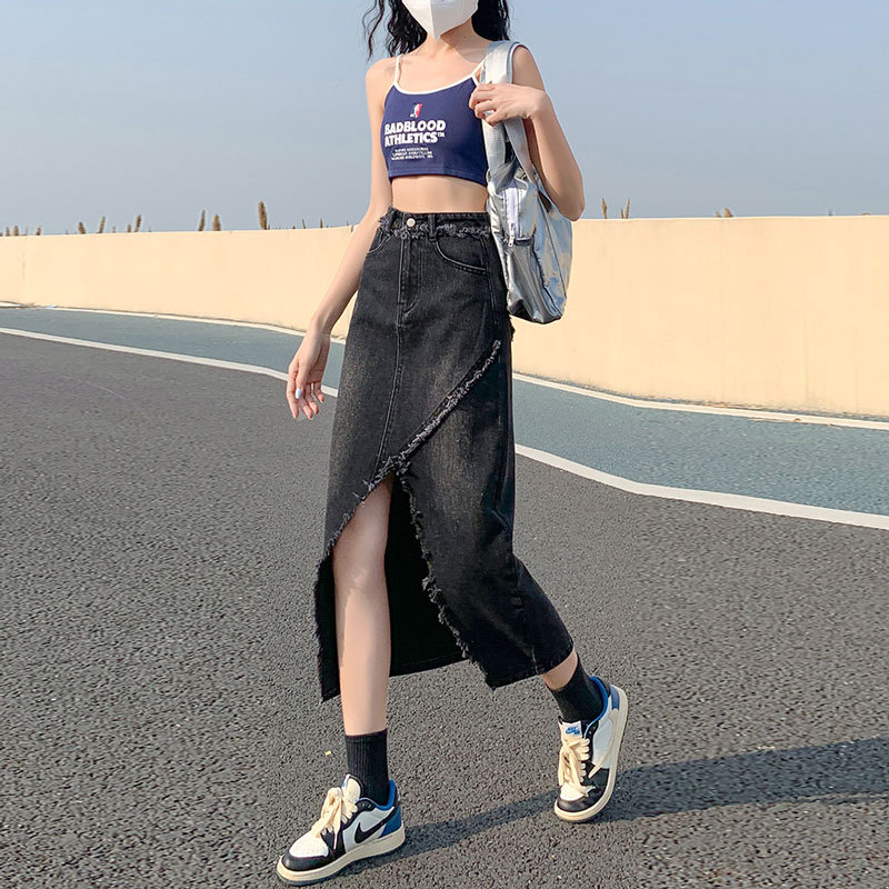 트렌디 한 불규칙한 중간 길이 검은 색 회색 봄과 가을 A 라인 스커트 엉덩이 스커트에 여성을위한 높은 허리 스플릿 데님 스커트스토어 가기