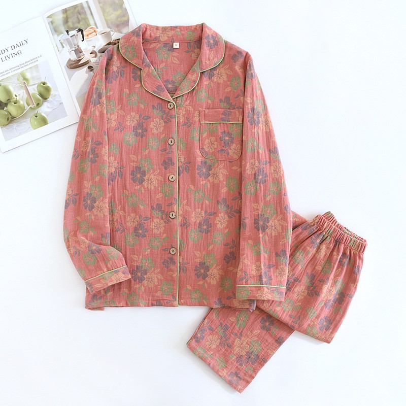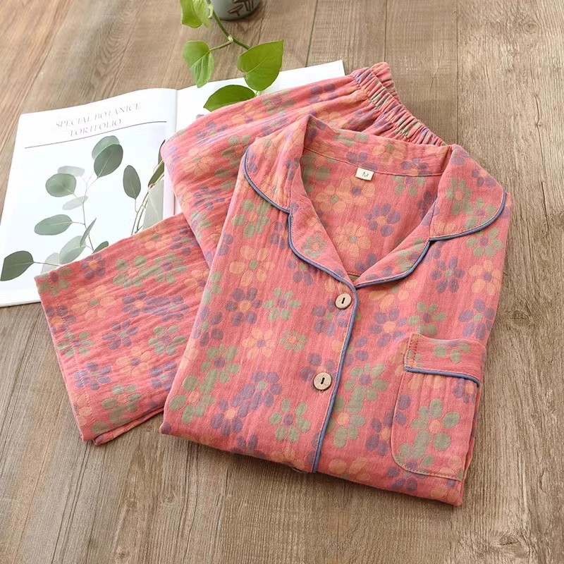 봄과 여름 면 더블 거즈 파자마 여성용 긴팔 바지 카디건 원사 염색 빈티지 자카드 스테레오 자수 슈퍼