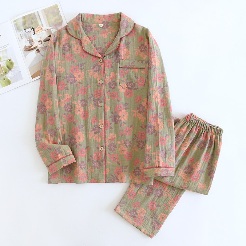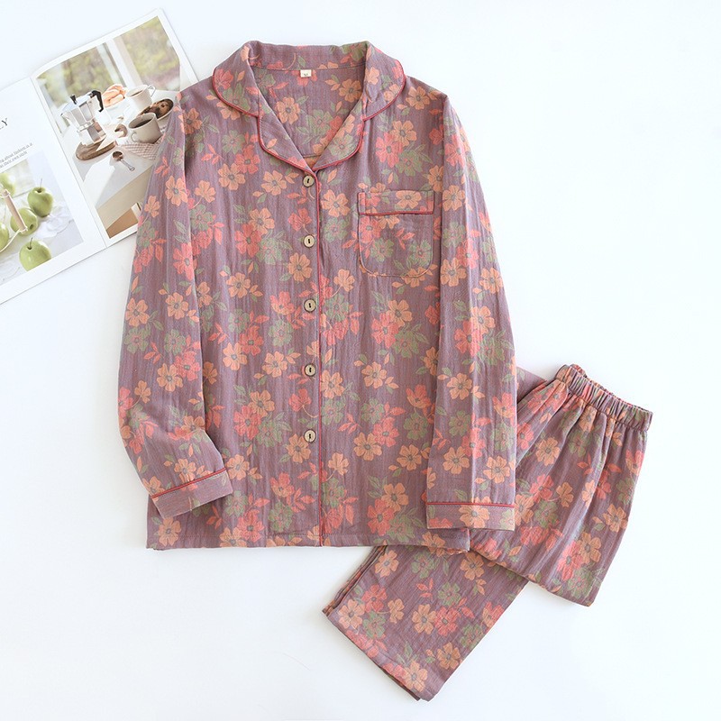 봄과 여름 면 더블 거즈 파자마 여성용 긴팔 바지 카디건 원사 염색 빈티지 자카드 스테레오 자수 슈퍼스토어 가기