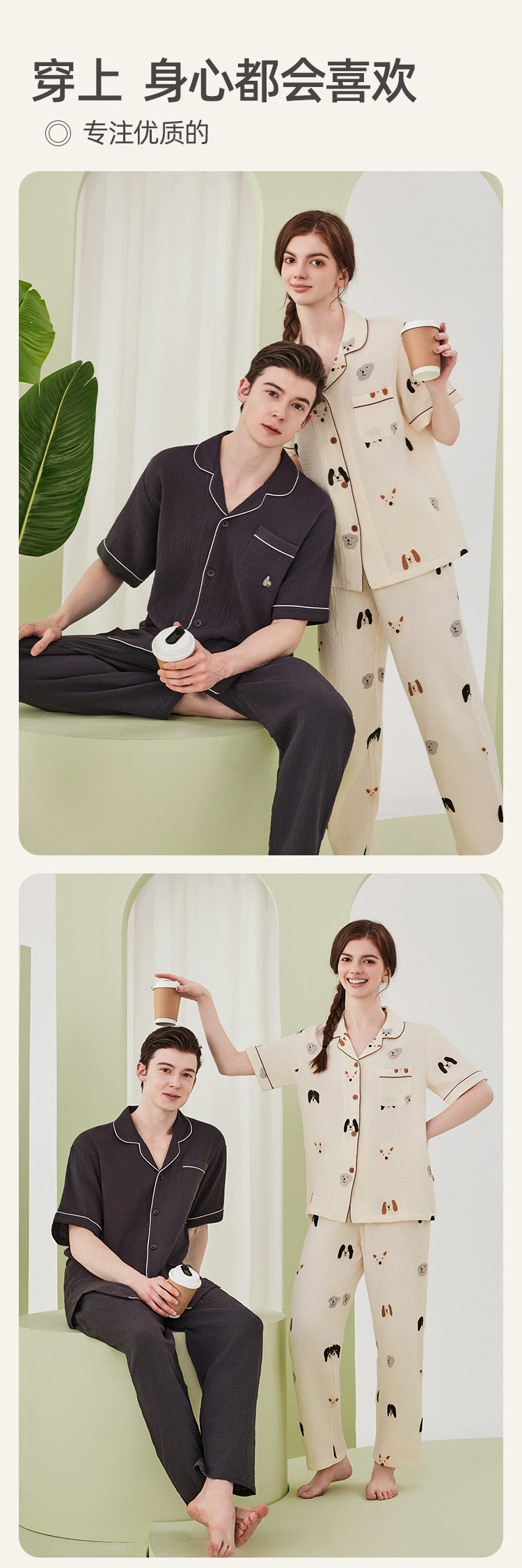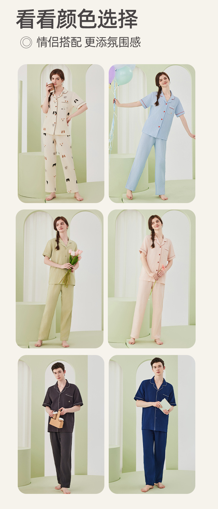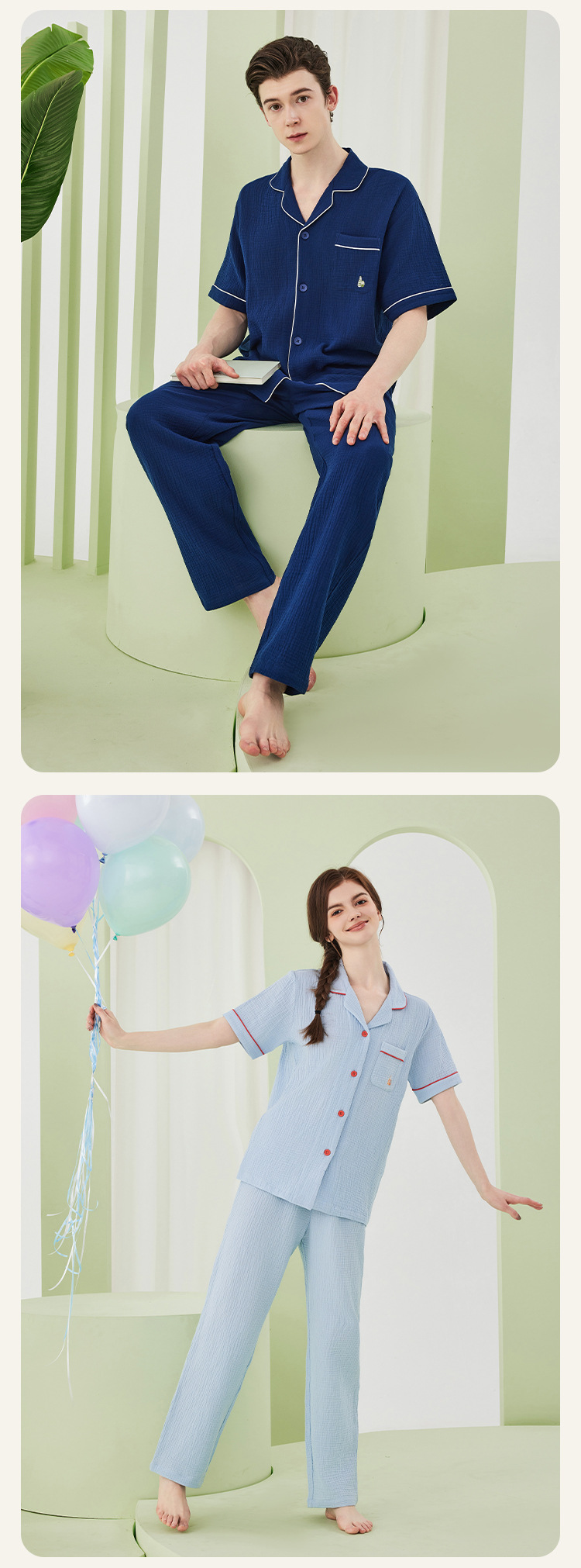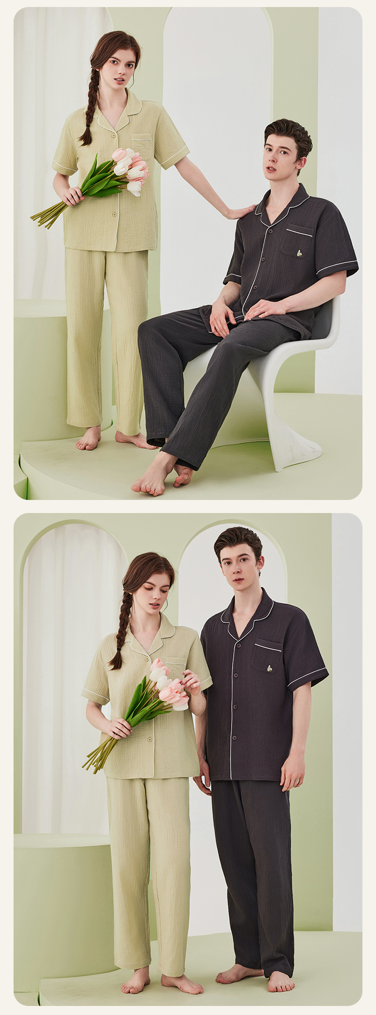 더블 레이어 실 크레이프 커플 파자마 여성면 여름 반팔 바지 세트 커플 홈 웨어 밖에서 입을 수 있습니다.스토어 가기