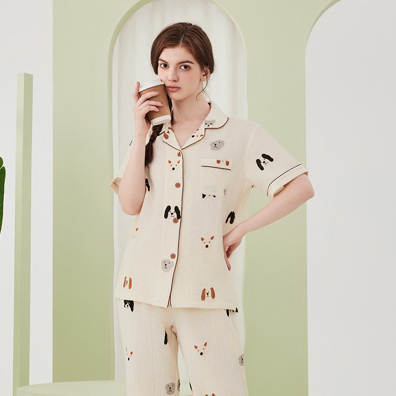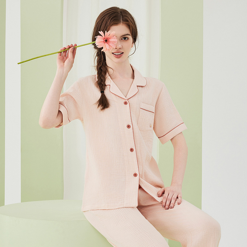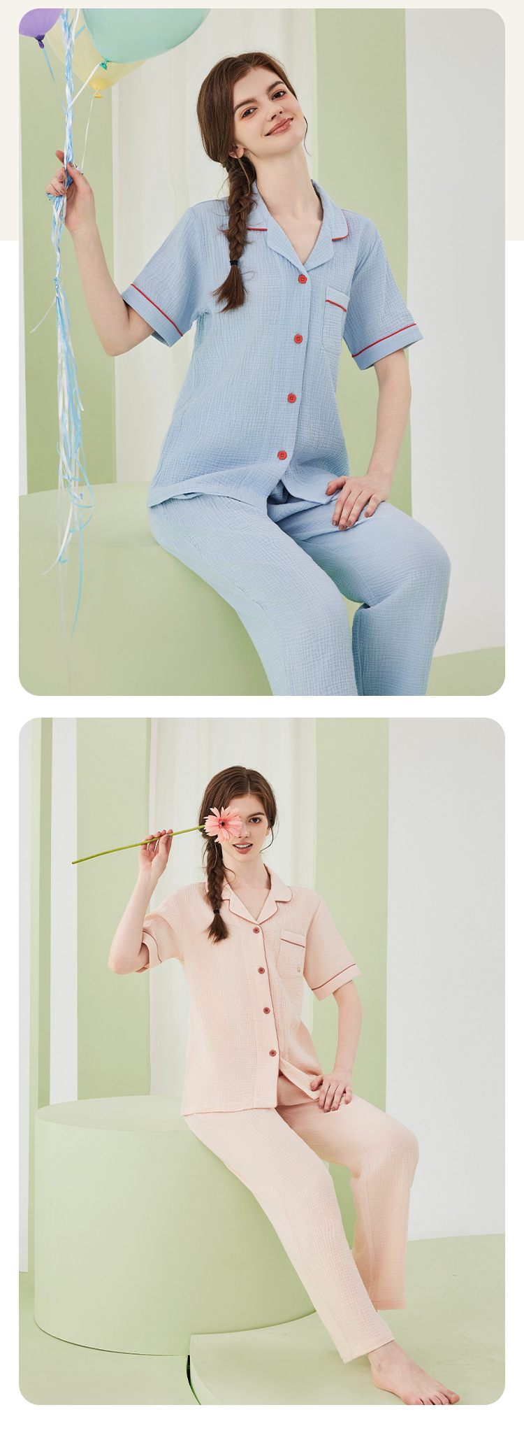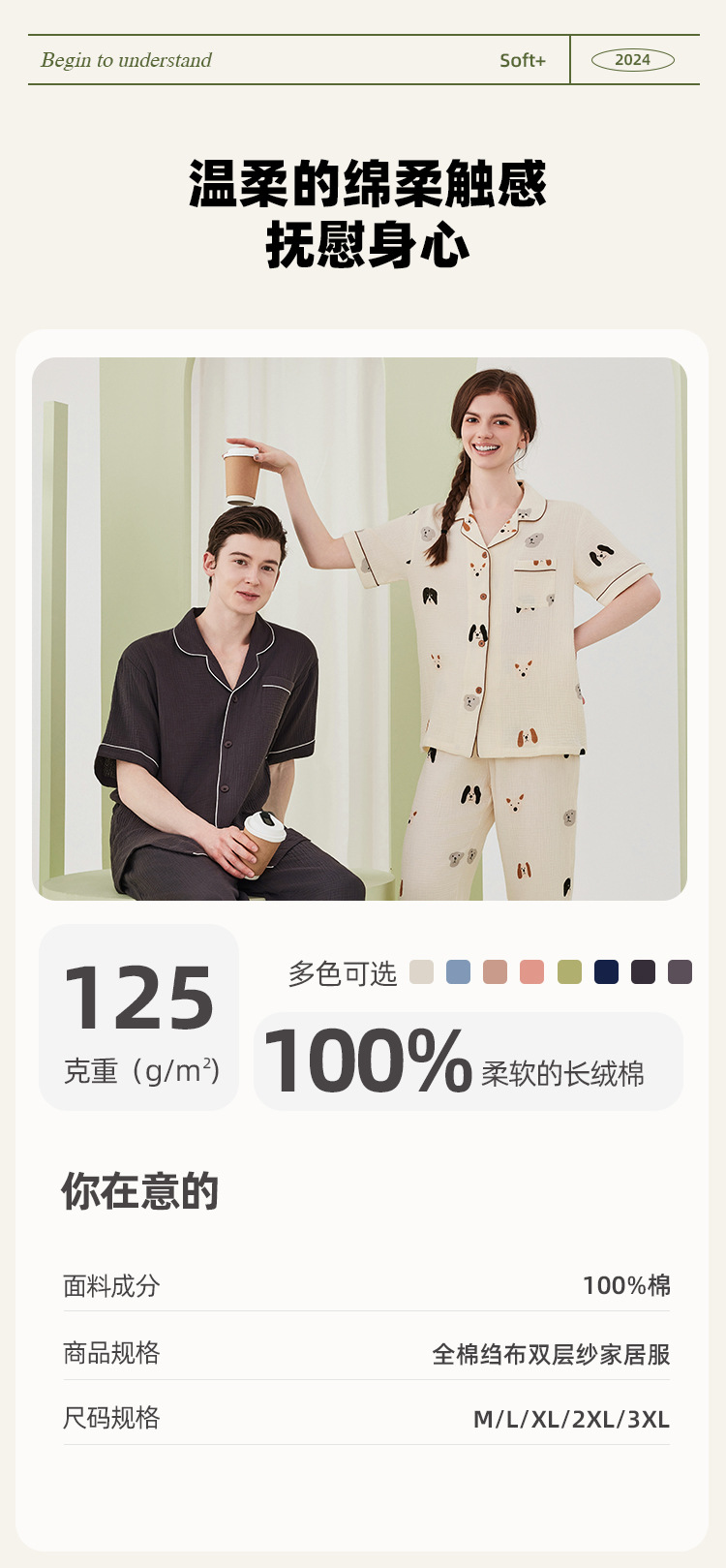 더블 레이어 실 크레이프 커플 파자마 여성면 여름 반팔 바지 세트 커플 홈 웨어 밖에서 입을 수 있습니다.스토어 가기
