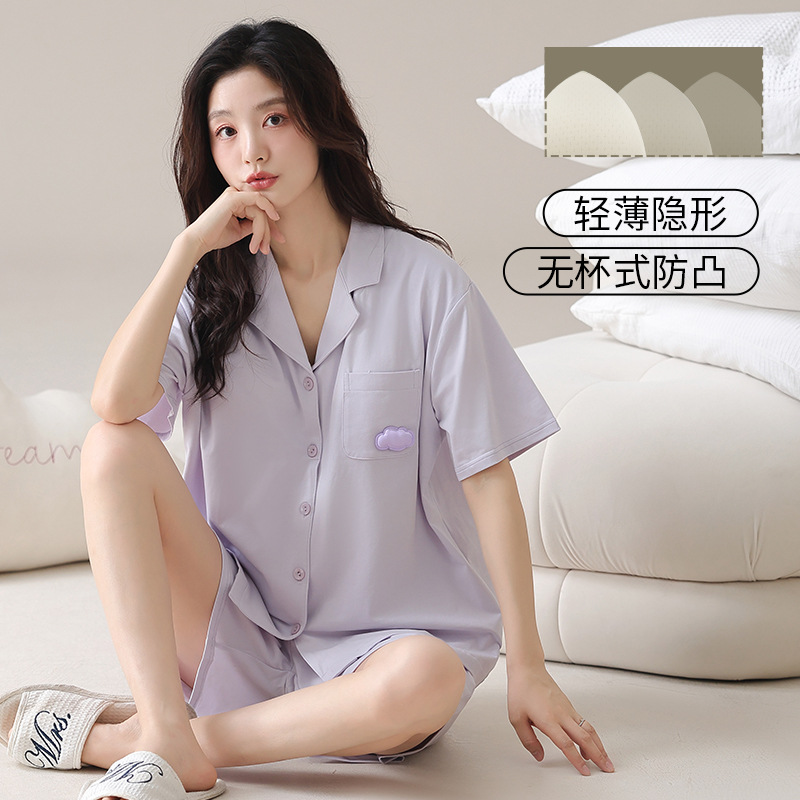 여성용 가슴 패드가 있는 멋진 코튼 풀업 라펠 카디건 잠옷, 여름 반팔 반바지, 루즈한 여성용 홈웨어 세트스토어 가기
