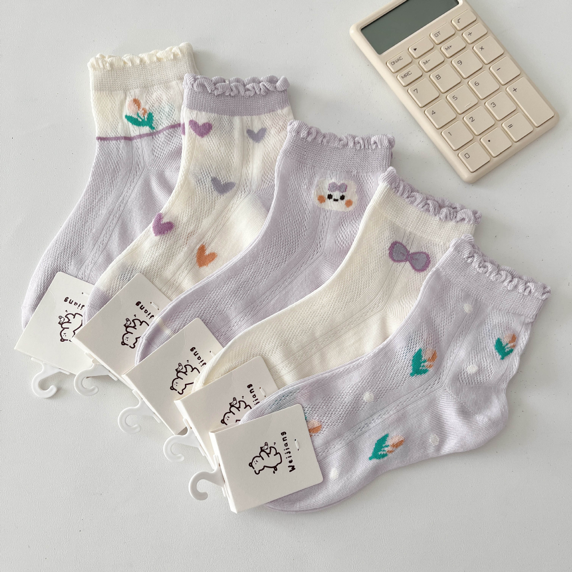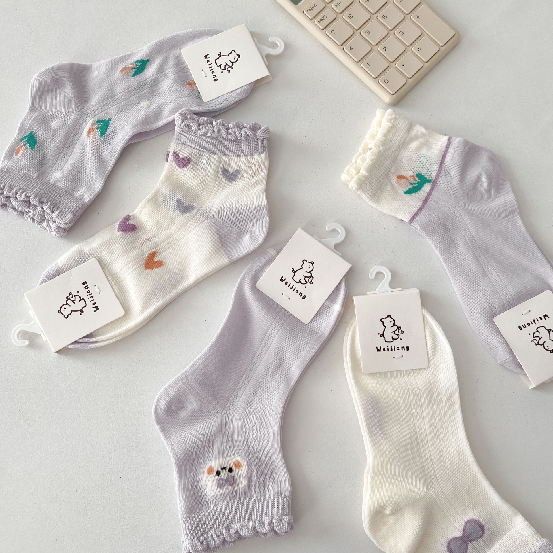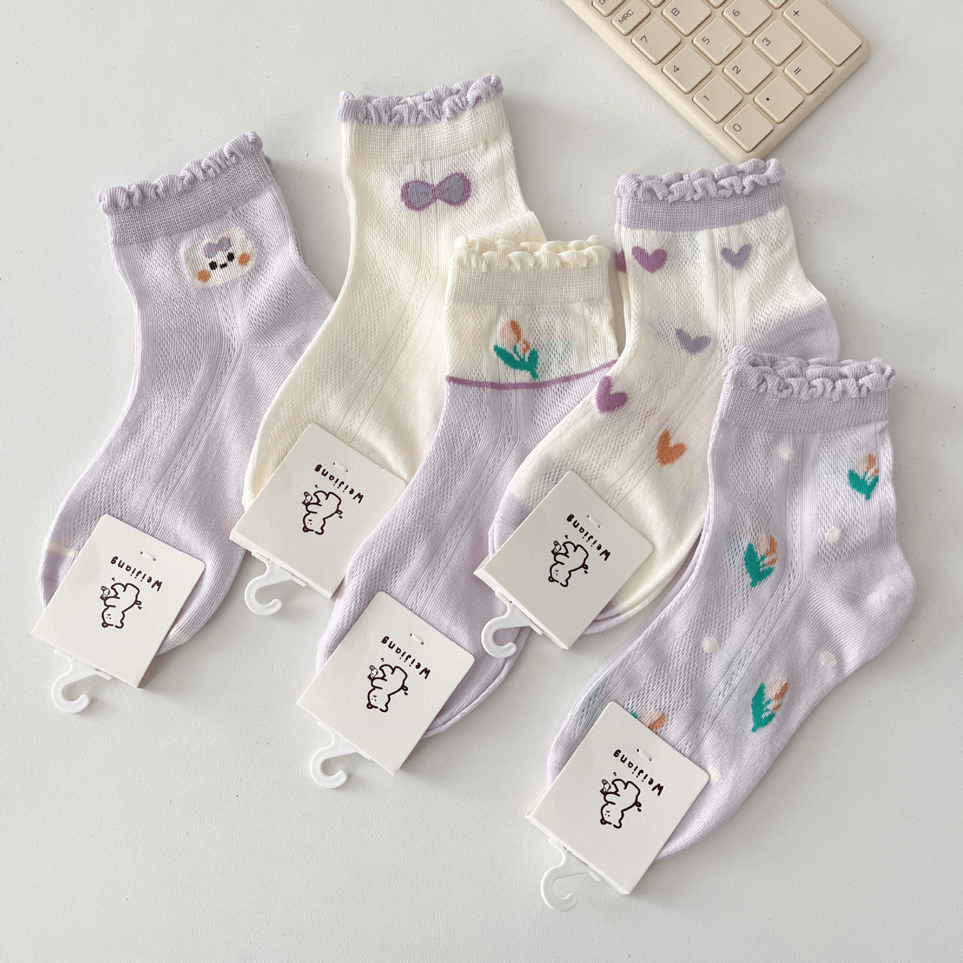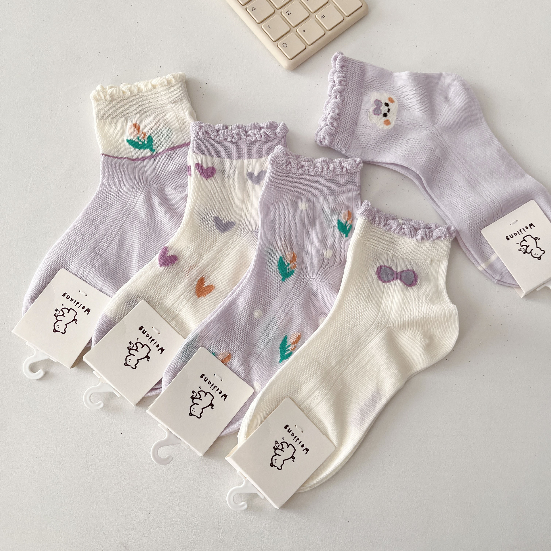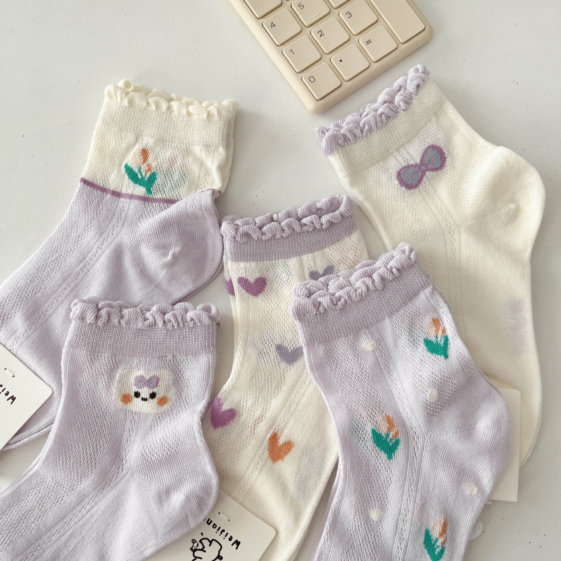 Weijiang 2024 봄과 여름 빗질면 사랑스러운 레이스 중반 종아리 양말 메쉬 통기성 중형 및 대형 어린이 아기 양말스토어 가기