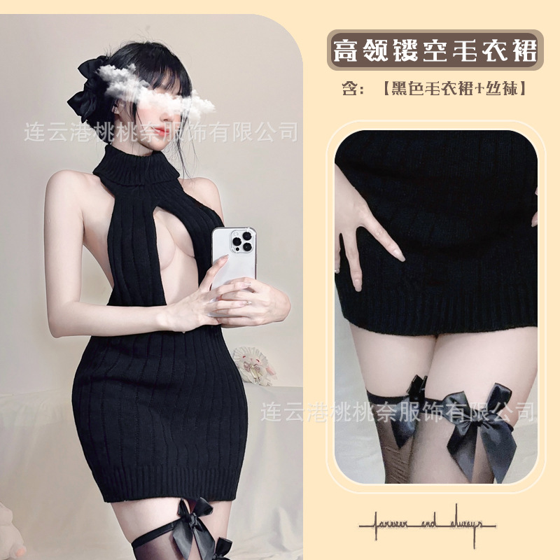 딥 V 하이 넥 할로우 스트랩 민소매 니트 스웨터 섹시한 섹시한 유니폼 백리스 로우 컷 직장 잠옷 세트