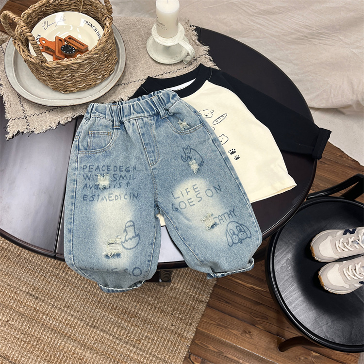 어린이용 데님 팬츠 봄 가을 유아용 패션 바지 아기 가을 의류 긴바지 한국 스타일 남아용 그래피티 스트레이트 캐주얼 팬츠