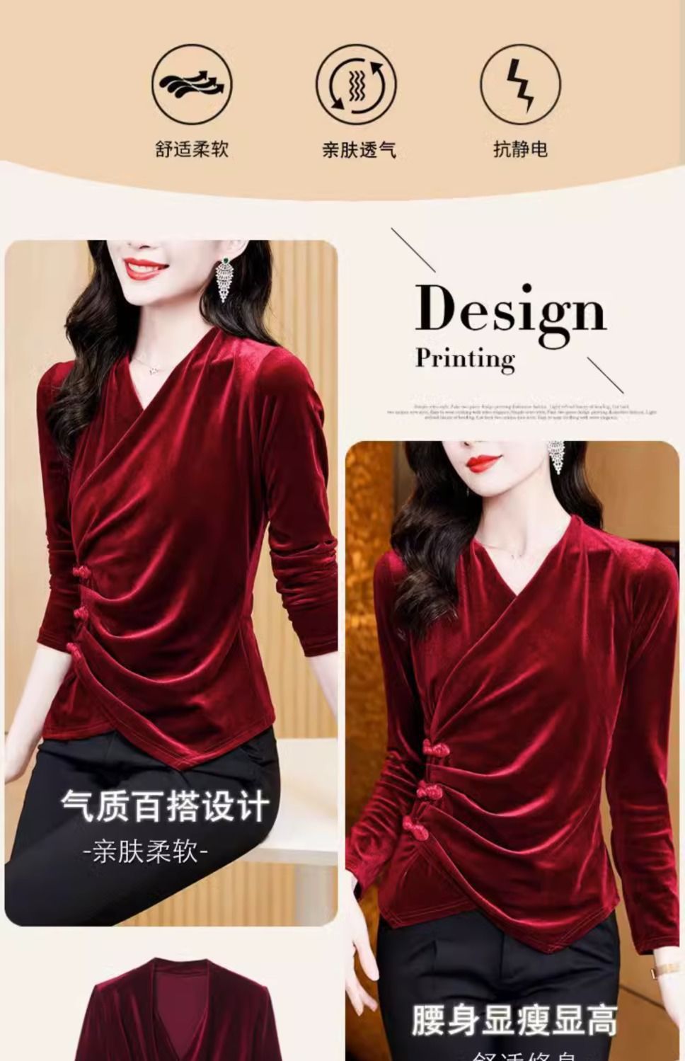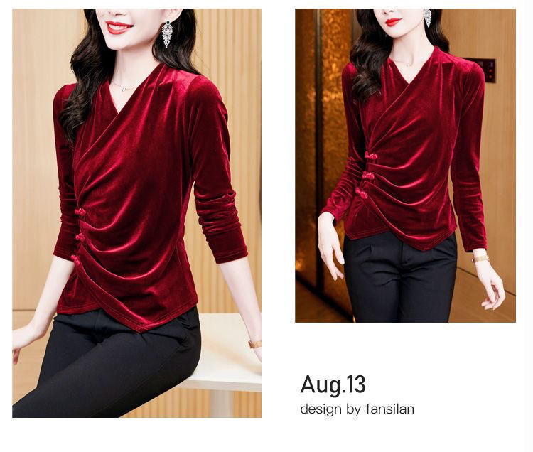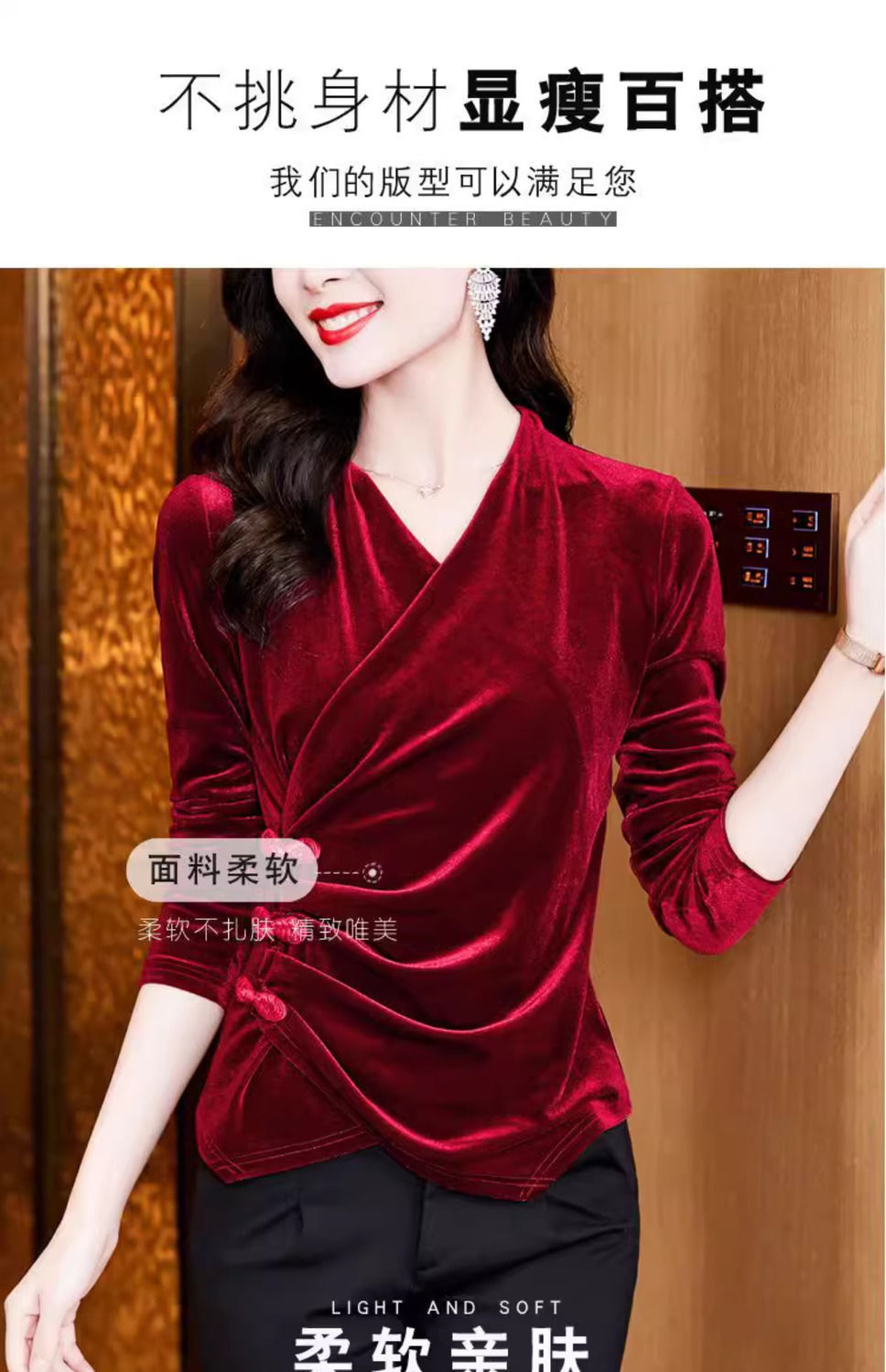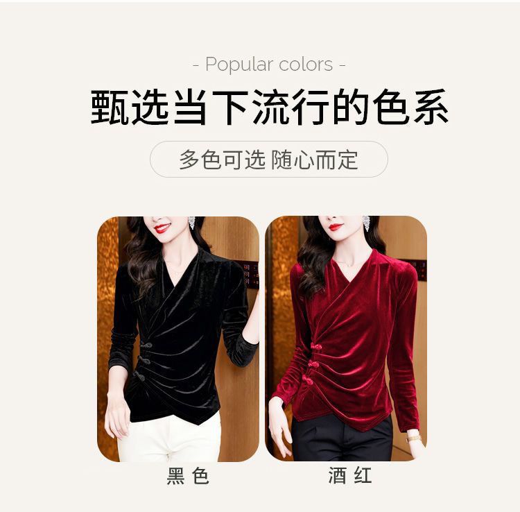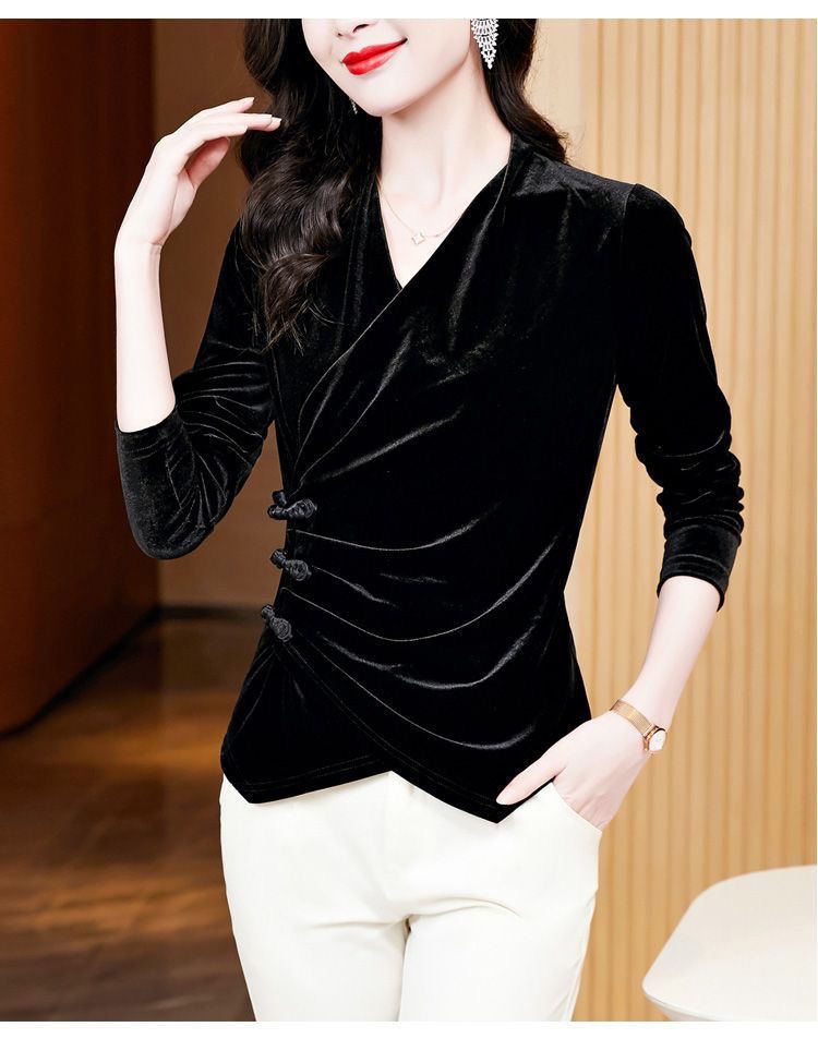 크로스 V 넥 티셔츠 여성용 긴팔 봄 웨스턴 스타일 새로운 레트로 버클 보팅 셔츠 블랙 벨벳 탑