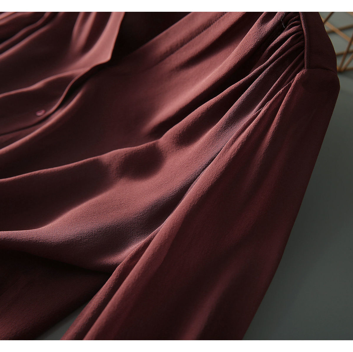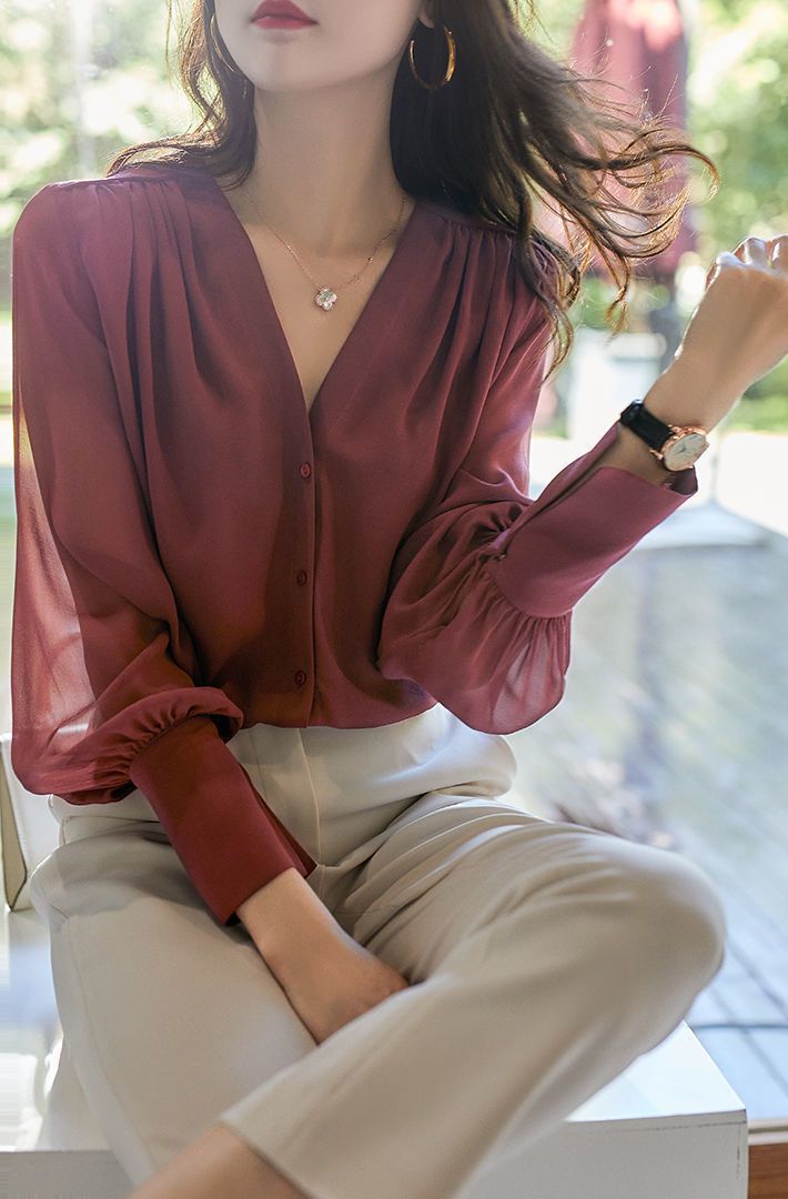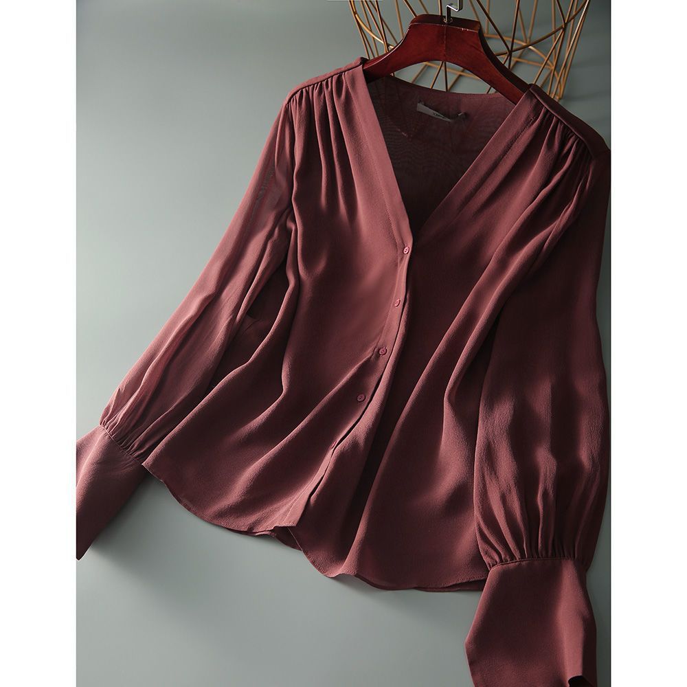 2024 봄과 가을 작은 셔츠 여성 쉬폰 탑 레트로 간단한 슬리밍 V-넥 긴팔 우아한 셔츠스토어 가기