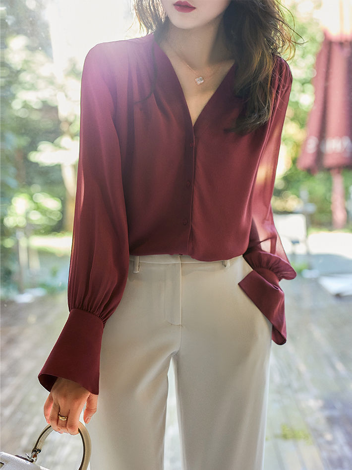2024 봄과 가을 작은 셔츠 여성 쉬폰 탑 레트로 간단한 슬리밍 V-넥 긴팔 우아한 셔츠