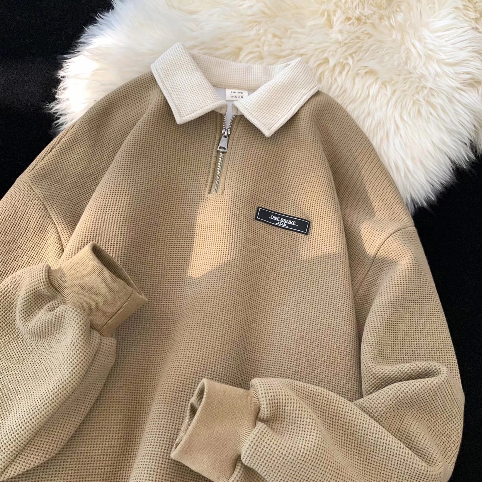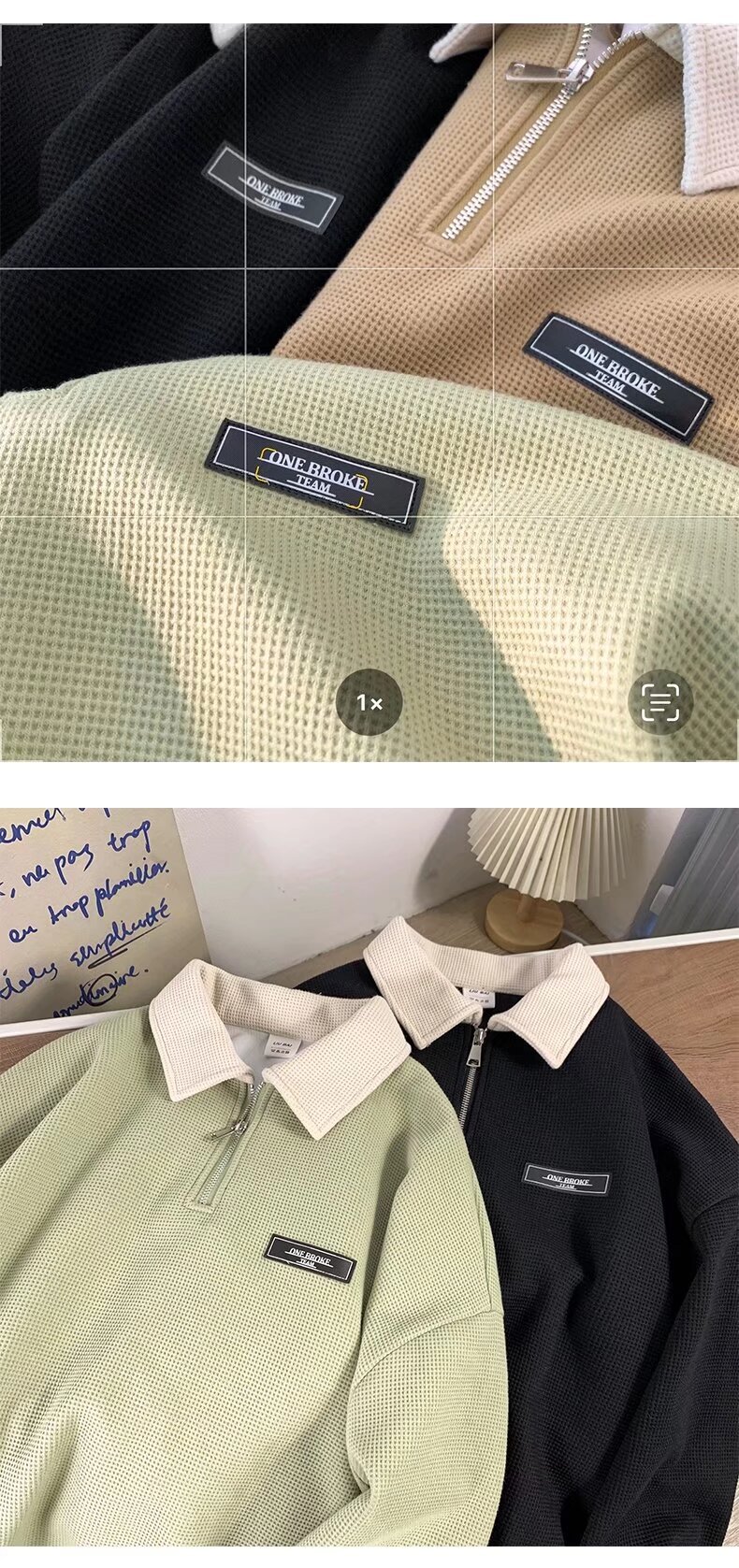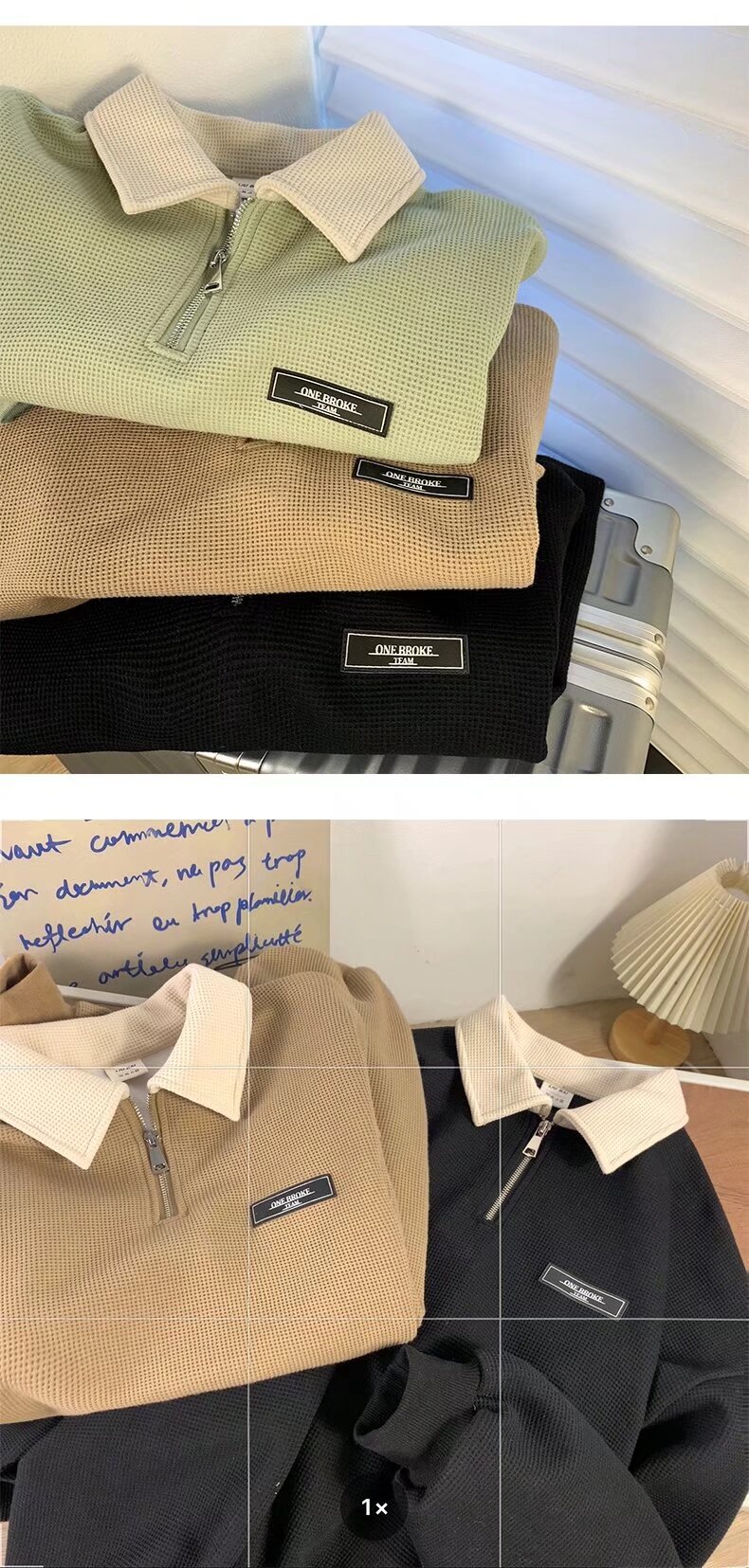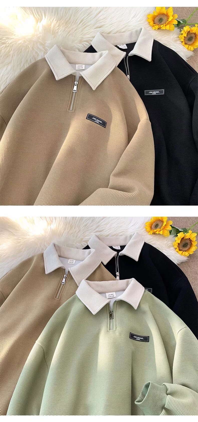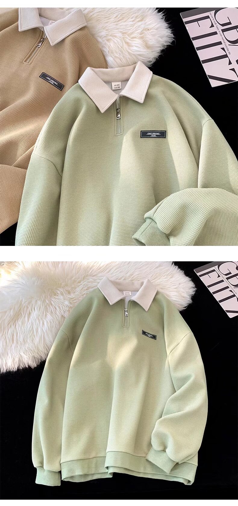 폴로 셔츠 스웨터 남성 봄과 가을 일본 복고풍 대비 컬러 옷깃 탑 무거운 대학 스타일 캐주얼 느슨한 코트스토어 가기