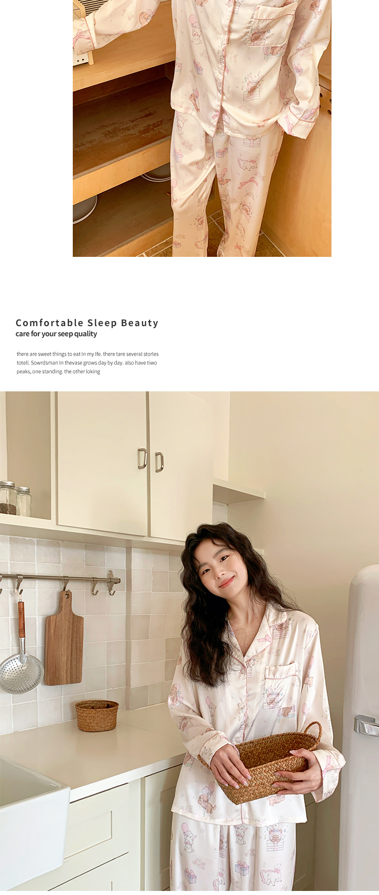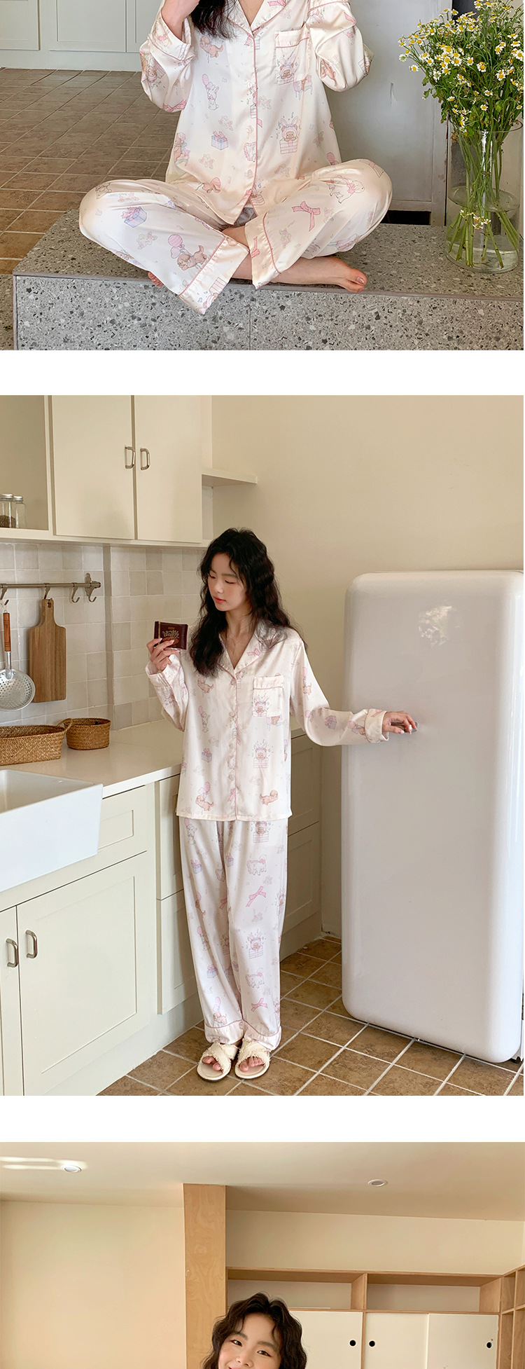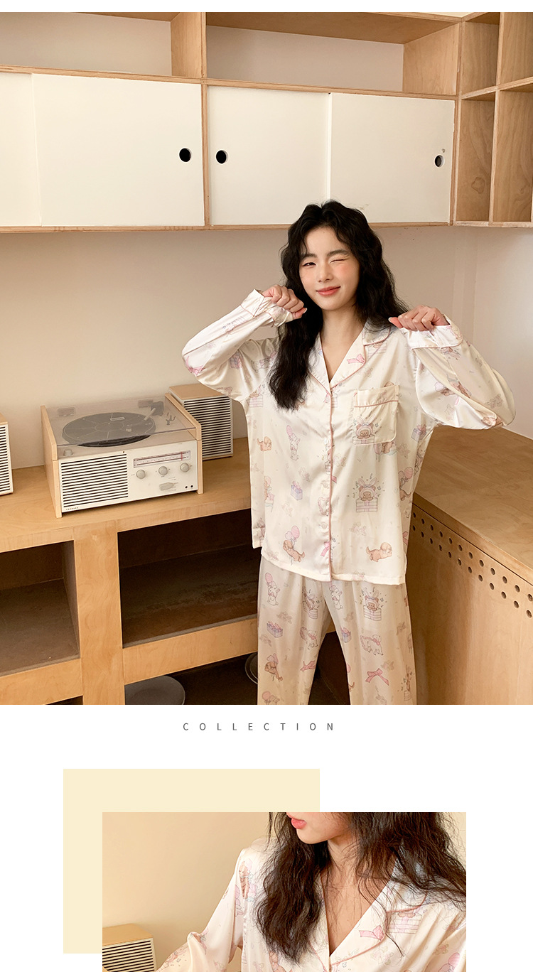 핑크 베어 파자마 Girly Sense Ins 한 스타일 달콤한 실크 봄 새 홈웨어 옷깃 얇은스토어 가기