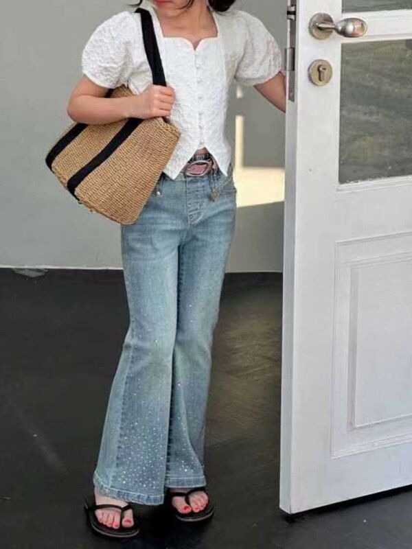 한국 아동복 소녀 데님 스트레칭 모조 다이아몬드 플레어 바지 2024 봄 새 소녀의 세련된 청바지