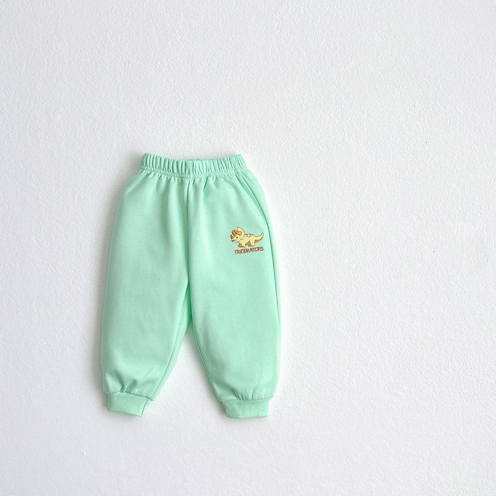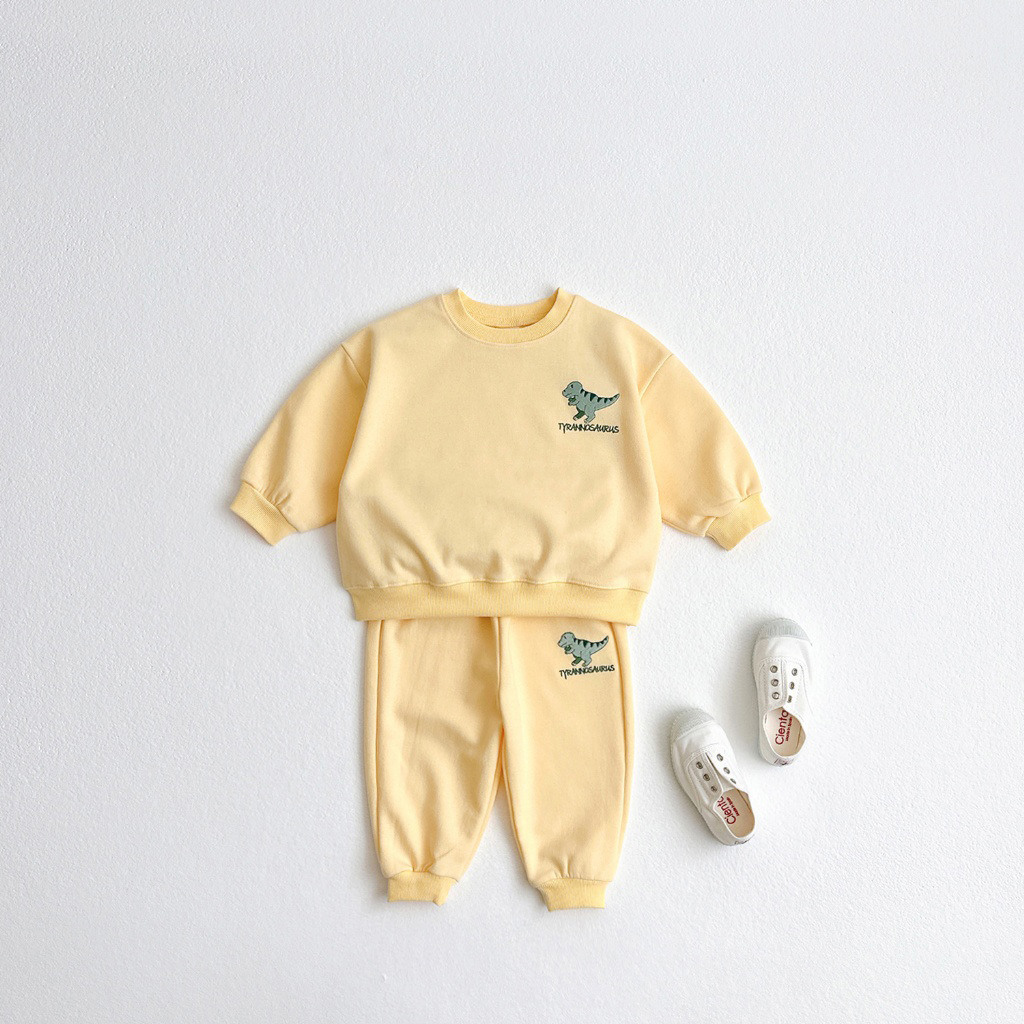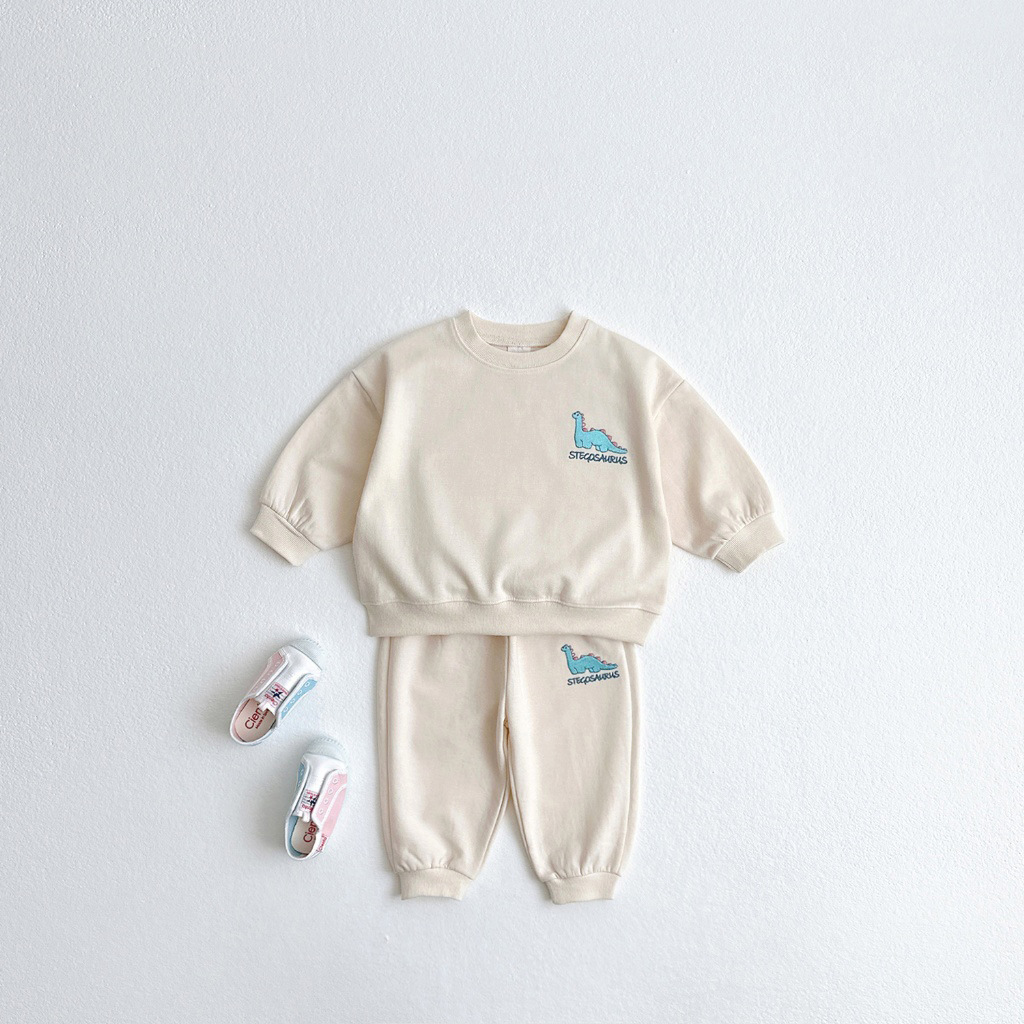 2024 봄 신작 중소형 아동복 코튼 귀여운 공룡 프린트 한국 남성 및 여성 베이비 스웨트 셔츠 투피스 세트스토어 가기