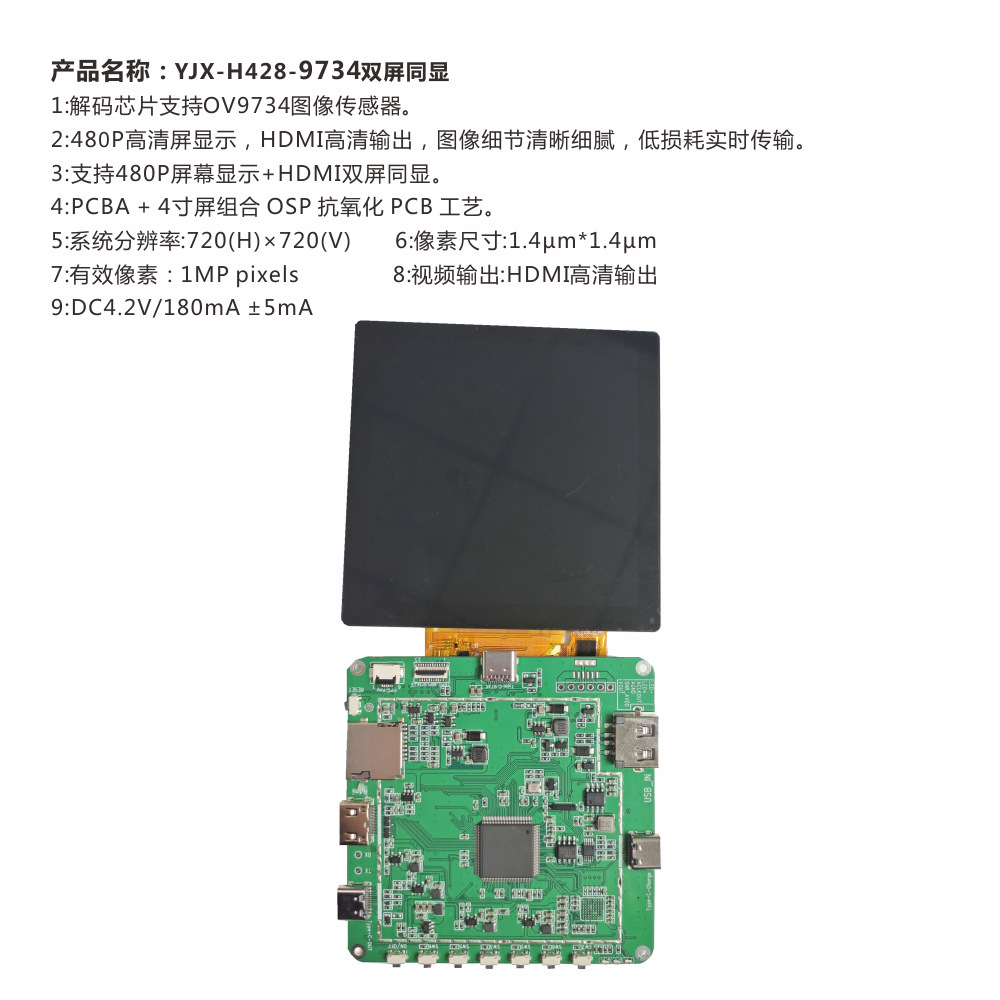 USB2.0接口高性能的影像处理解码板,内置图像处理器和数字信号处理器,输出高质量的图像画质,通过先进的图像算法技术,得到专业的影像画面,是医疗内窥镜领域优秀的解决方案;支持OTG协议即插即用,可以无障碍应用于安卓系统,windows系统、liunx系统;输出YUV2信号以及MJPEG信号,最高像素1280*720的情况下可以传输30fps VGA YUV/MJPEG 15fps QVGA YUV/MJPEG,并且是极低的功耗和极低的信号延迟.