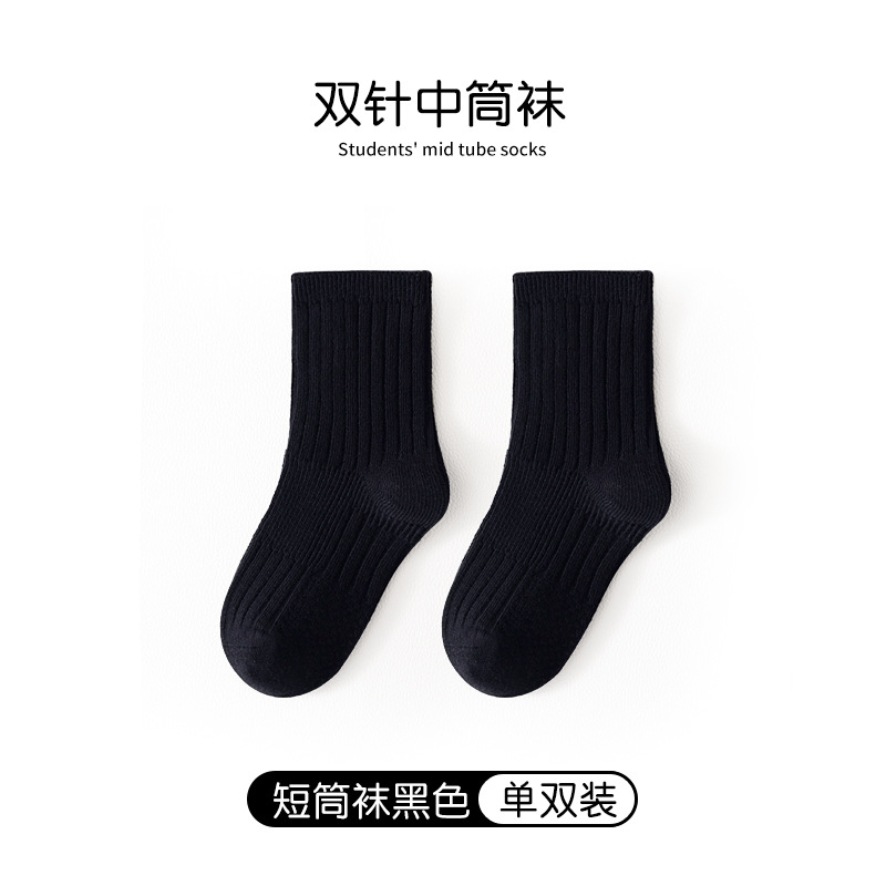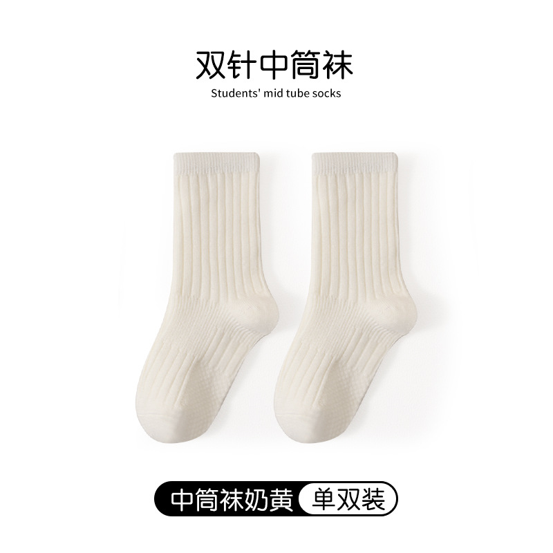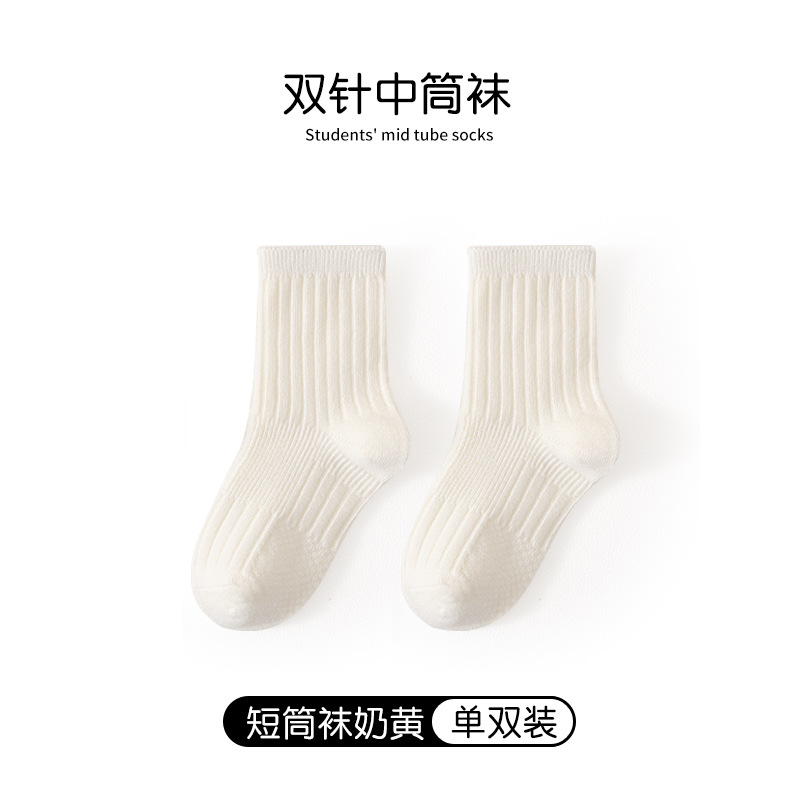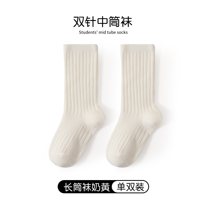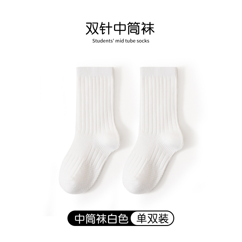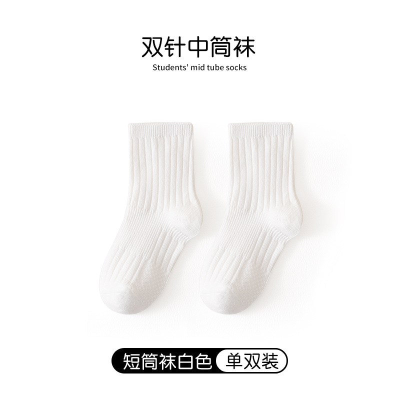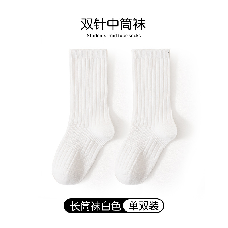 어린이 양말 봄과 가을 빗질면 중간 종아리 길이 양말 소녀 소년 단색 흰색 더블 바늘면 양말 학생 스타킹