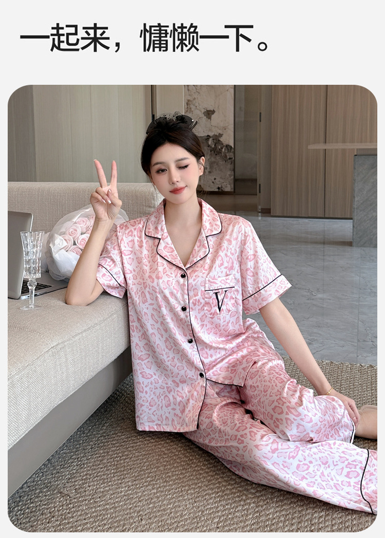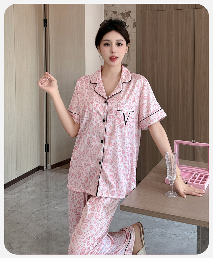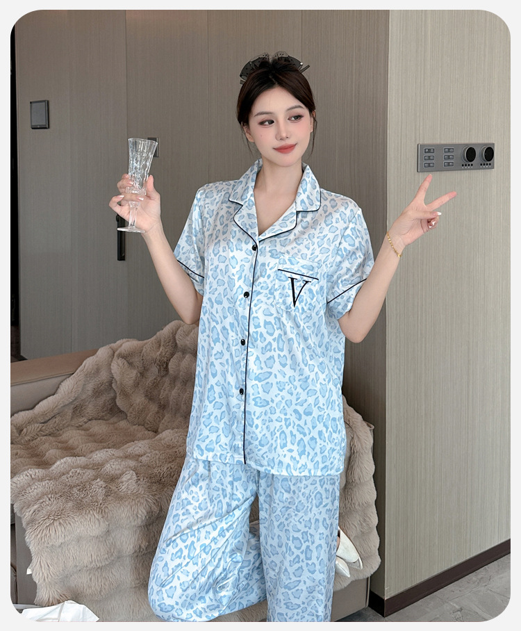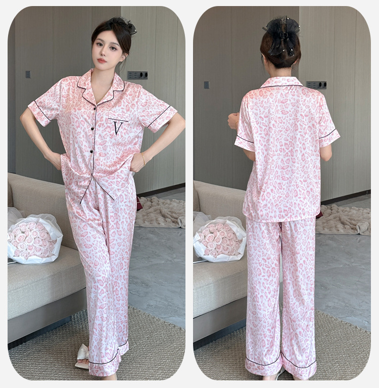 여름용 귀여운 레오파드 프린트 여성용 아이스 실크 얇은 잠옷 반팔 실크 홈웨어