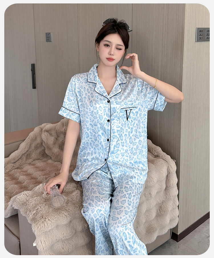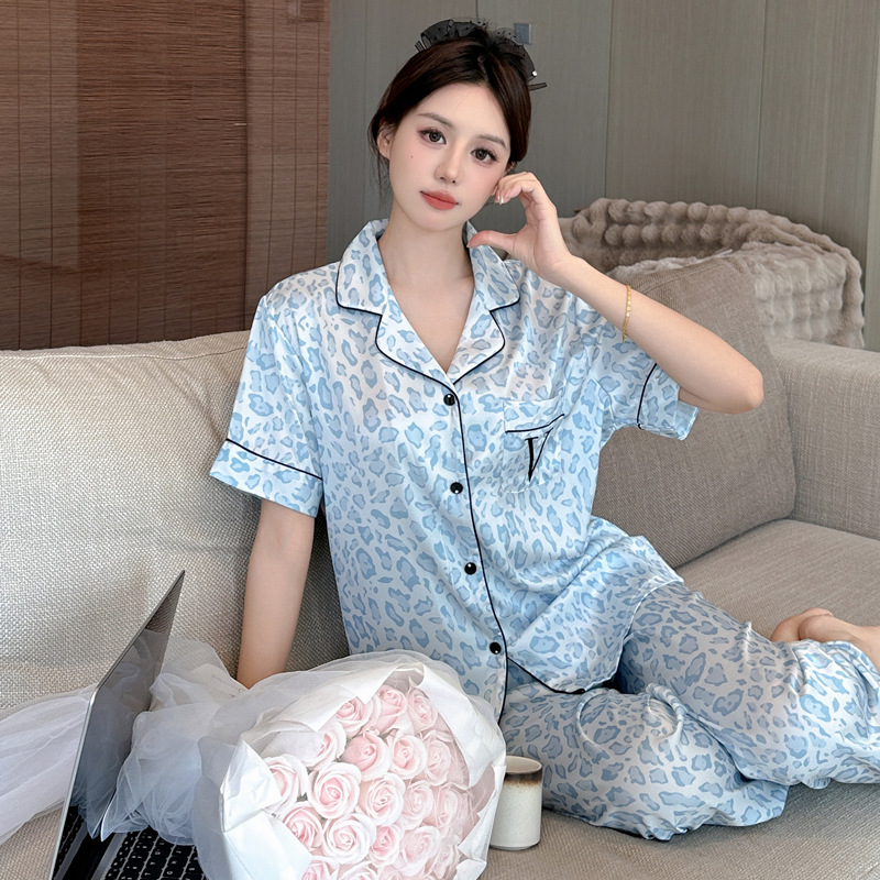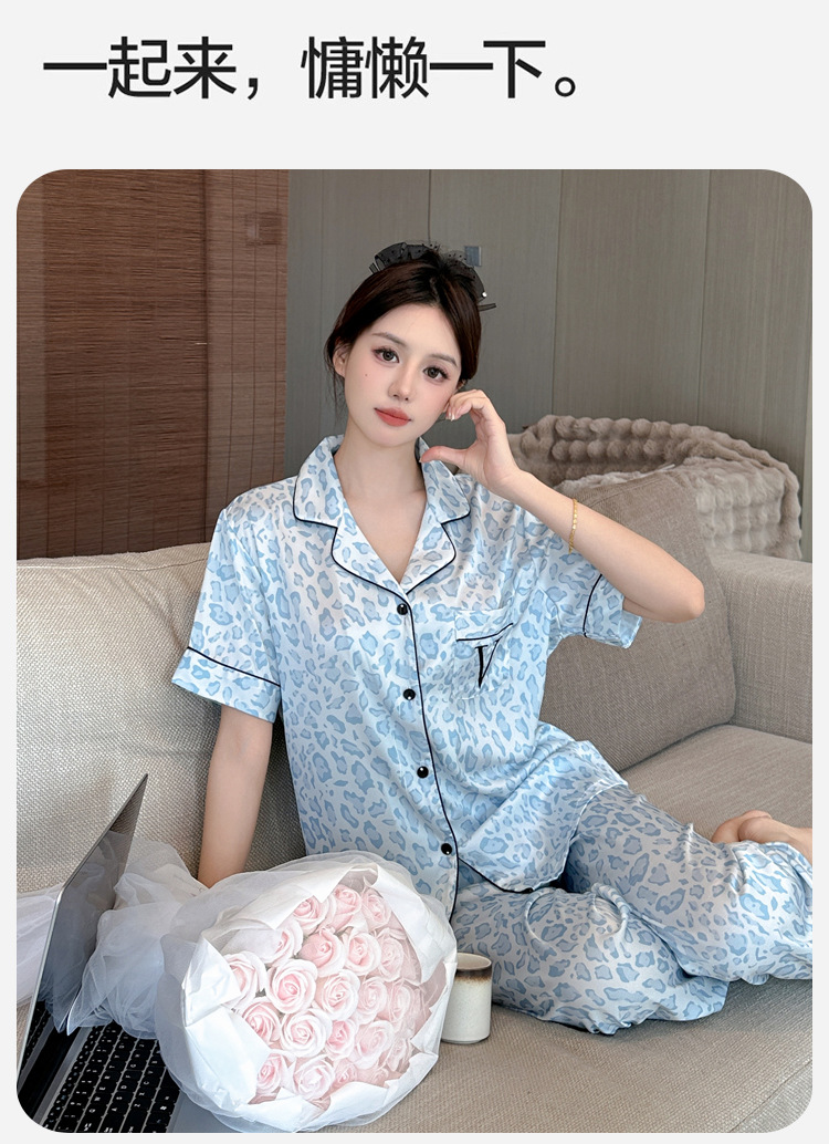 여름용 귀여운 레오파드 프린트 여성용 아이스 실크 얇은 잠옷 반팔 실크 홈웨어스토어 가기