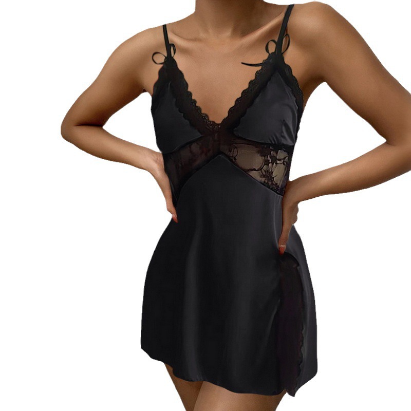 유럽과 미국의 인기있는 가공 대외 무역 여성 섹시한 서스펜더 스커트 관점 레이스 깊은 V 로우 칼라 나이트 드레스 활 높은 오픈스토어 가기
