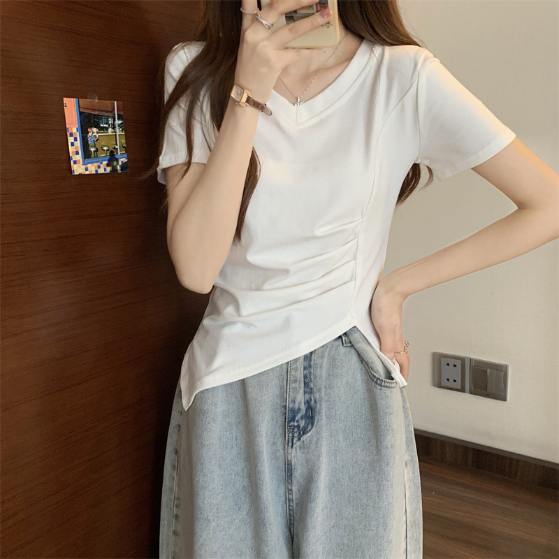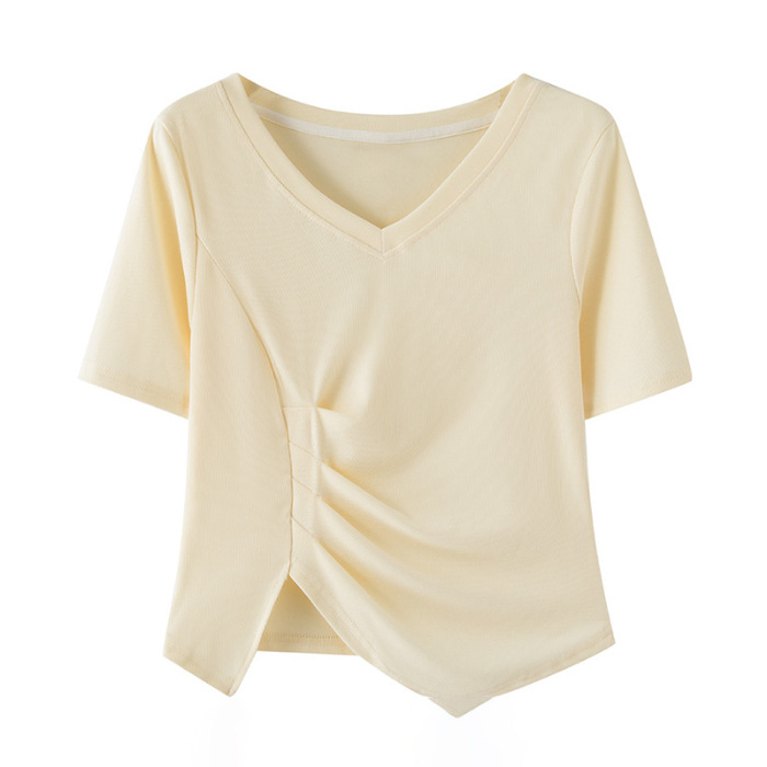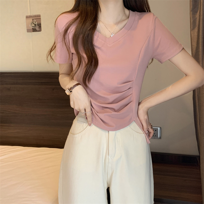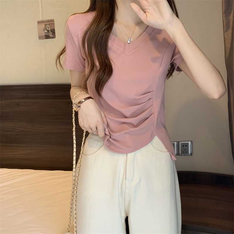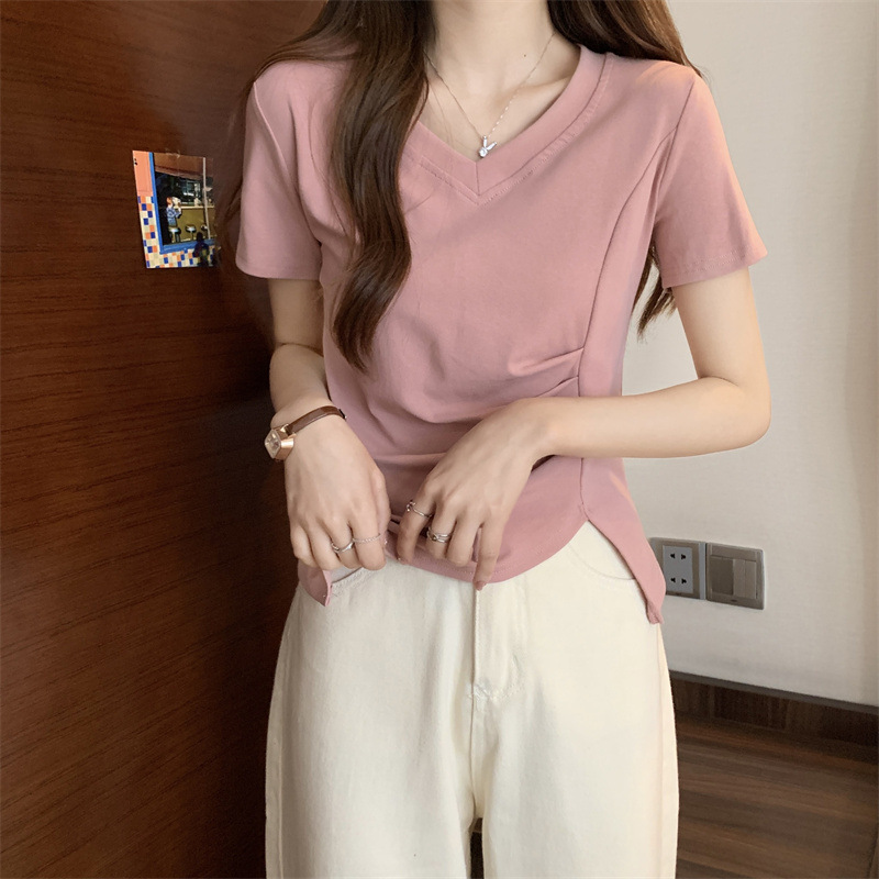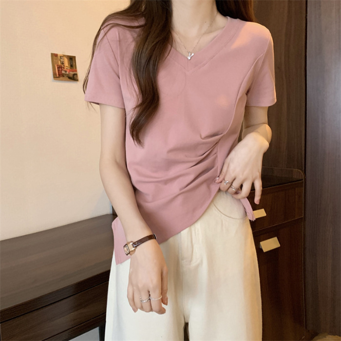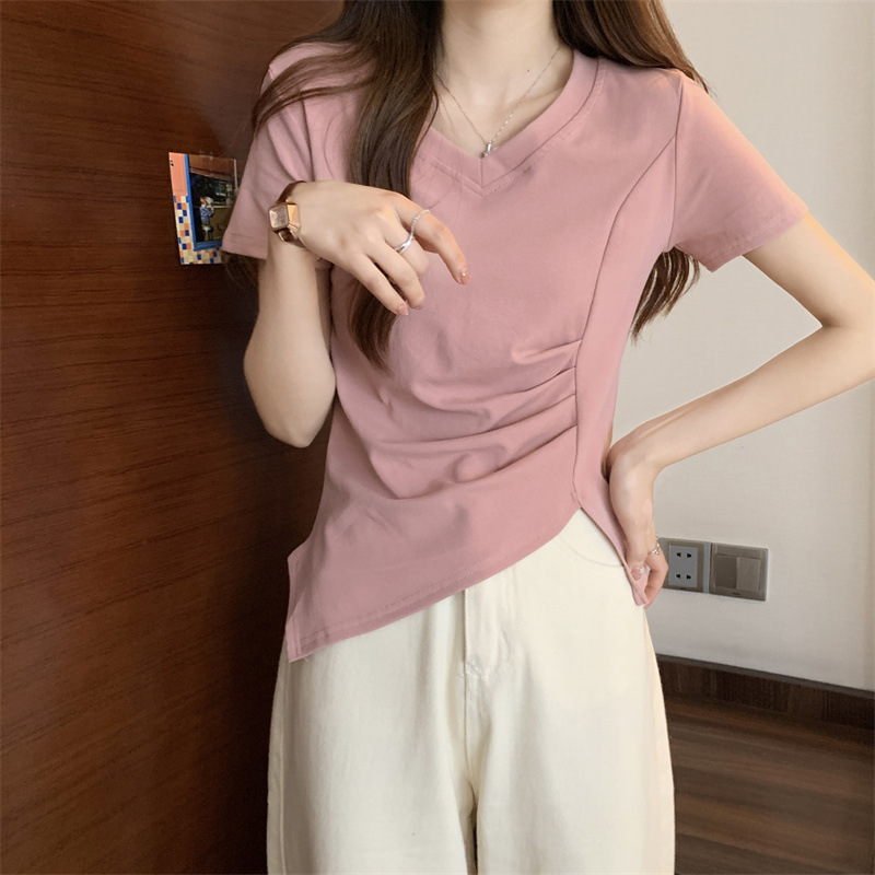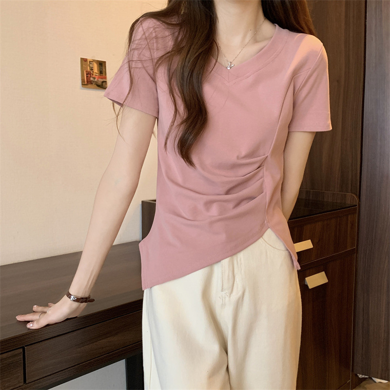 대외 무역 도매 여름 핑크 v-neck 짧은 소매 티셔츠 여성 디자인 감각 틈새 주름 허리 스플릿 불규칙한 탑스토어 가기
