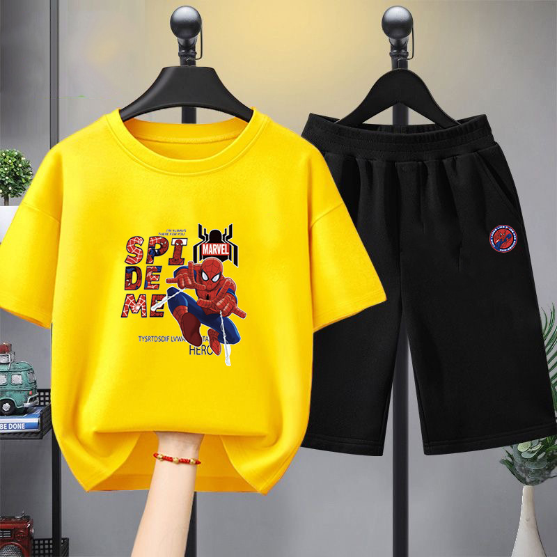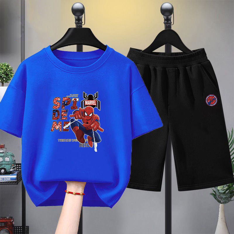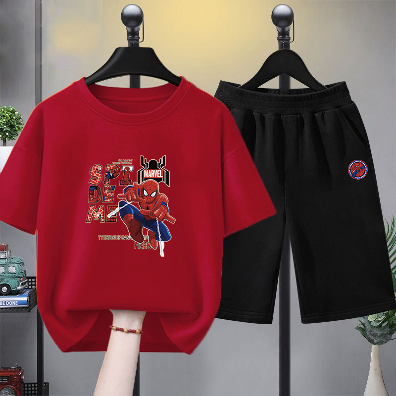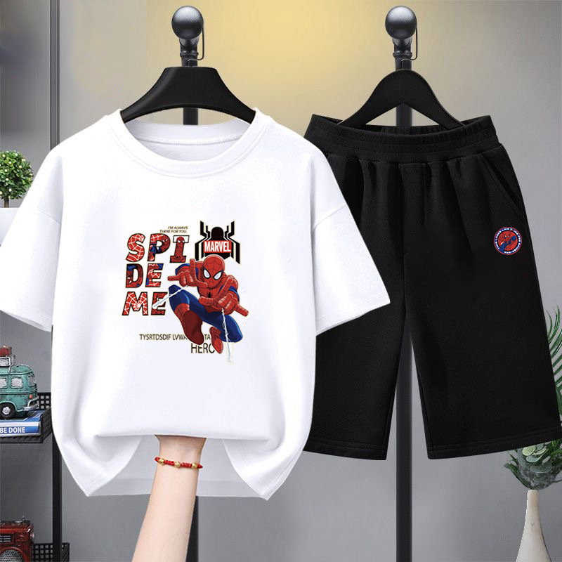 2024 새로운 여름 느슨한 애니메이션 스파이더 맨 캐주얼 스포츠 세트 남성과 여성의 중형 및 대형 아동복 세트 투피스 세트