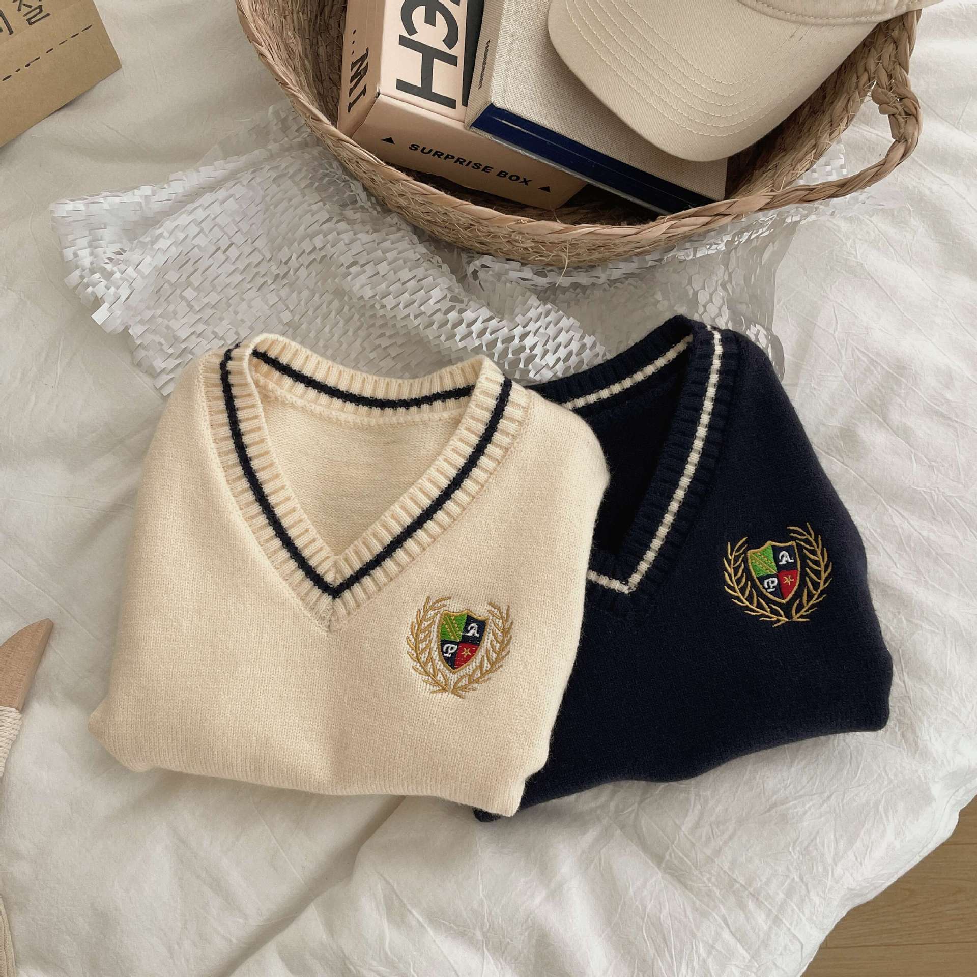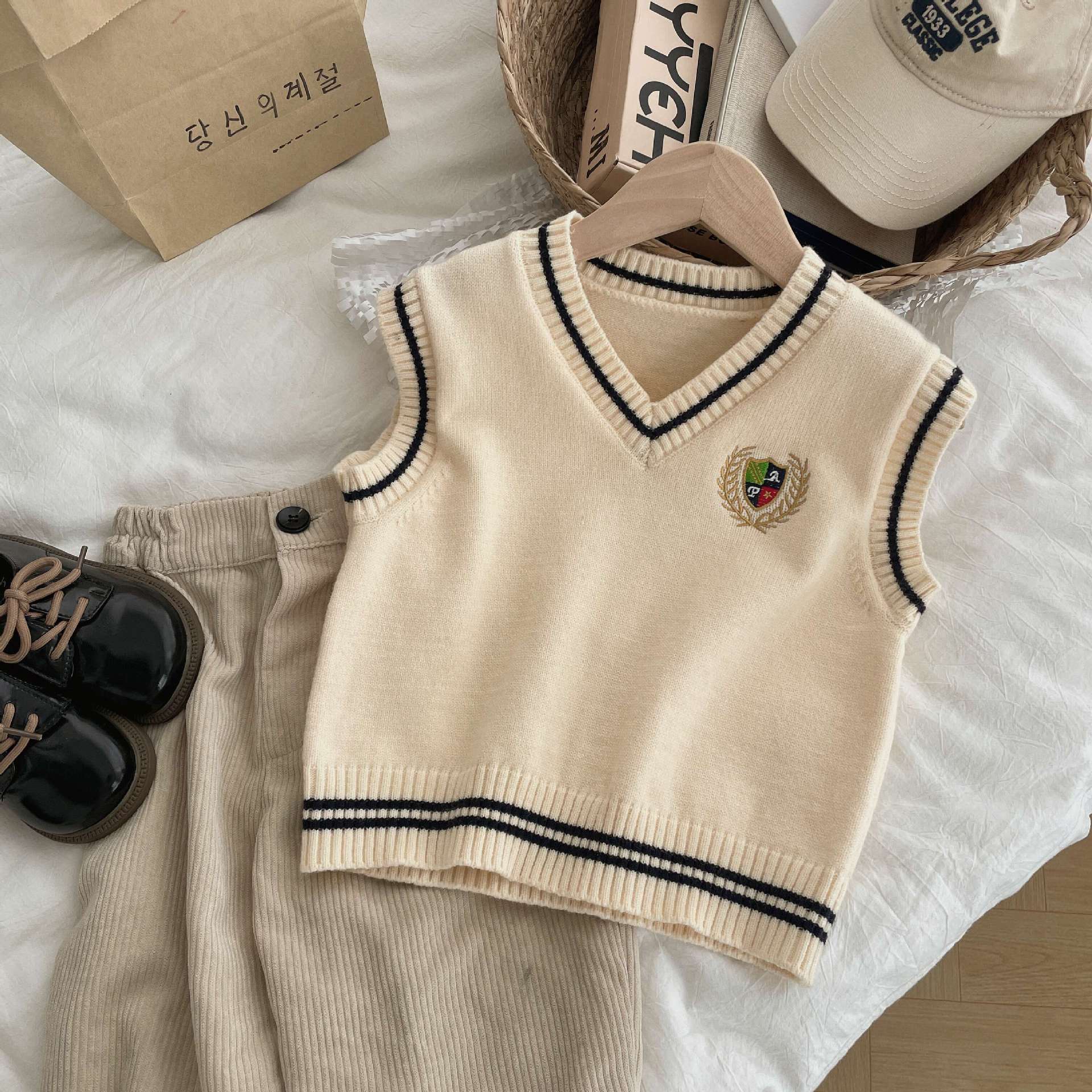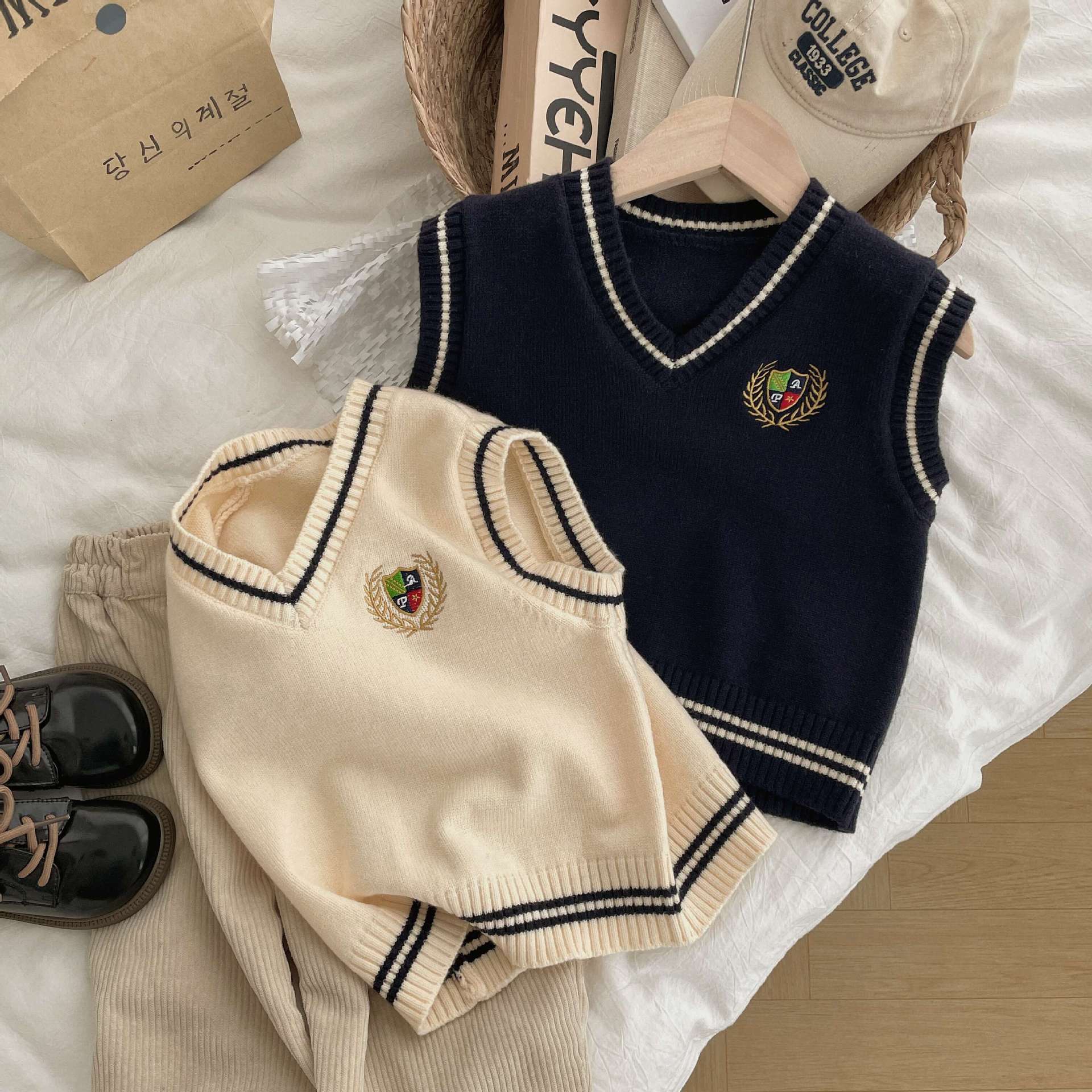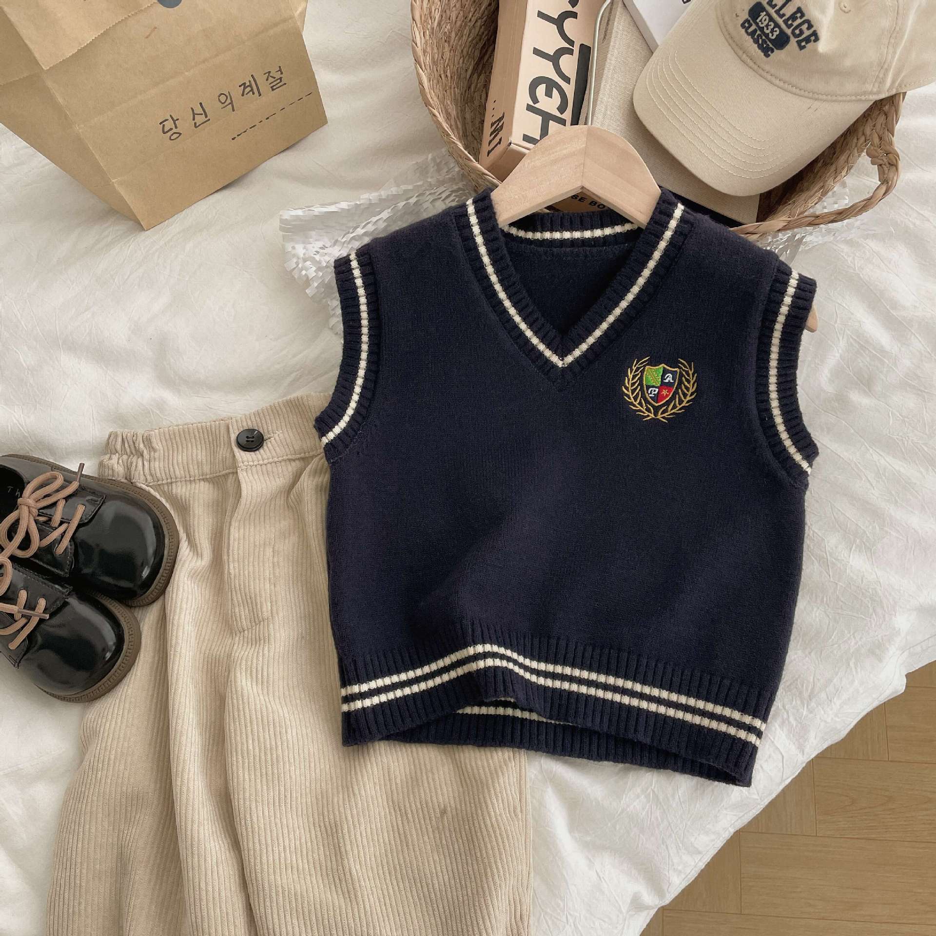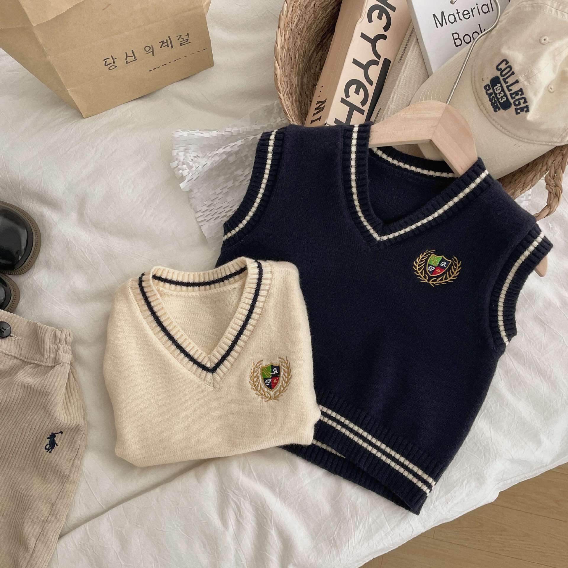 Ben Shushu 2025 봄과 가을 새로운 한국 스타일 다목적 아동 스웨터 조끼 대학 스타일 캐주얼 루즈 니트 조끼