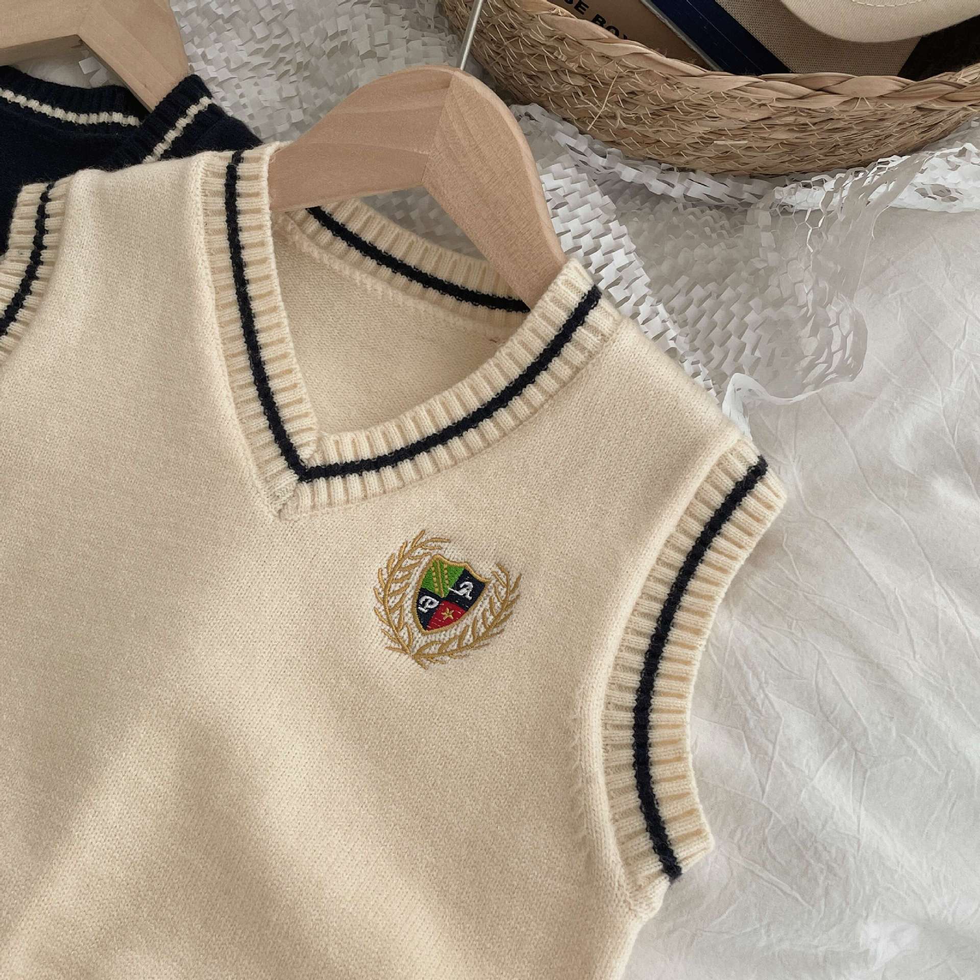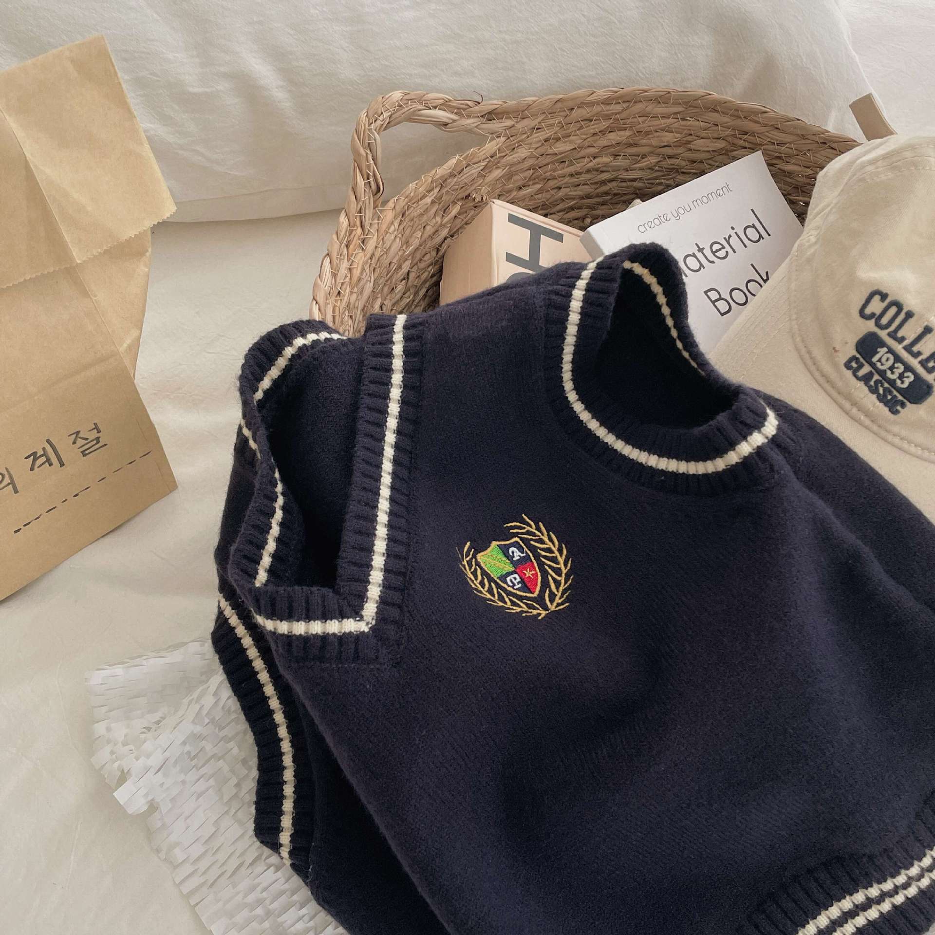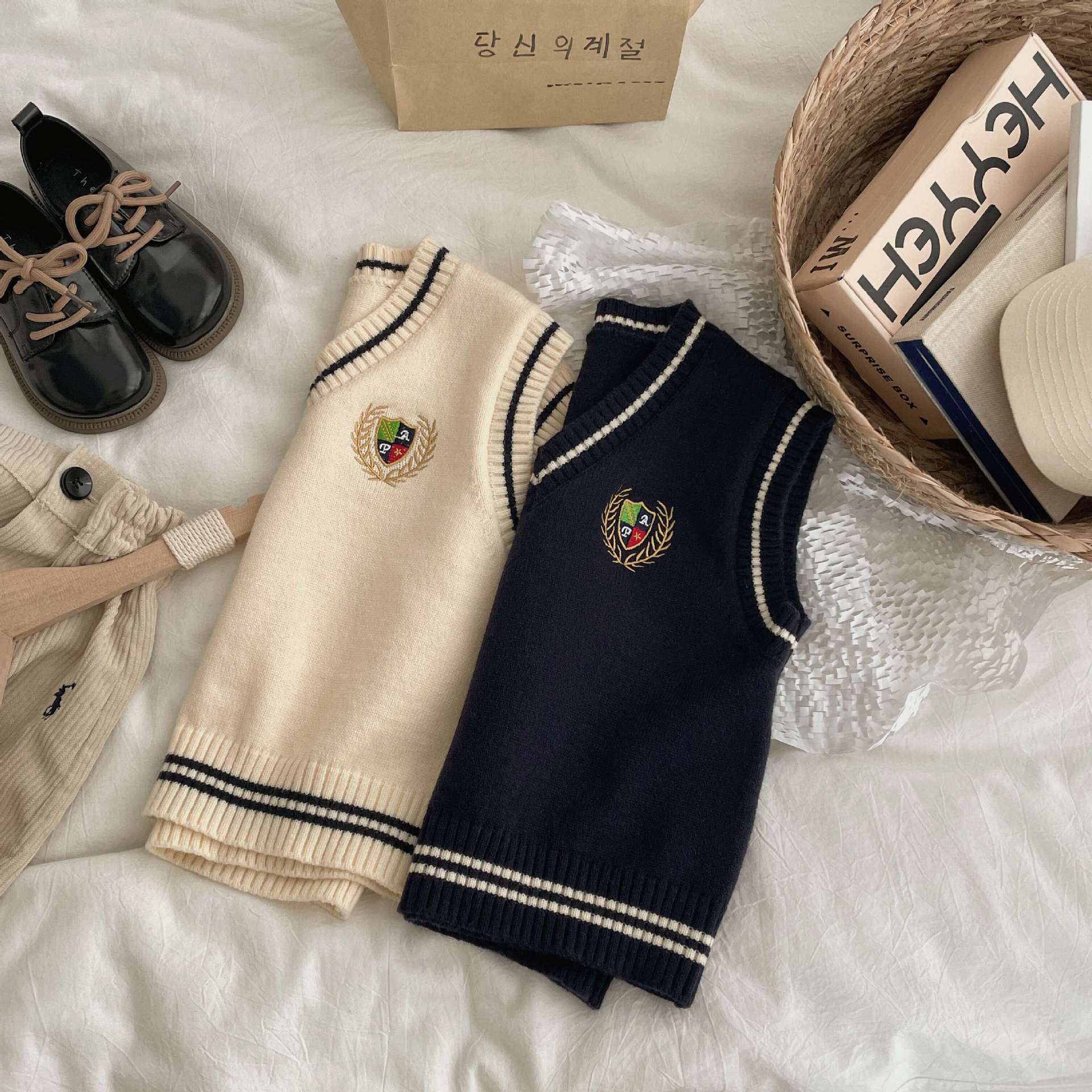 Ben Shushu 2025 봄과 가을 새로운 한국 스타일 다목적 아동 스웨터 조끼 대학 스타일 캐주얼 루즈 니트 조끼스토어 가기