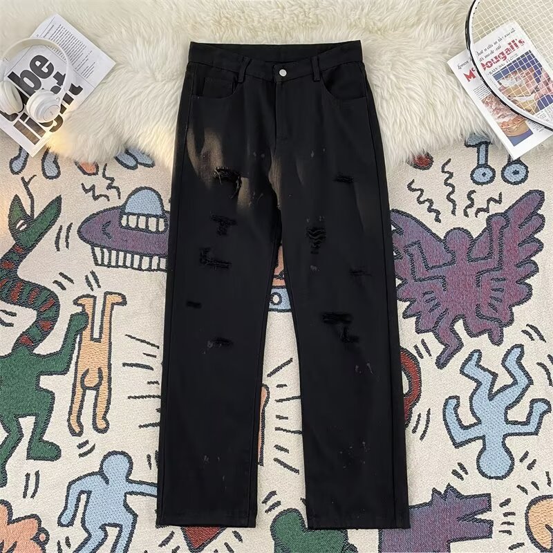 미국 청바지 남성 여름 얇은 미국 하이 스트리트 분위기 찢어진 패션 브랜드 느슨한 스트레이트 캐주얼 바지스토어 가기