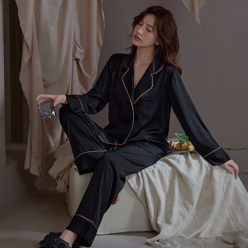 새로운 남성과 여성의 봄, 여름, 가을 커플의 얼음과 눈 실크 더블 브레스트 나무 버클 파자마 홈 웨어 세트 생방송 재고스토어 가기