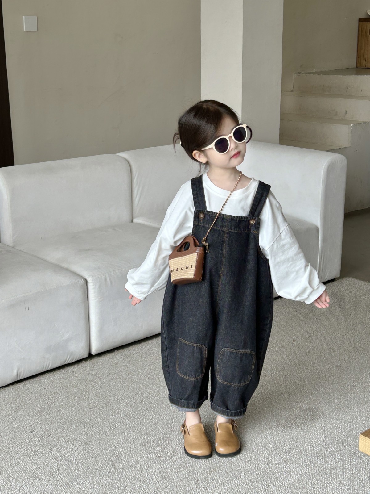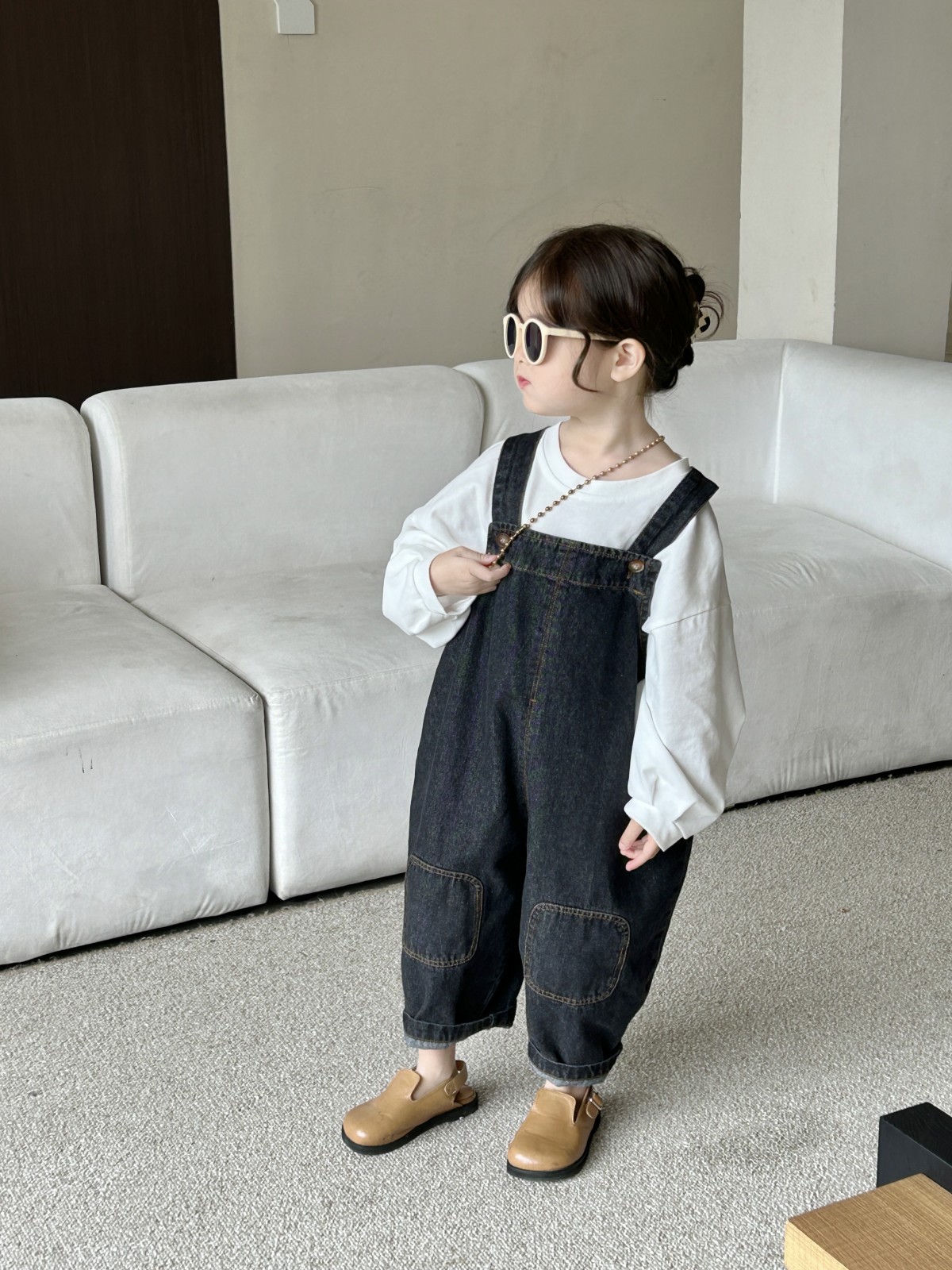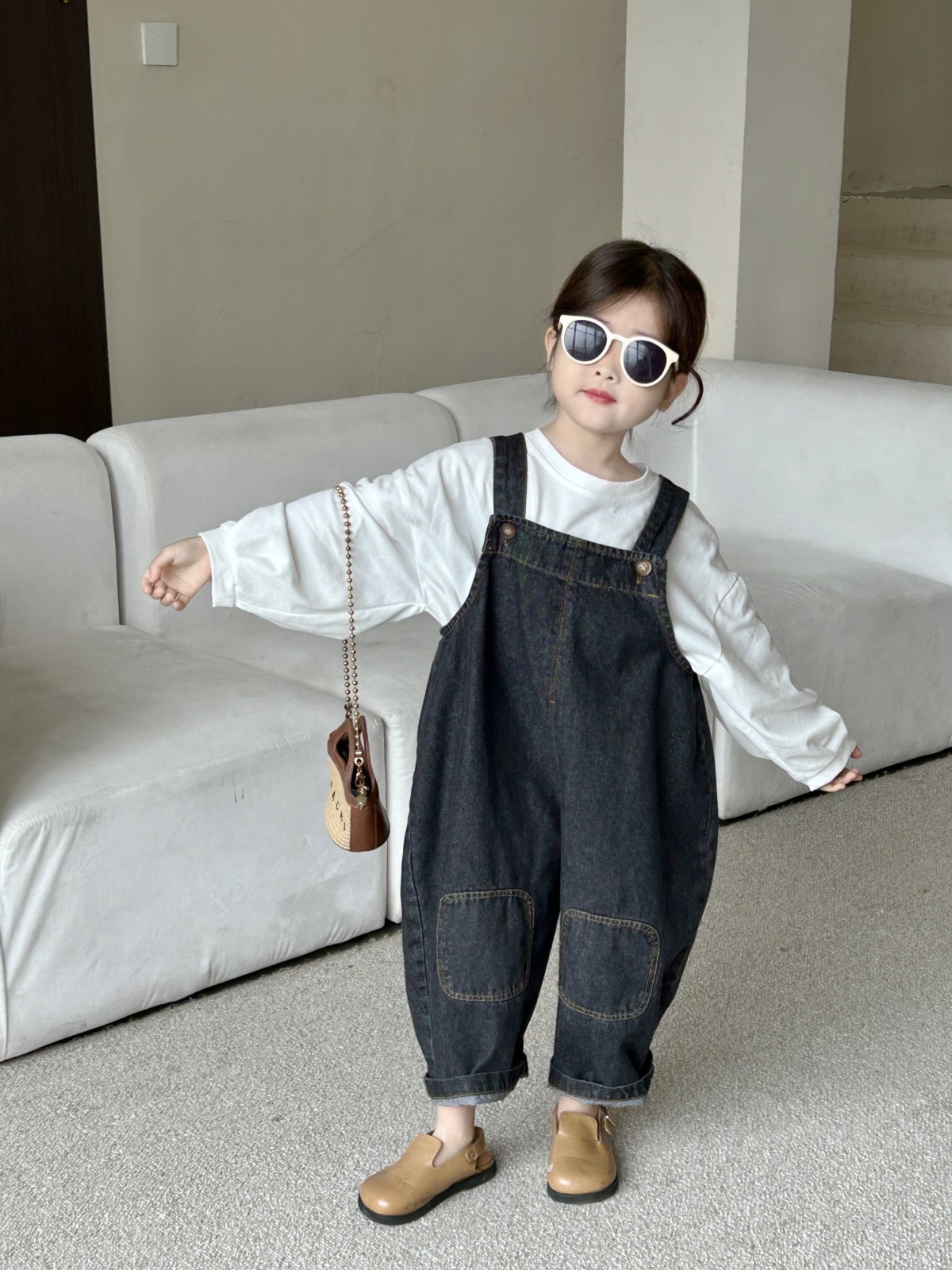 봄 새 어린이 복고풍 중립 향수를 씻은 데님 멜빵 한국판 아기의 느슨한 멜빵