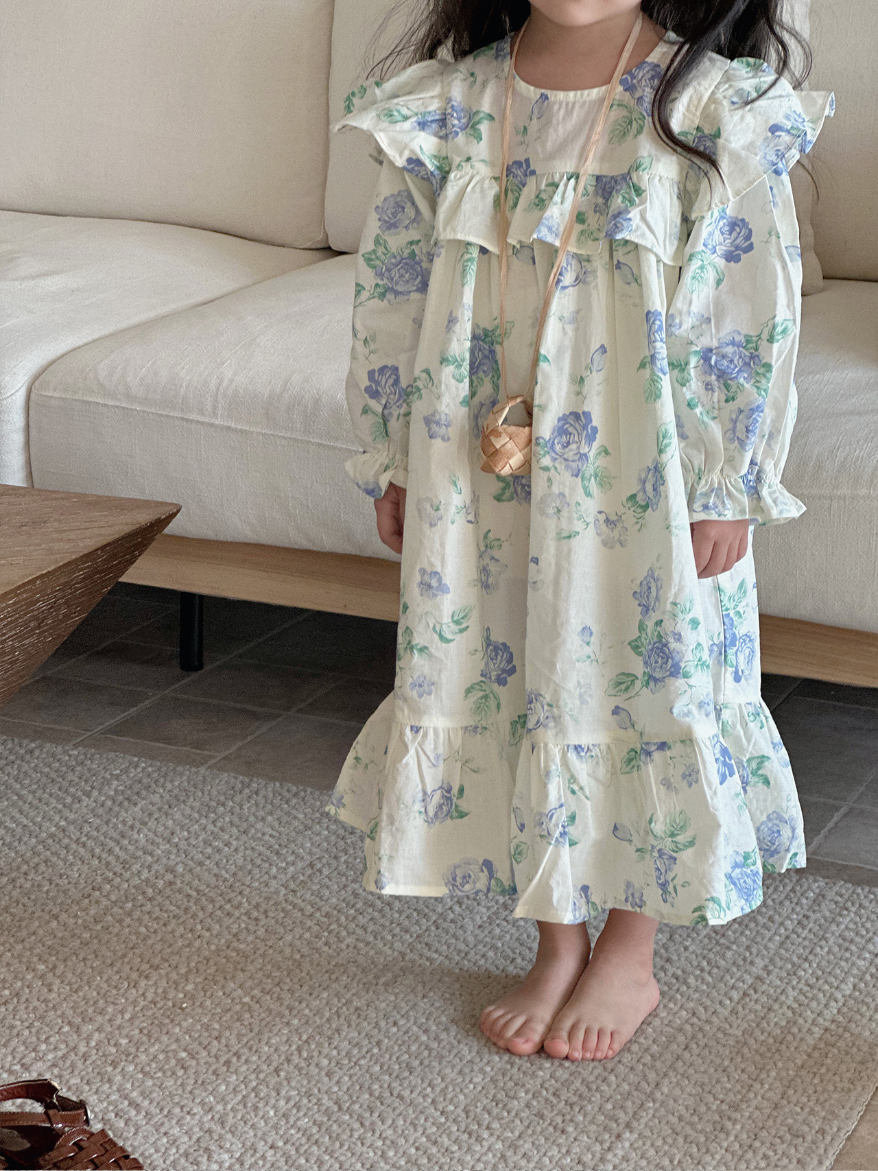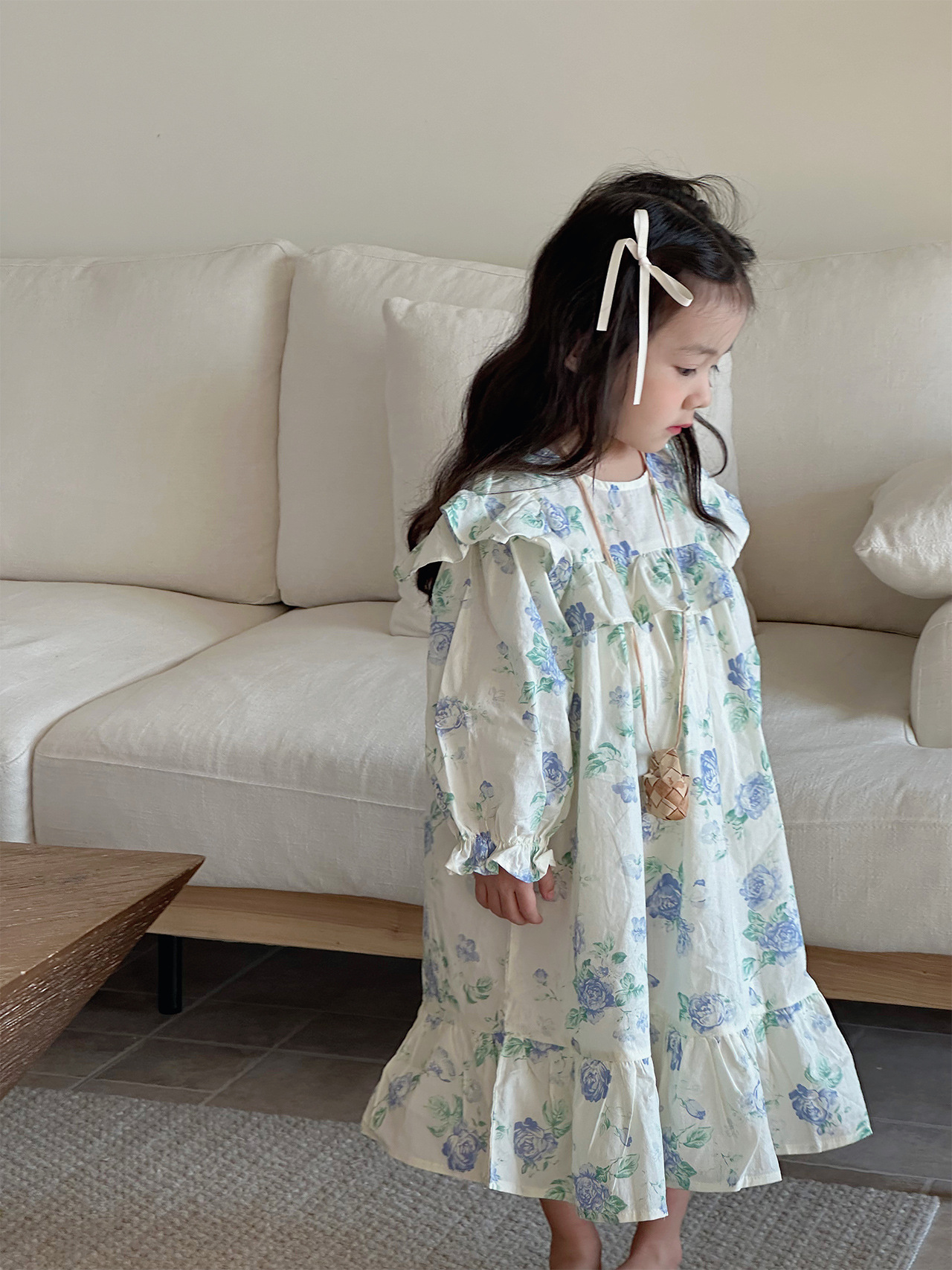 소녀의 꽃 원피스 어린이 봄과 여름 새로운 한국 스타일 연꽃 잎 칼라 공주 원피스 아기의 부드러운 긴 소매 원피스