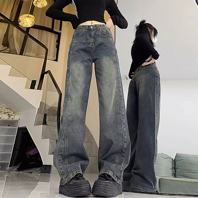 스트레이트 다리 청바지 여성 온라인 인기 이른 봄 높은 허리 바느질 디자인 시멘트 회색 좁은 배 모양의 넓은 다리 긴 바지