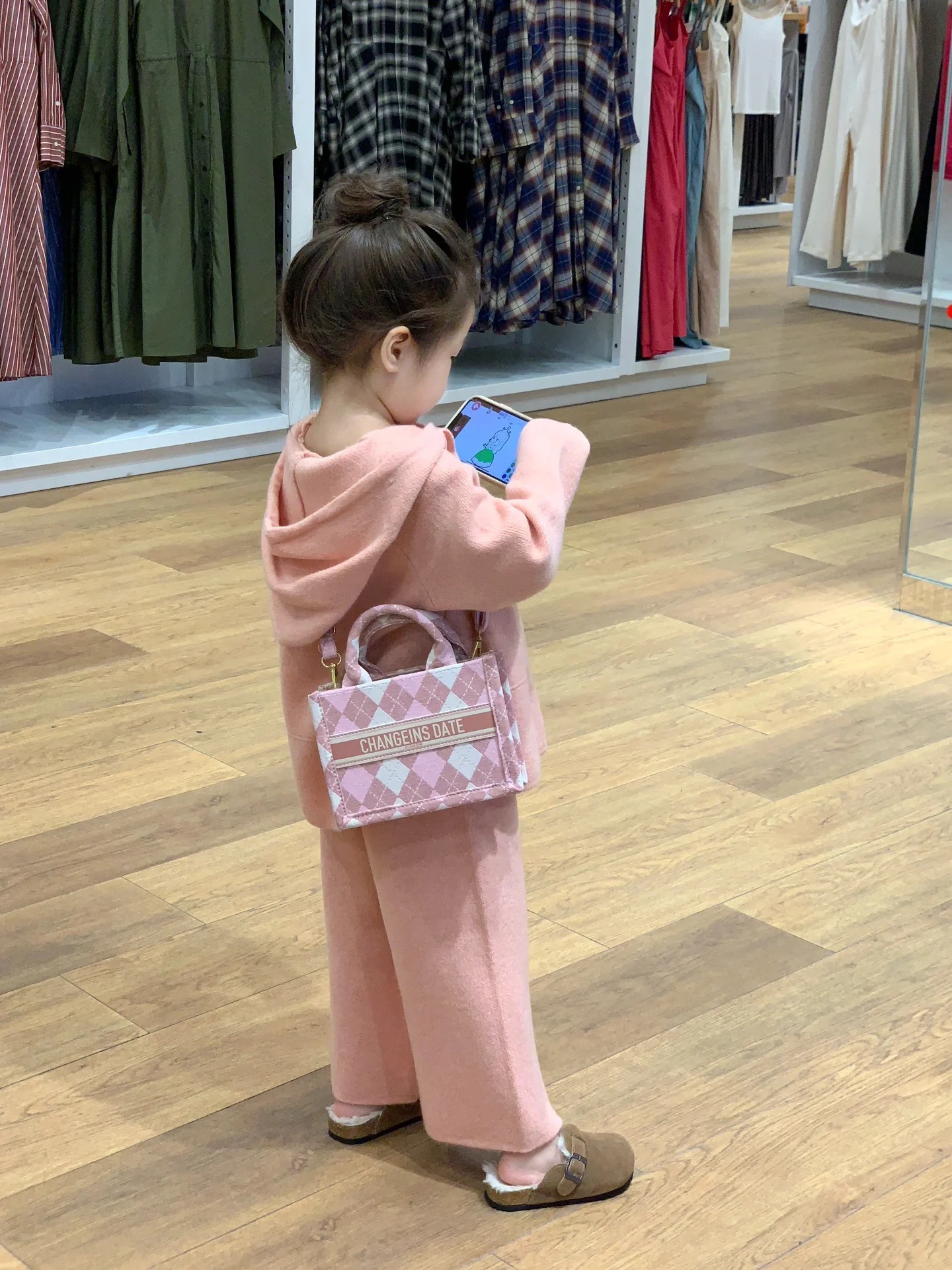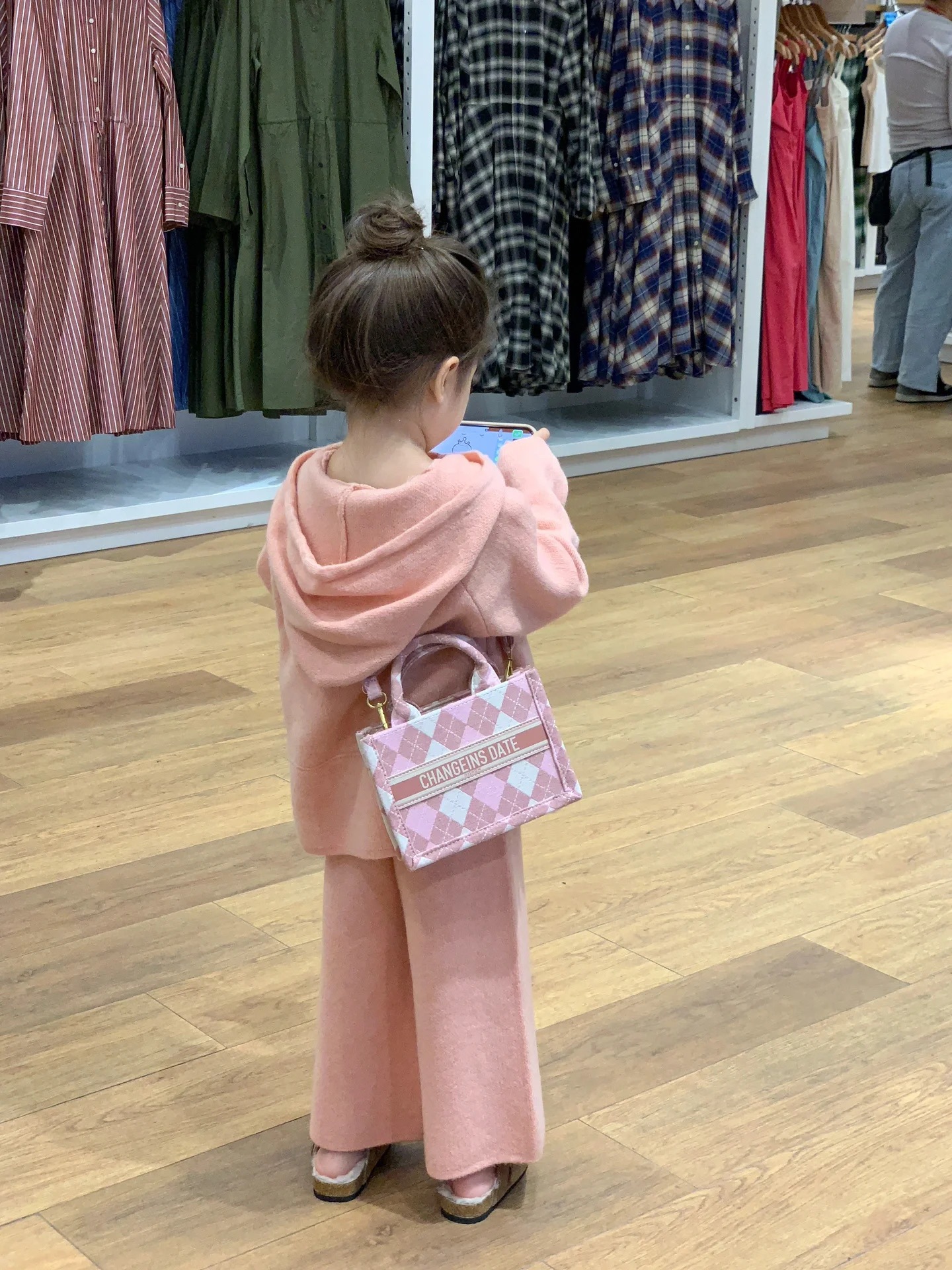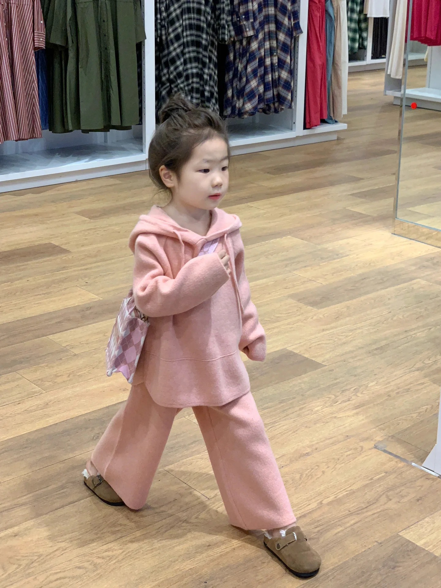 2024 봄 소녀의 한국 스타일 파우더 캐주얼 루즈 후드 니트 탑 와이드 다리 바지 양모 투피스 세트스토어 가기