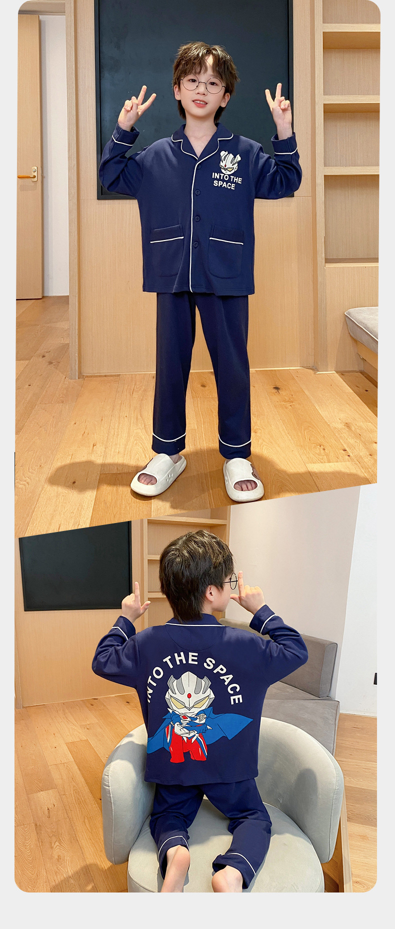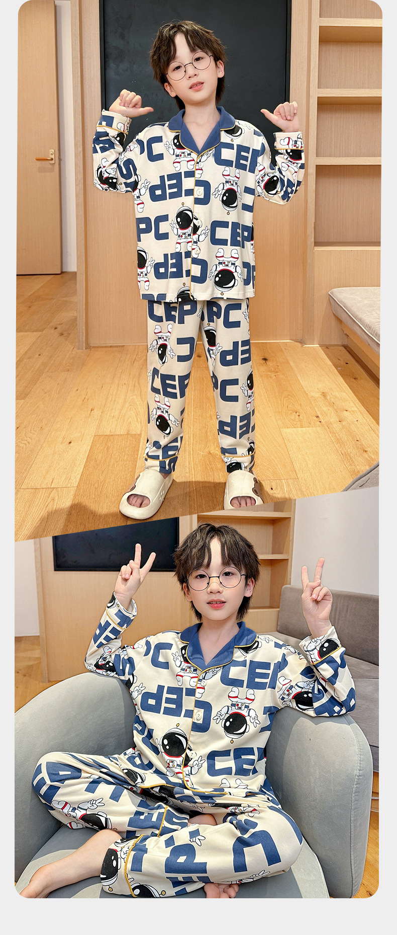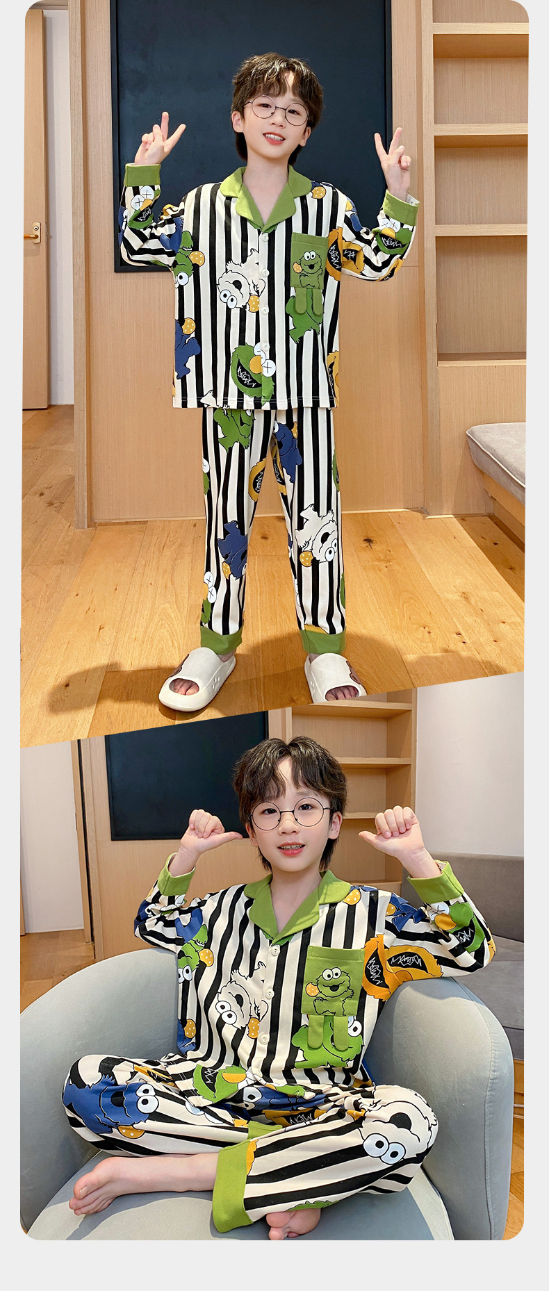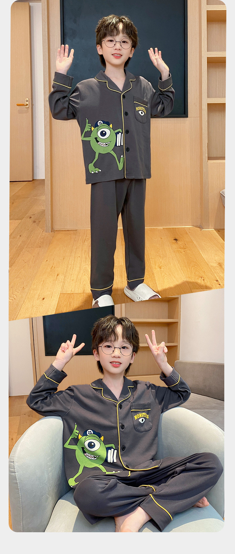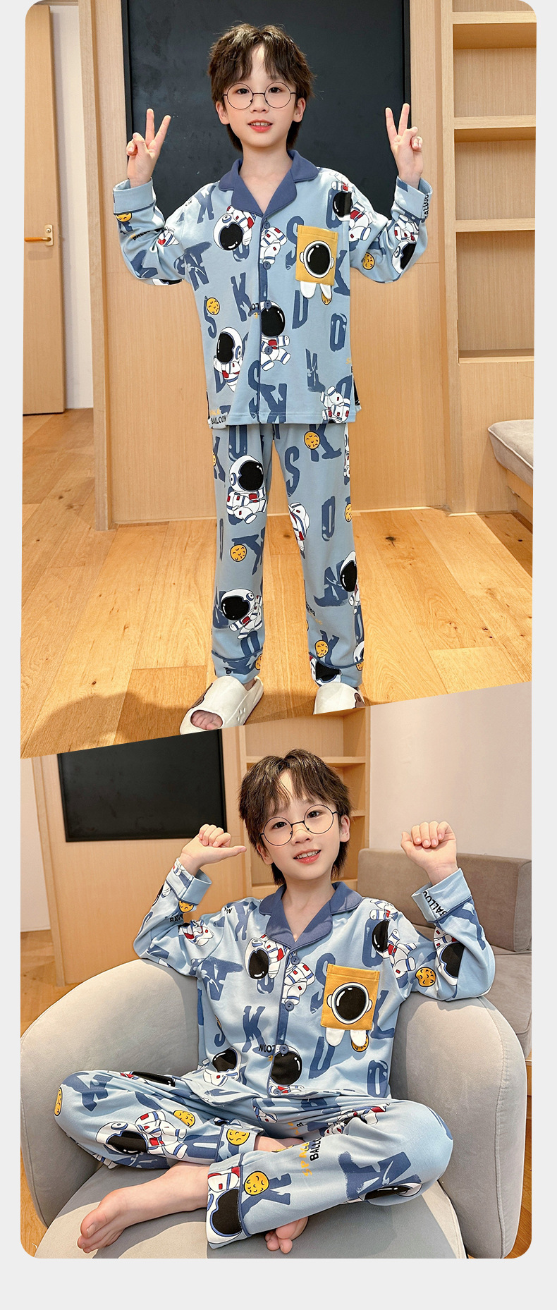 코튼 긴팔 봄 2024 어린이 잠옷 소년 인기 한국 만화 매체 및 큰 어린이 옷깃 소년