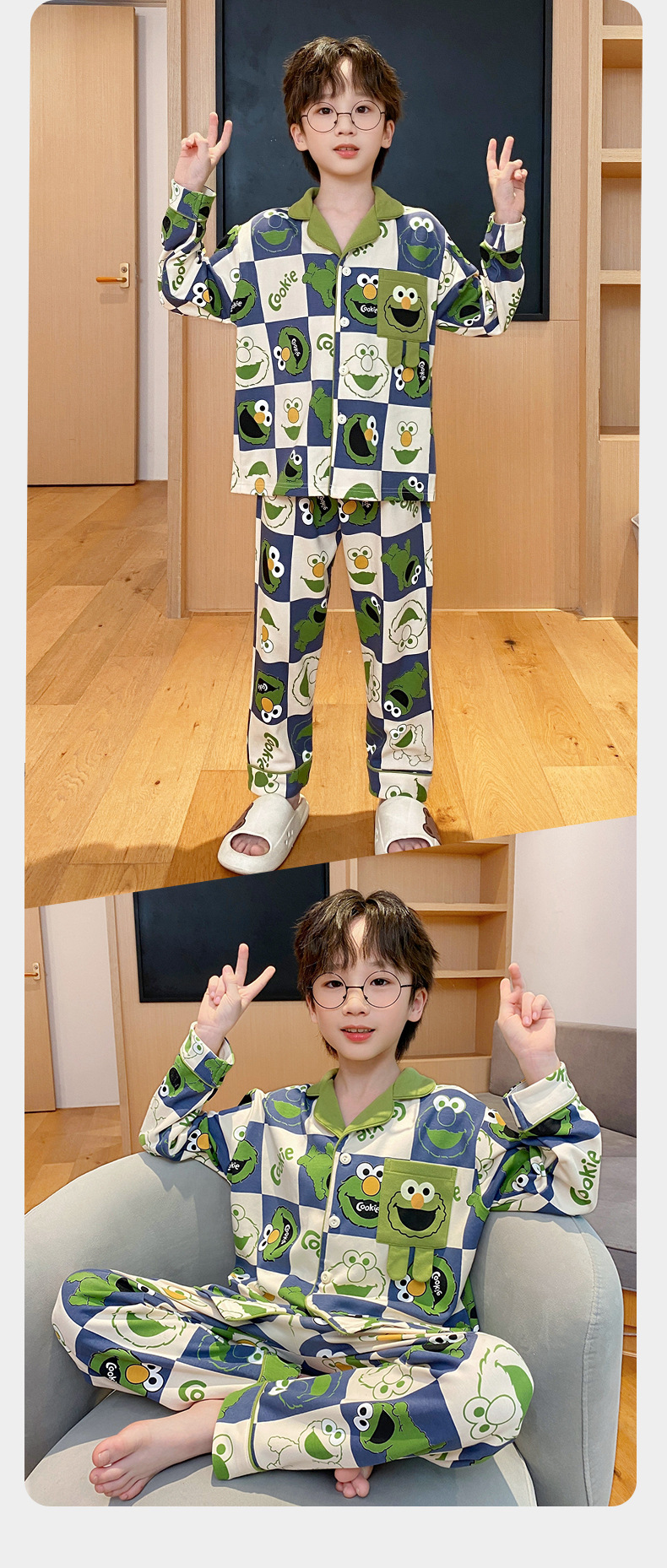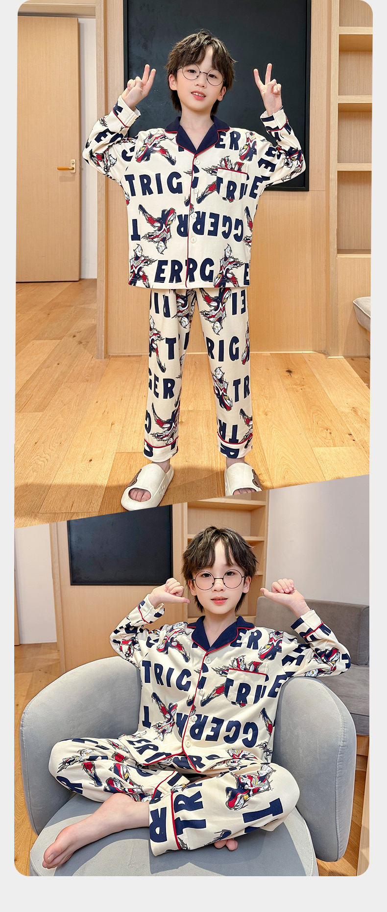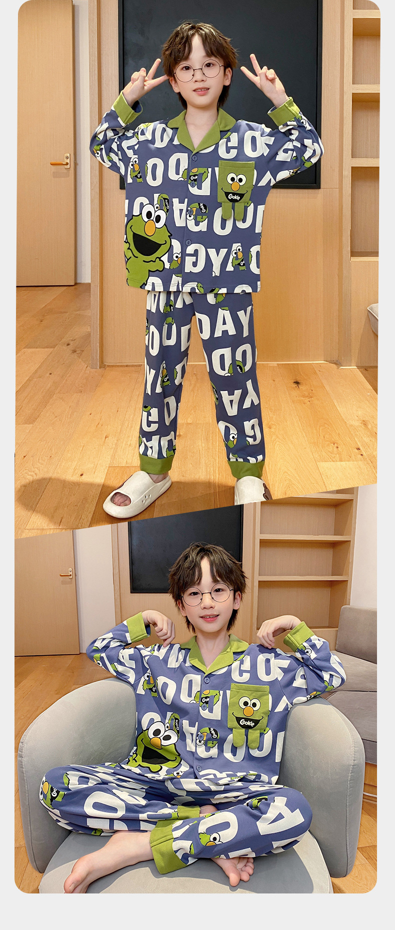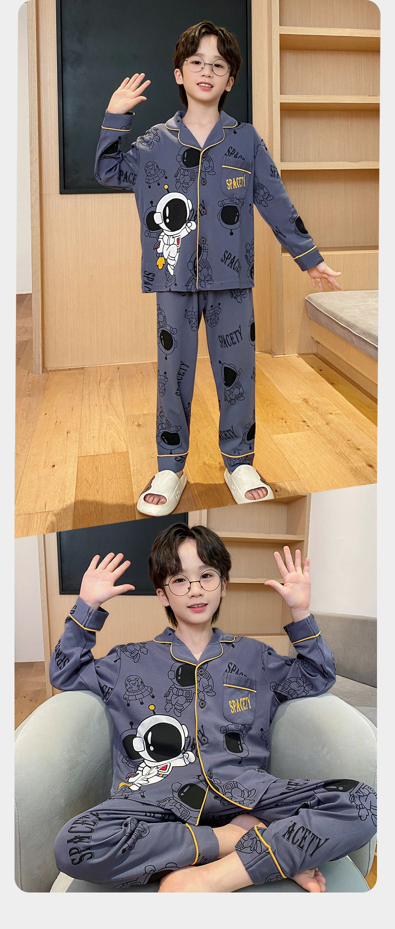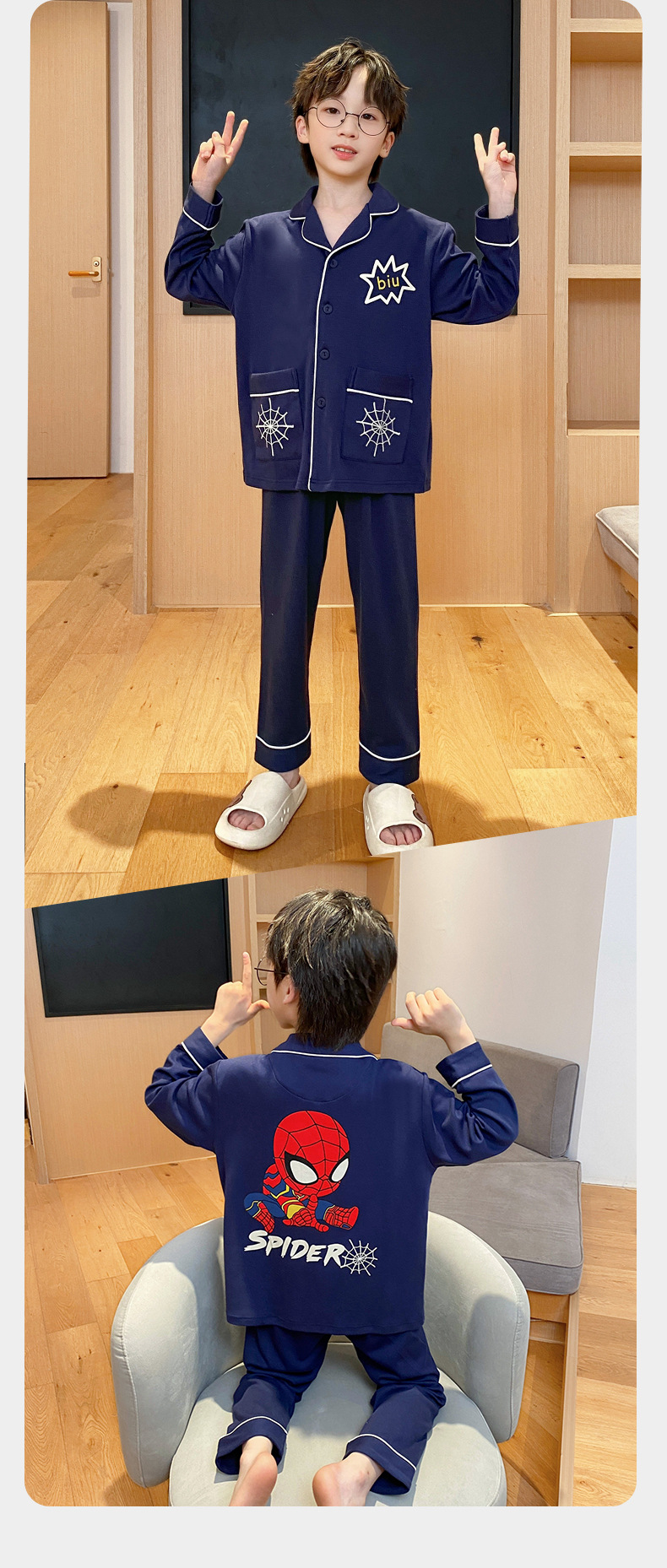 코튼 긴팔 봄 2024 어린이 잠옷 소년 인기 한국 만화 매체 및 큰 어린이 옷깃 소년