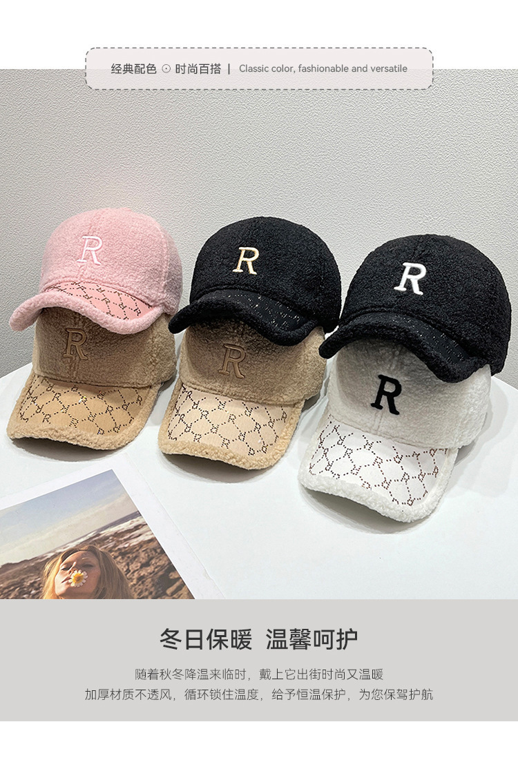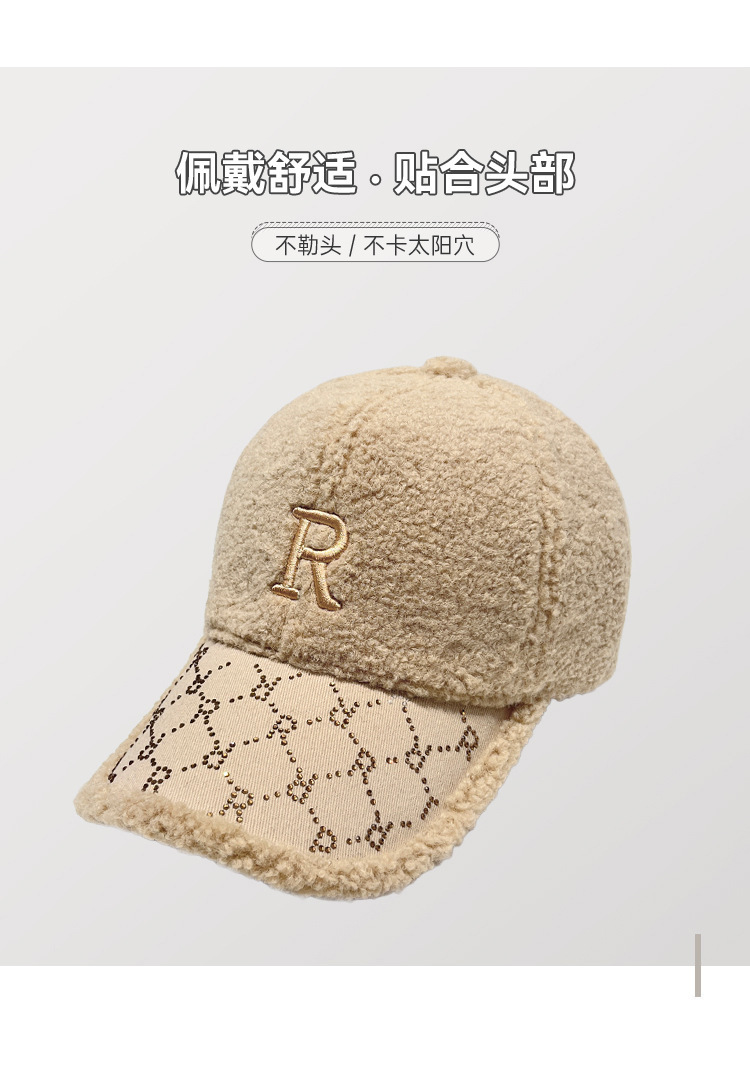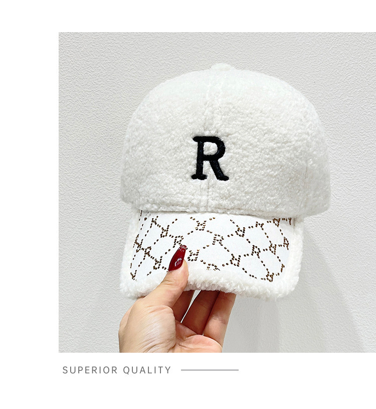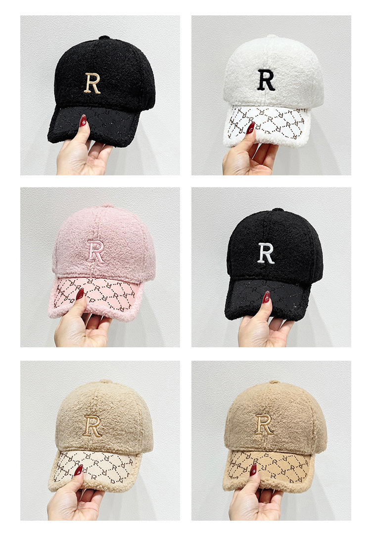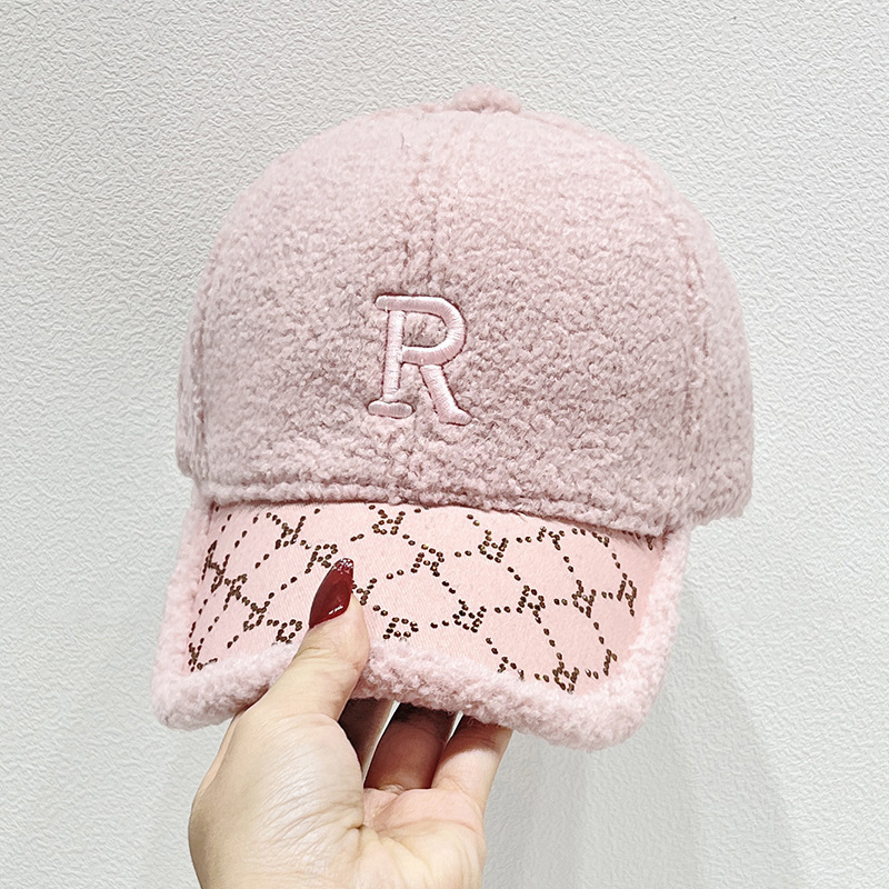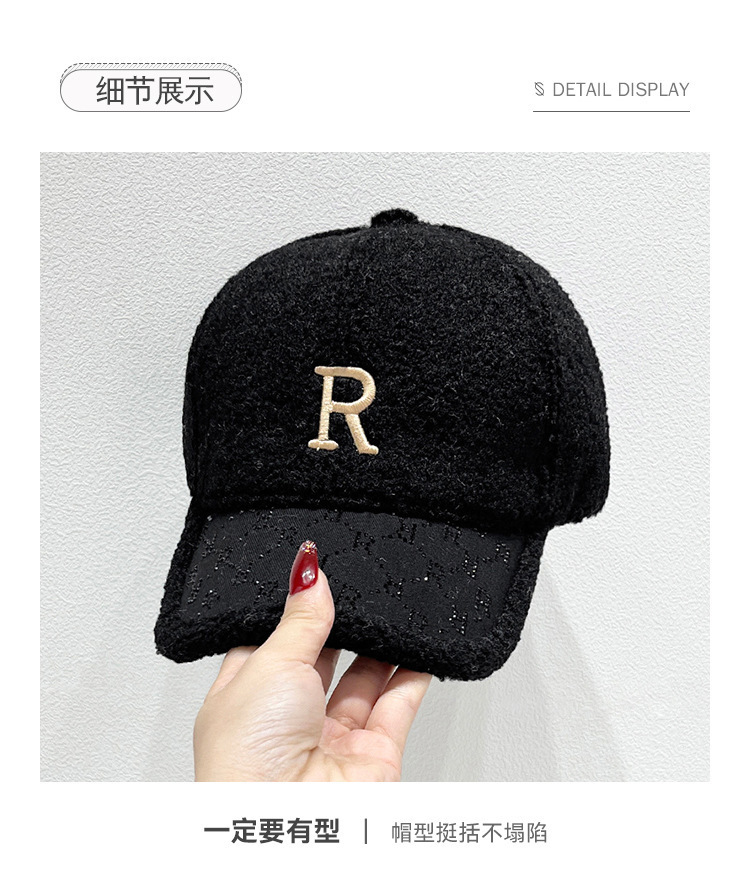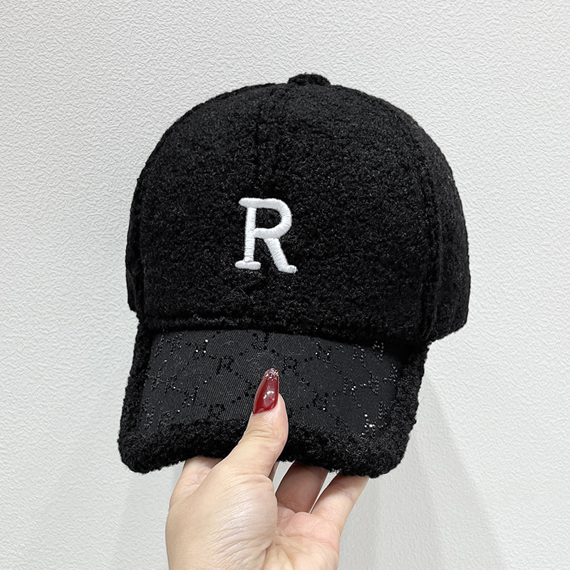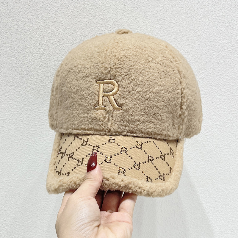 여자를위한 Yiyi 한국 트렌디 한 멋진 R 편지 lambswool 야구 모자 새로운 가을과 겨울 따뜻한 모조 다이아몬드 최고점 모자스토어 가기