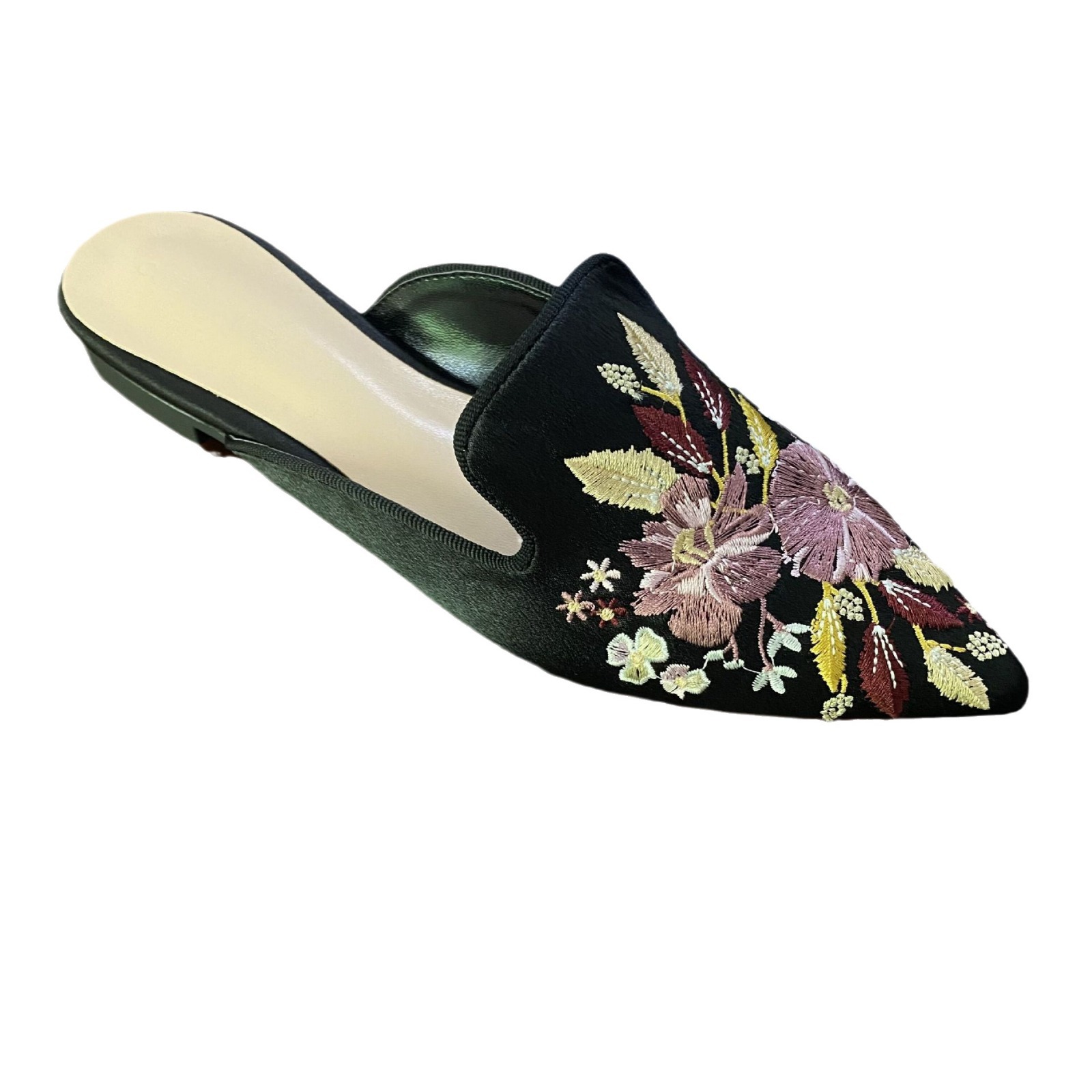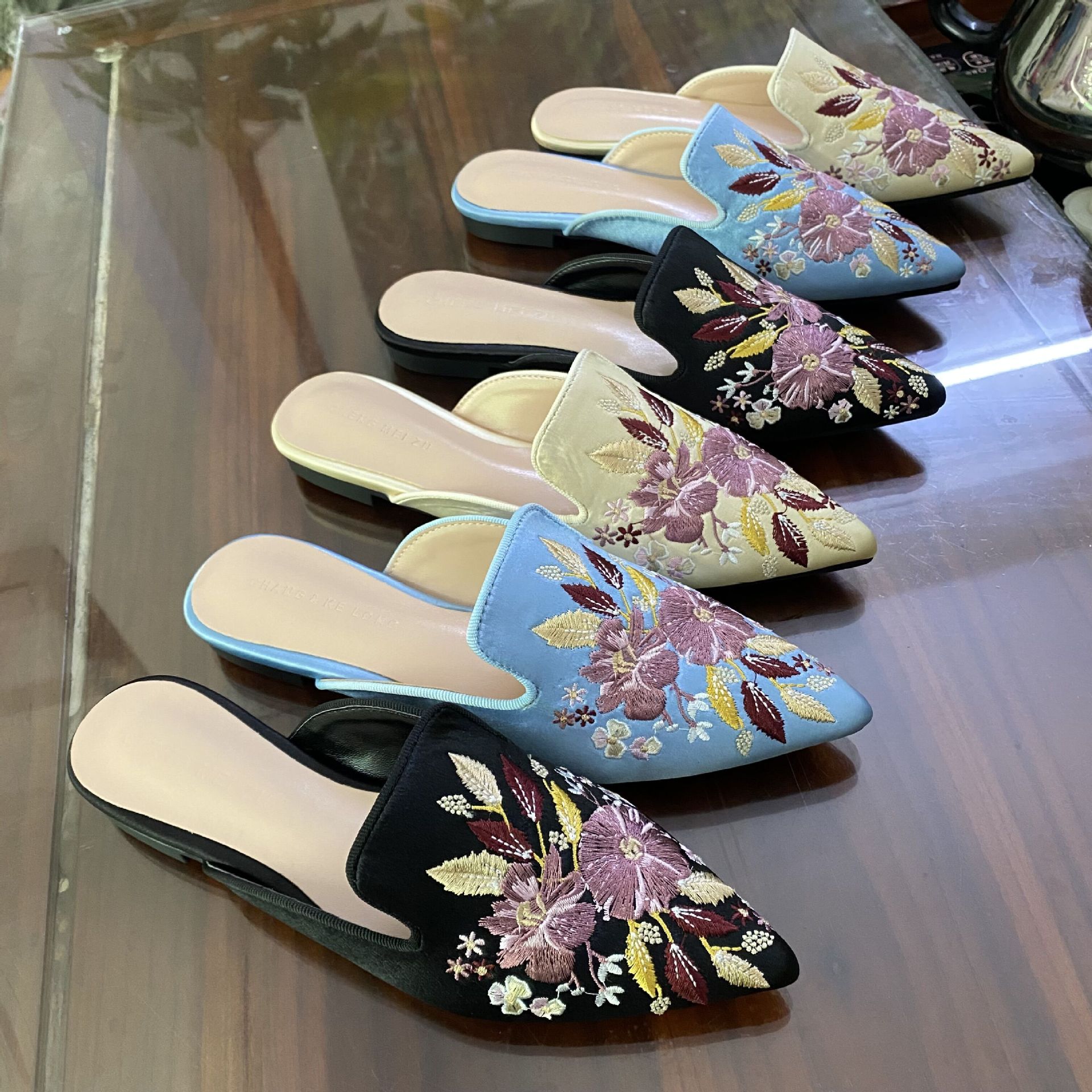 청메이 발 미끄럼 방지 여성 신발 자수 꽃 플랫 포인팅 뮬러 슬리퍼 바오터우 외부 신발 빈티지 펌프스토어 가기