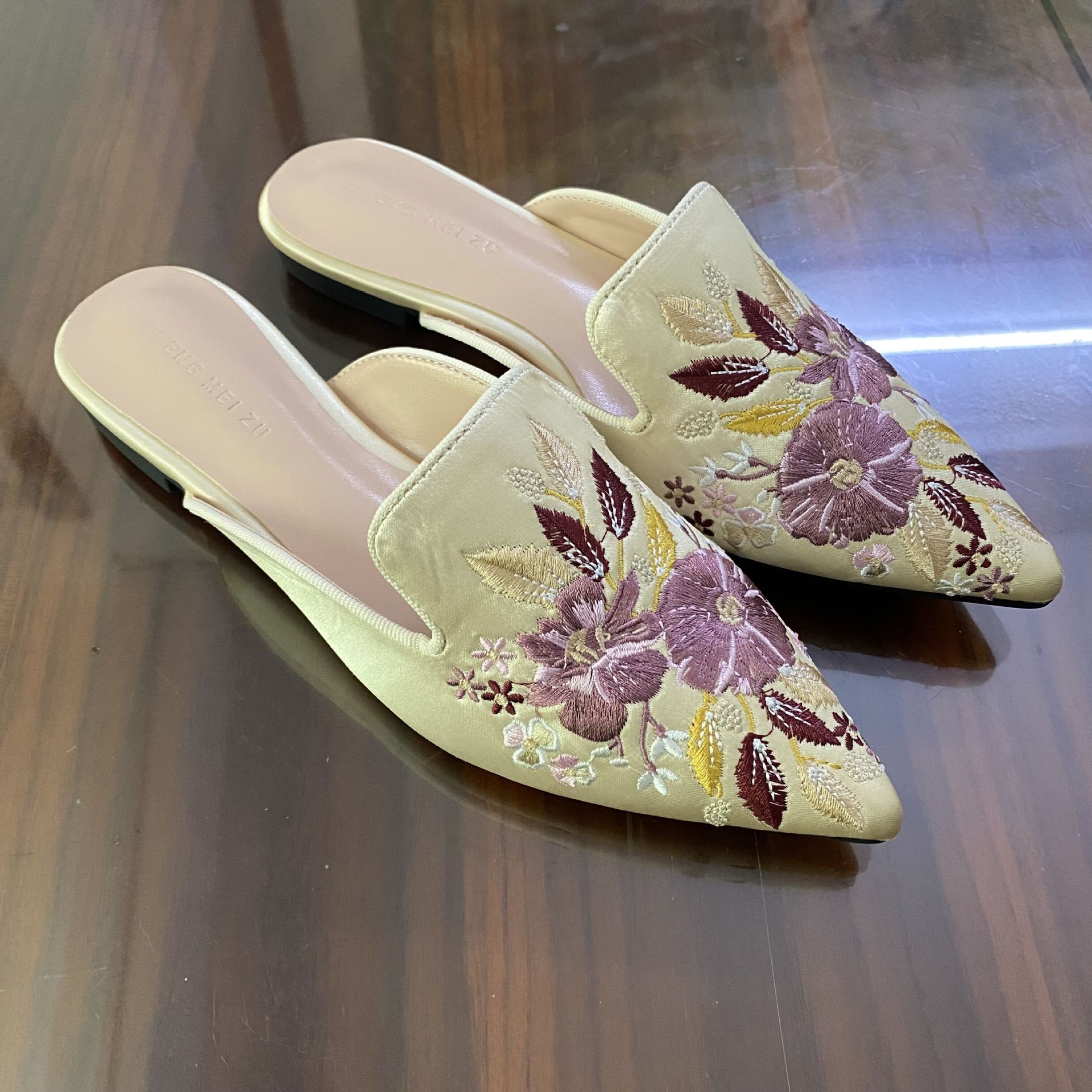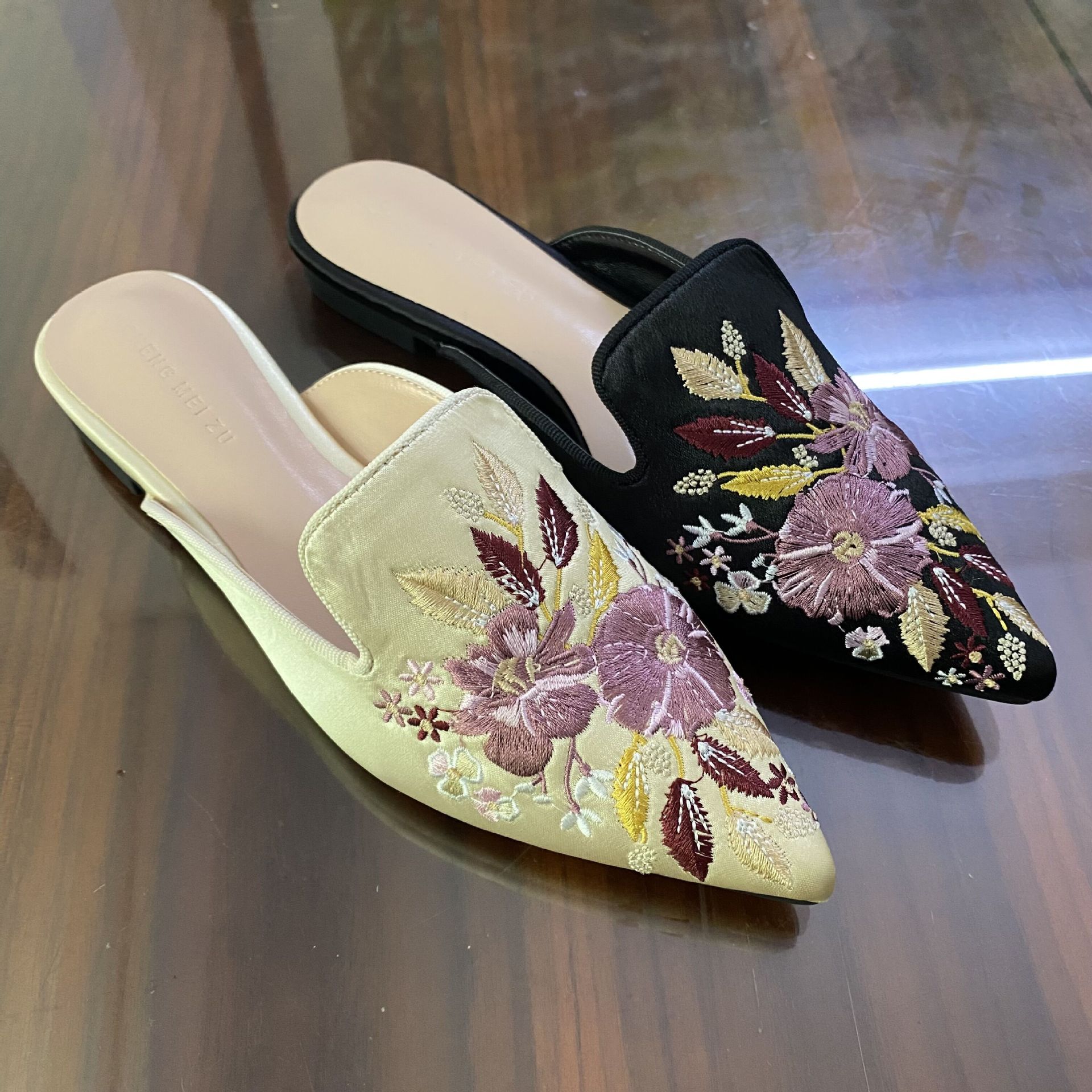 청메이 발 미끄럼 방지 여성 신발 자수 꽃 플랫 포인팅 뮬러 슬리퍼 바오터우 외부 신발 빈티지 펌프