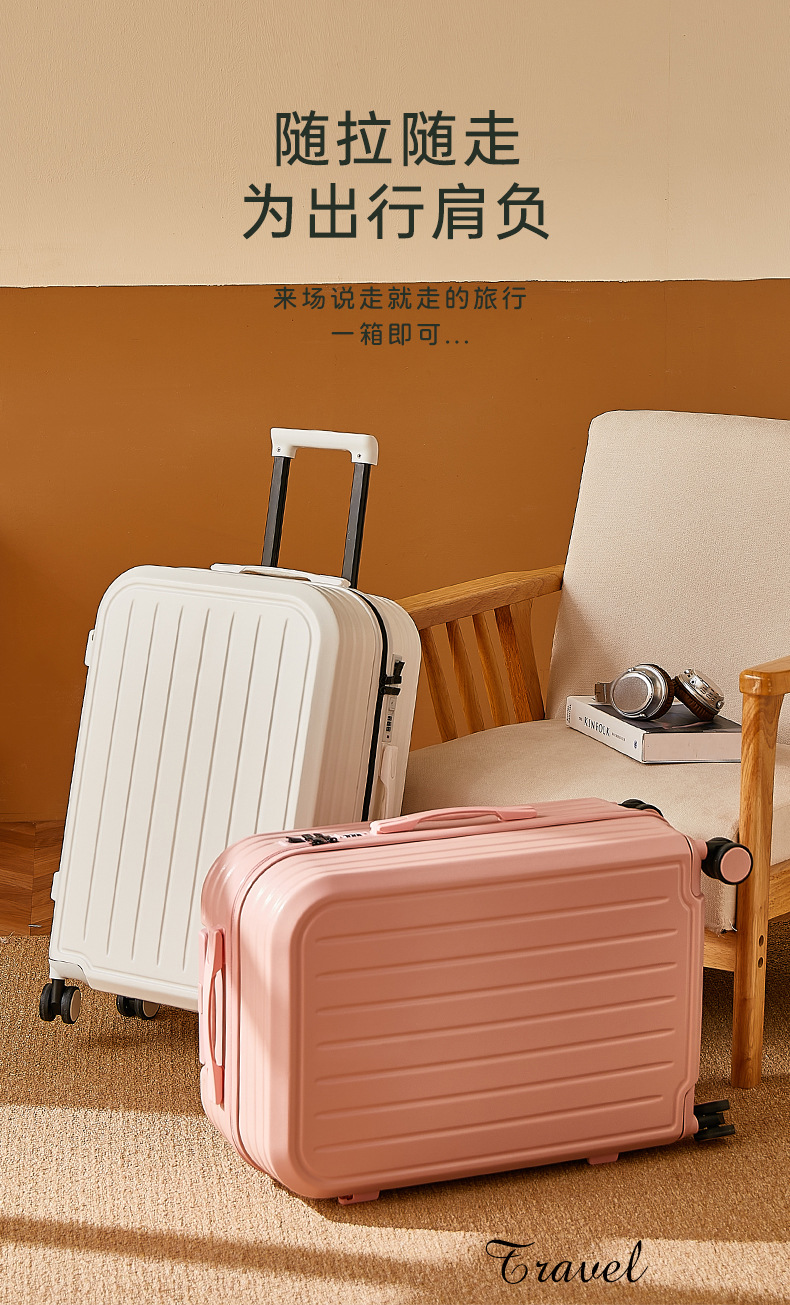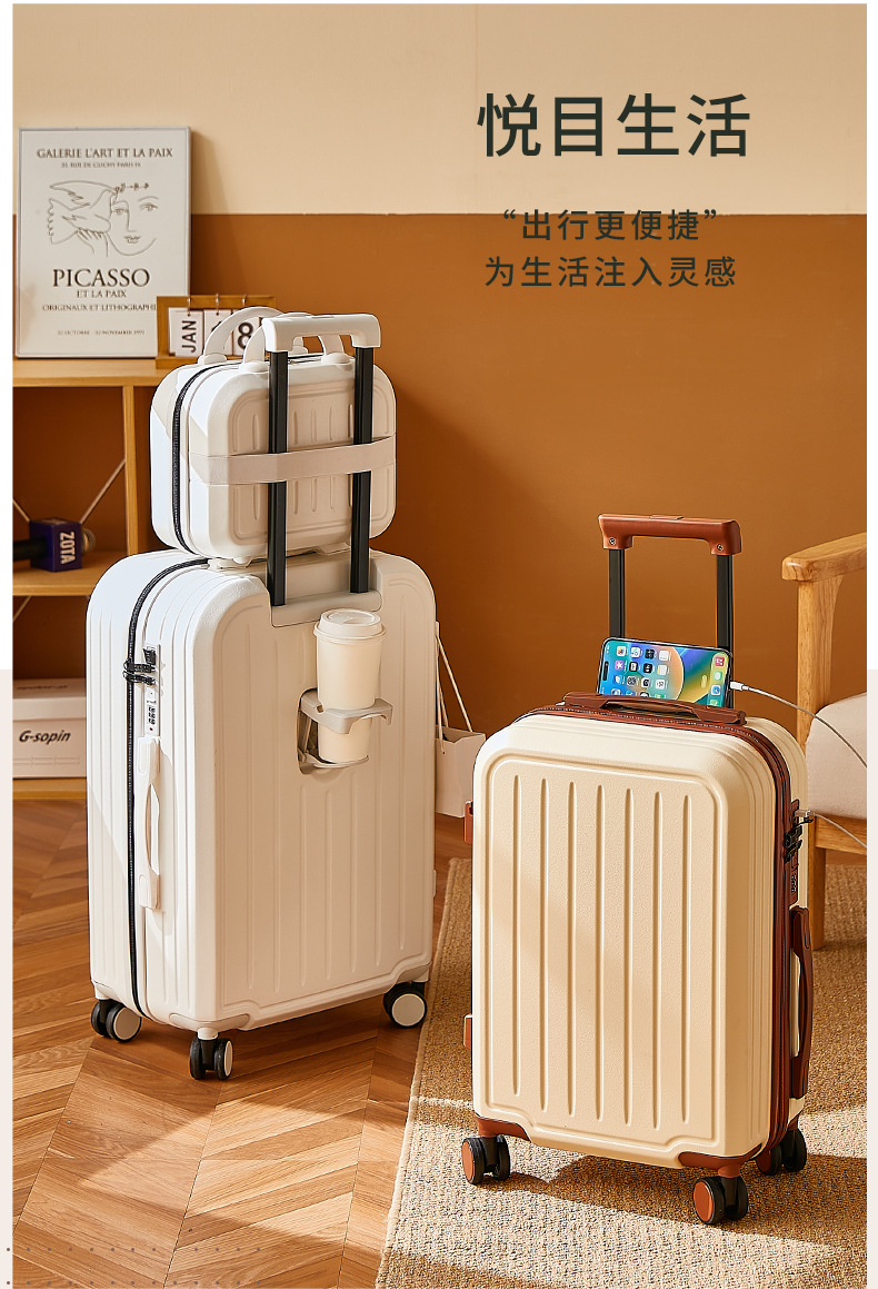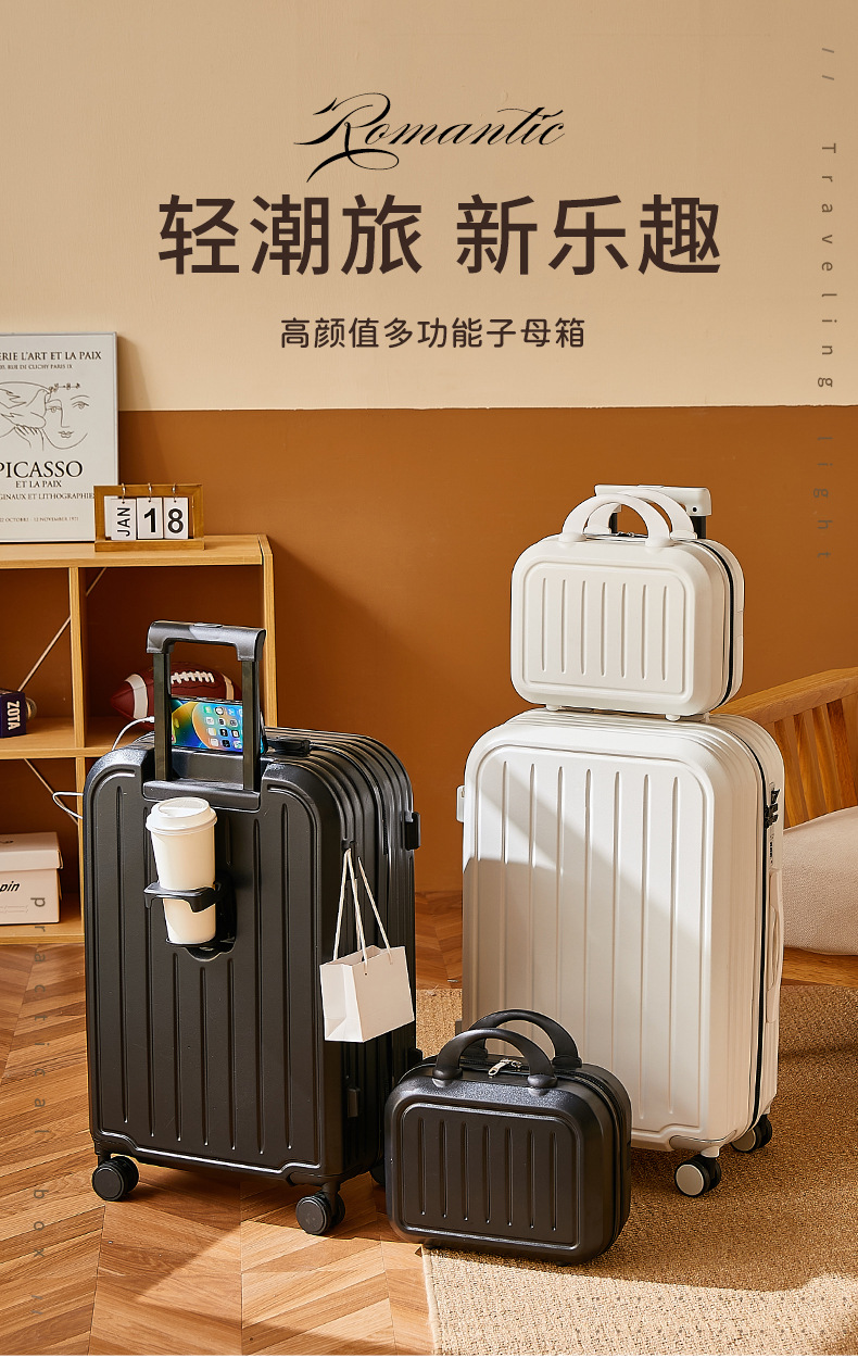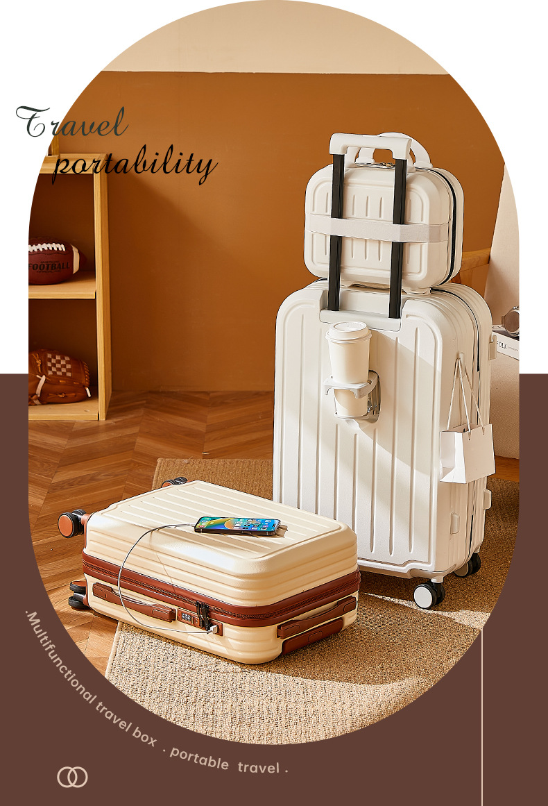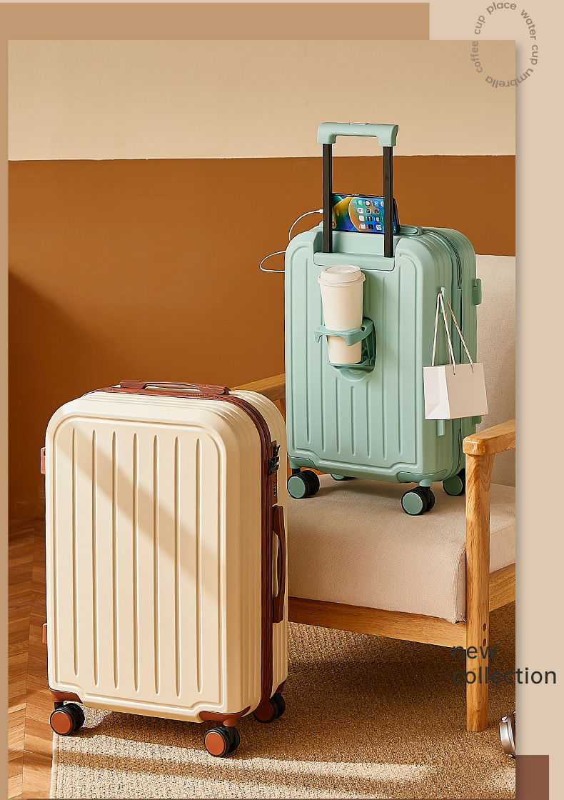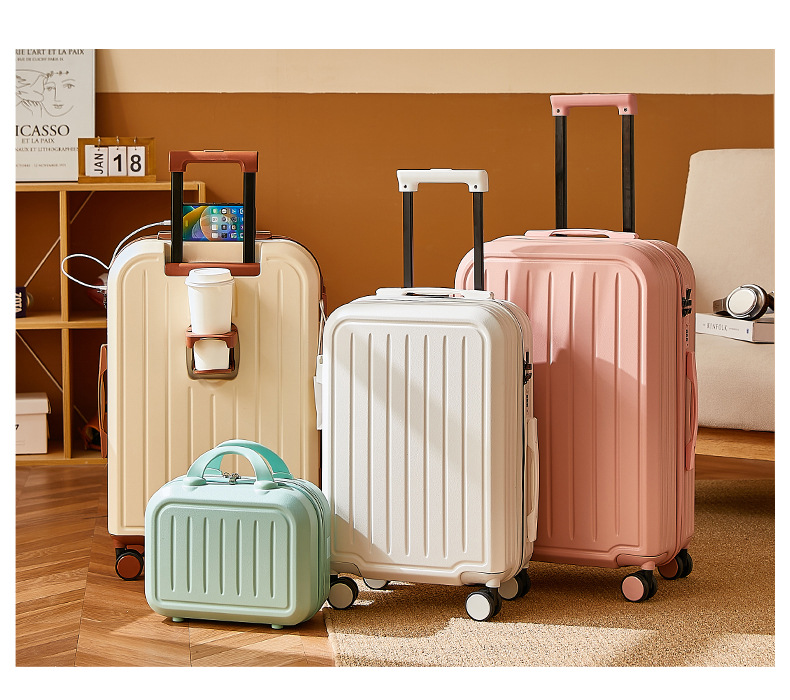 컵 홀더 대용량 수하물 트롤리 케이스 여성의 높은 색상 값 다기능 휴대용 라이트 톤 휠 탑승 가방스토어 가기