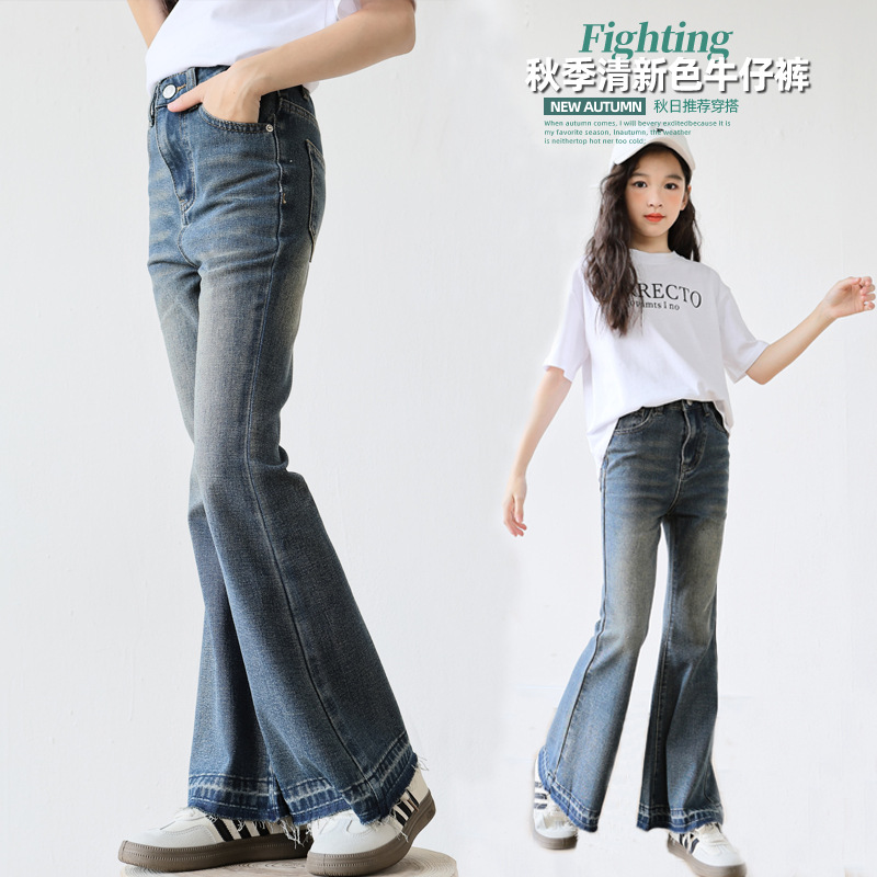 소녀 복고풍 청바지 2024 봄과 가을 유행 복고풍 흰색 슬리밍 닳은 청바지 플레어 바지 인기