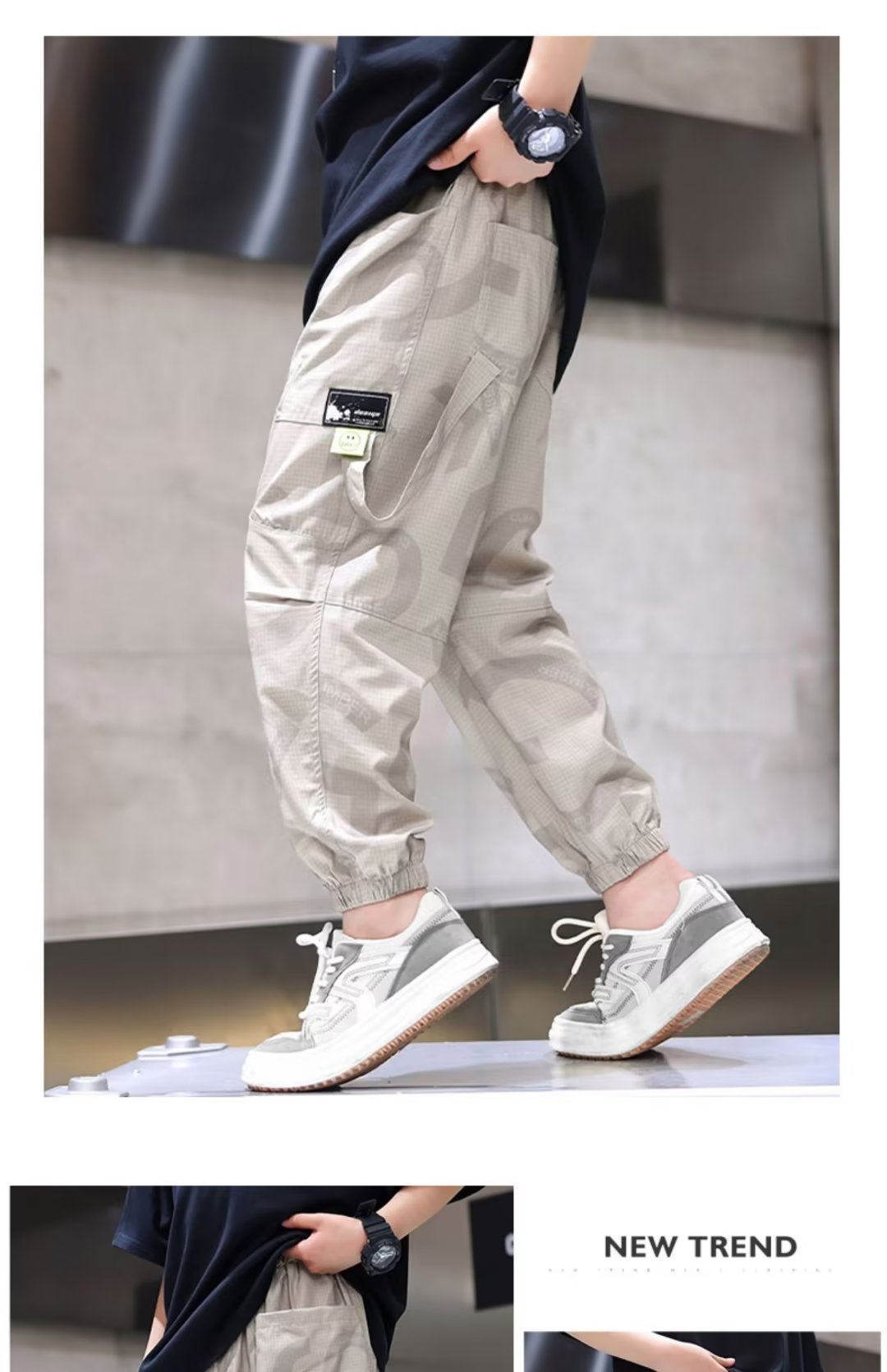 소년 바지 여름 얇은 2024 새로운 어린이 얼음 실크 빠른 건조 방지 모기 바지 큰 어린이 작업복 스포츠 바지 여름 착용