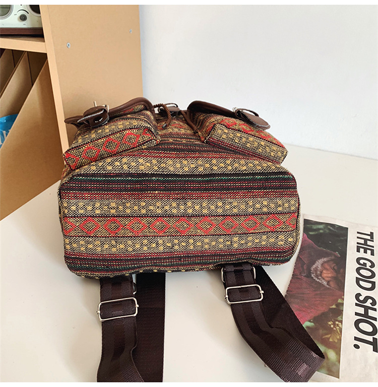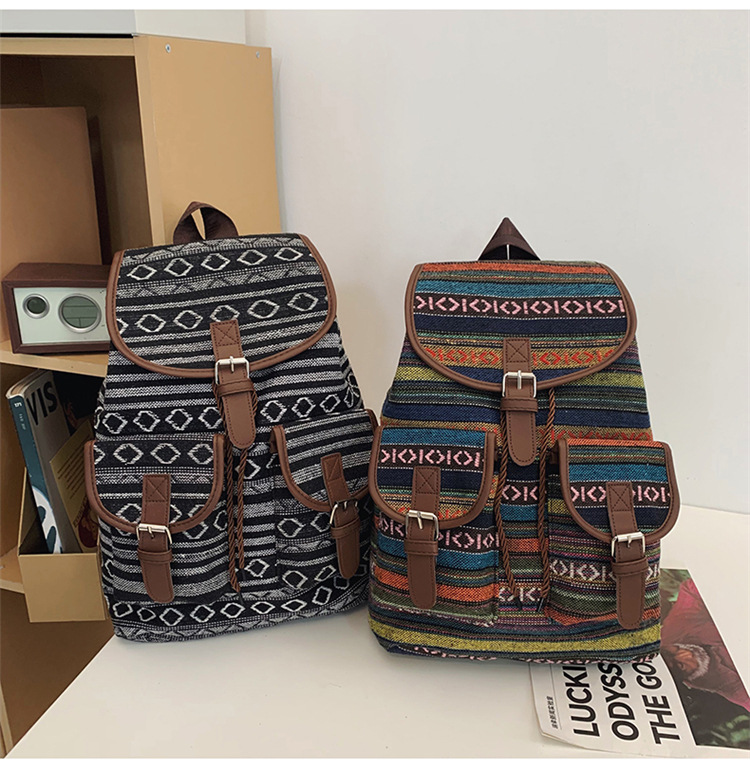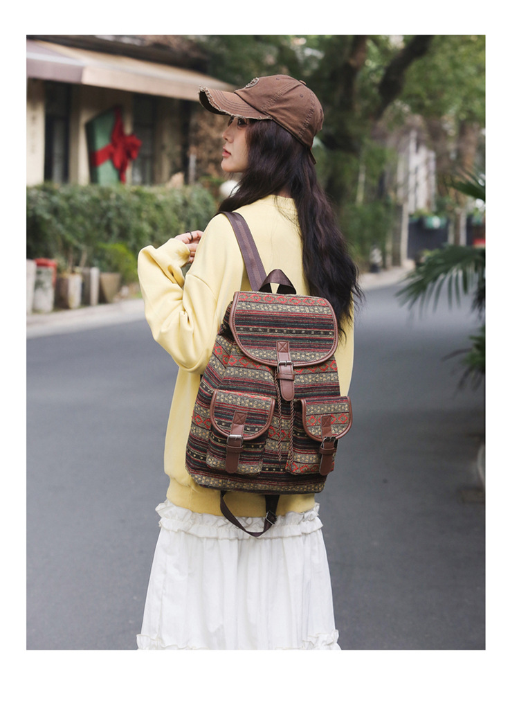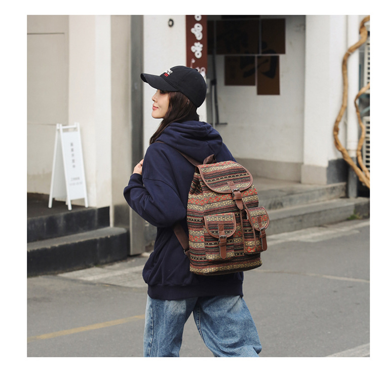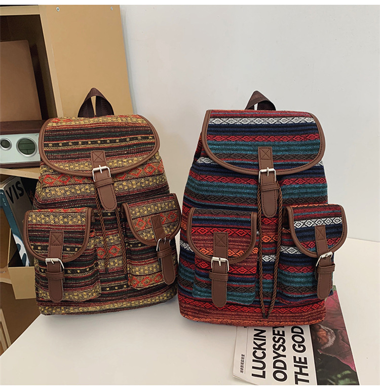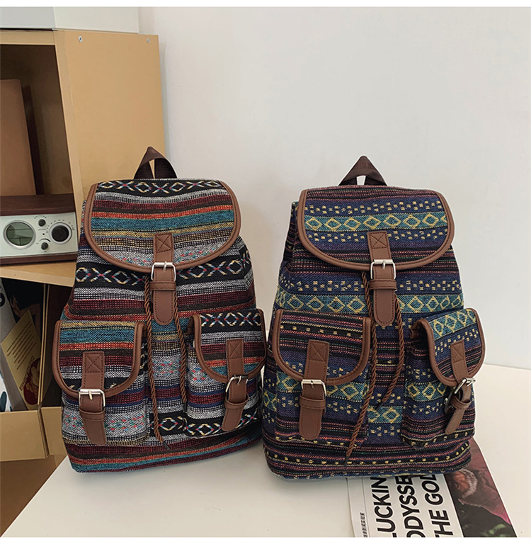 2025 새로운 민족 스타일 배낭 캐주얼 격자 무늬 Drawstring 레트로 여성 대용량 학교 가방 Drawstring 버킷 가방