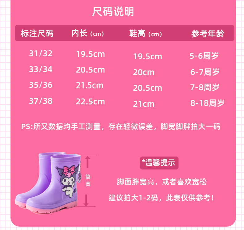 산리오 어린이 장화 kulomi 여자 유치원 아기 어린이 학생 비 부츠 가벼운 물 고무 신발 도매