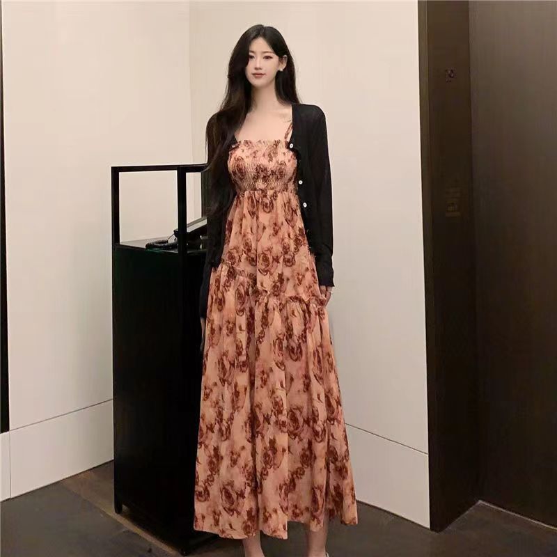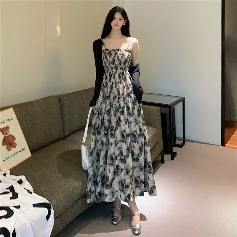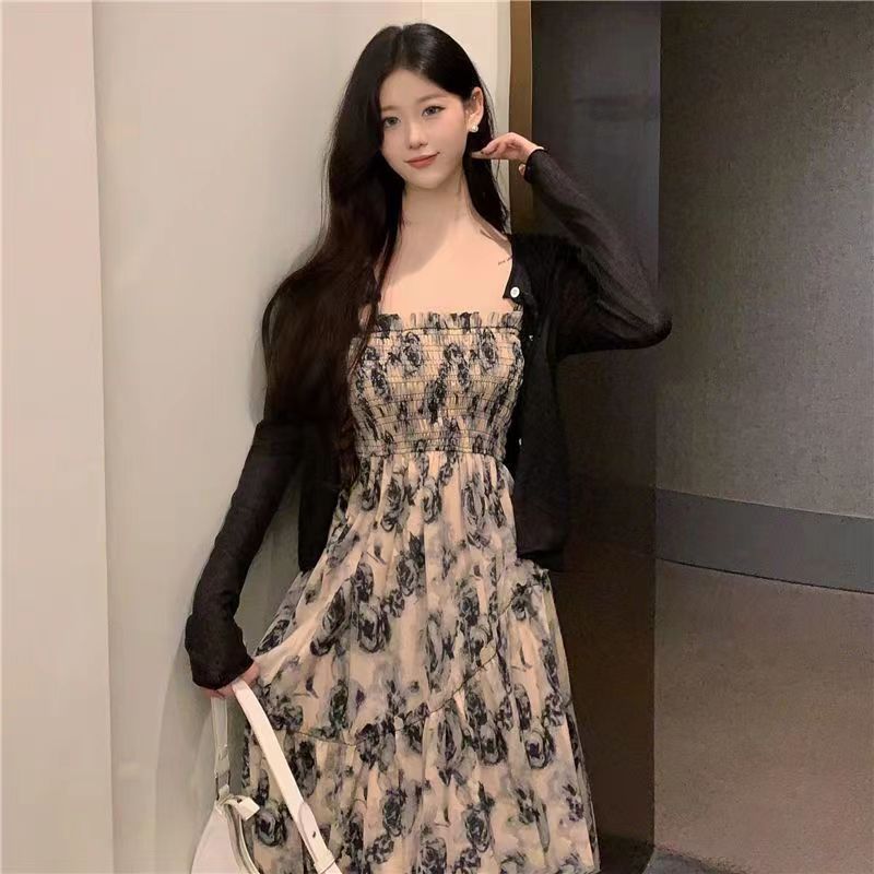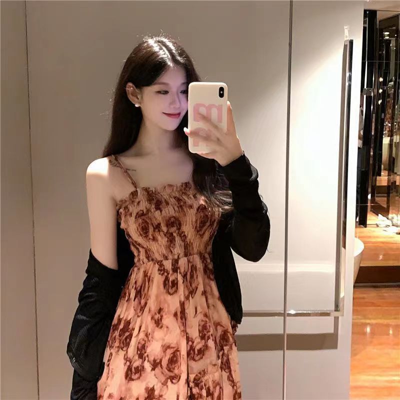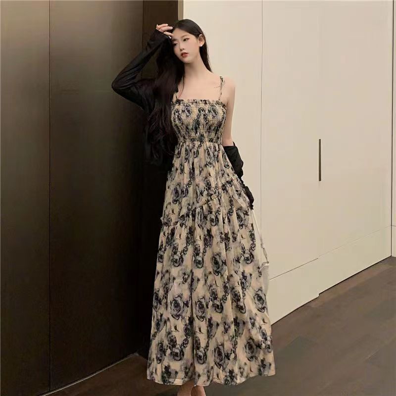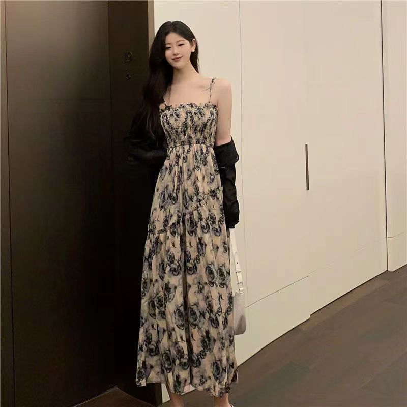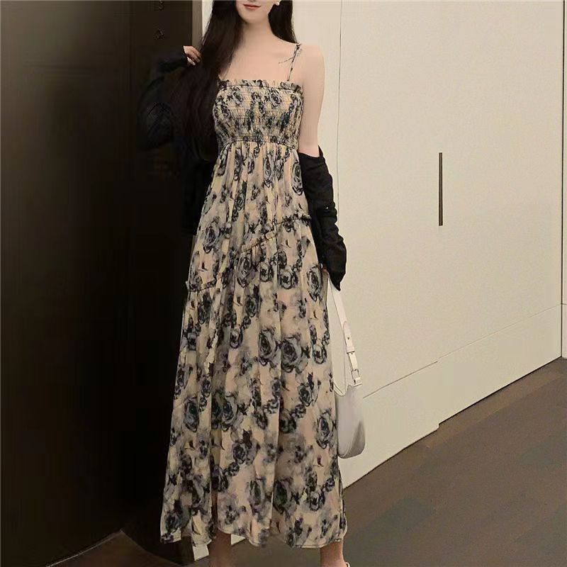 장미 꽃 Pleated Sling 원피스 여성의 2024 여름 새로운 프랑스 스타일 슬리밍 사교계 우아한 긴 원피스 타이트 허리스토어 가기